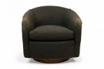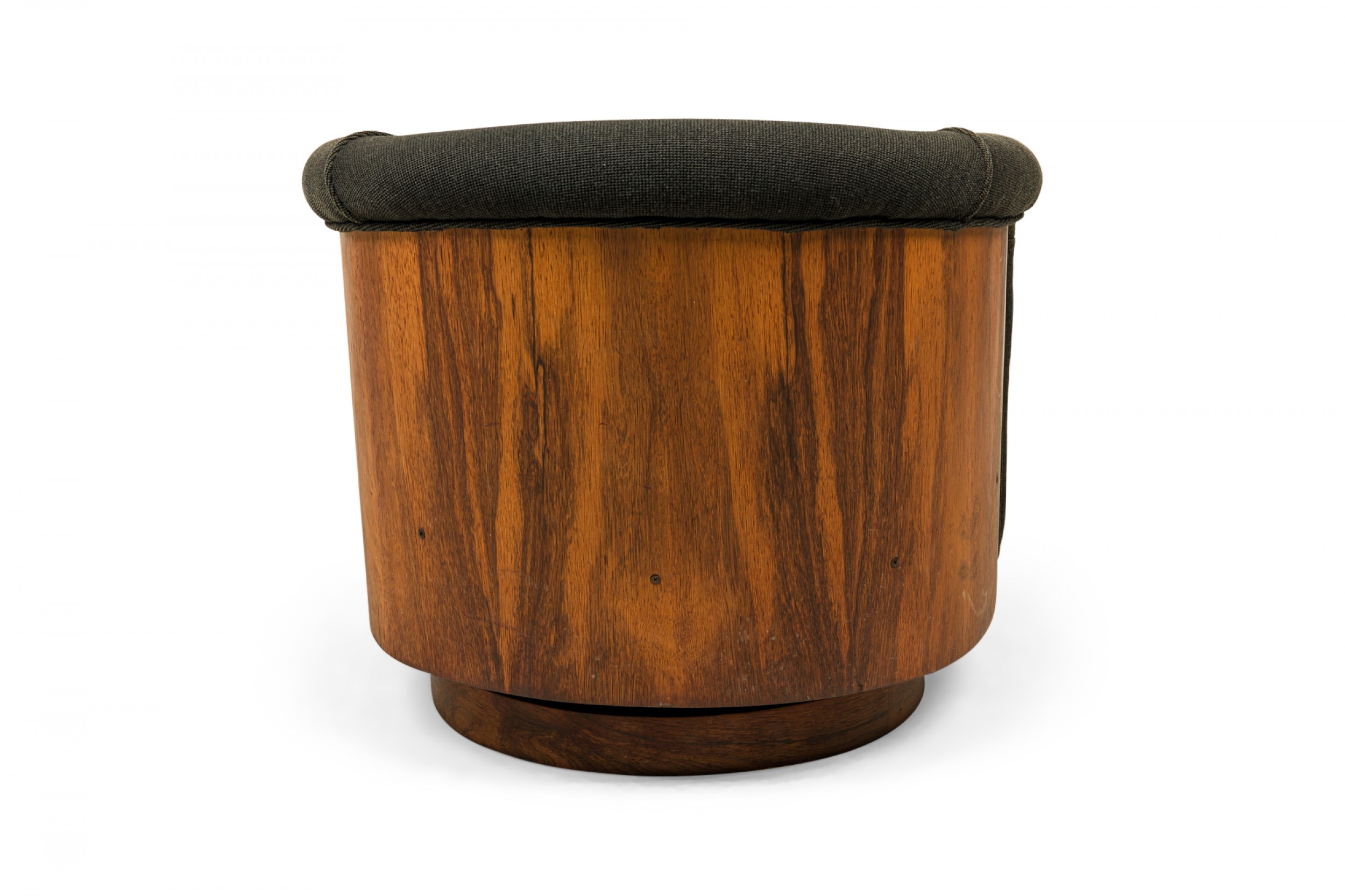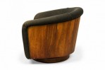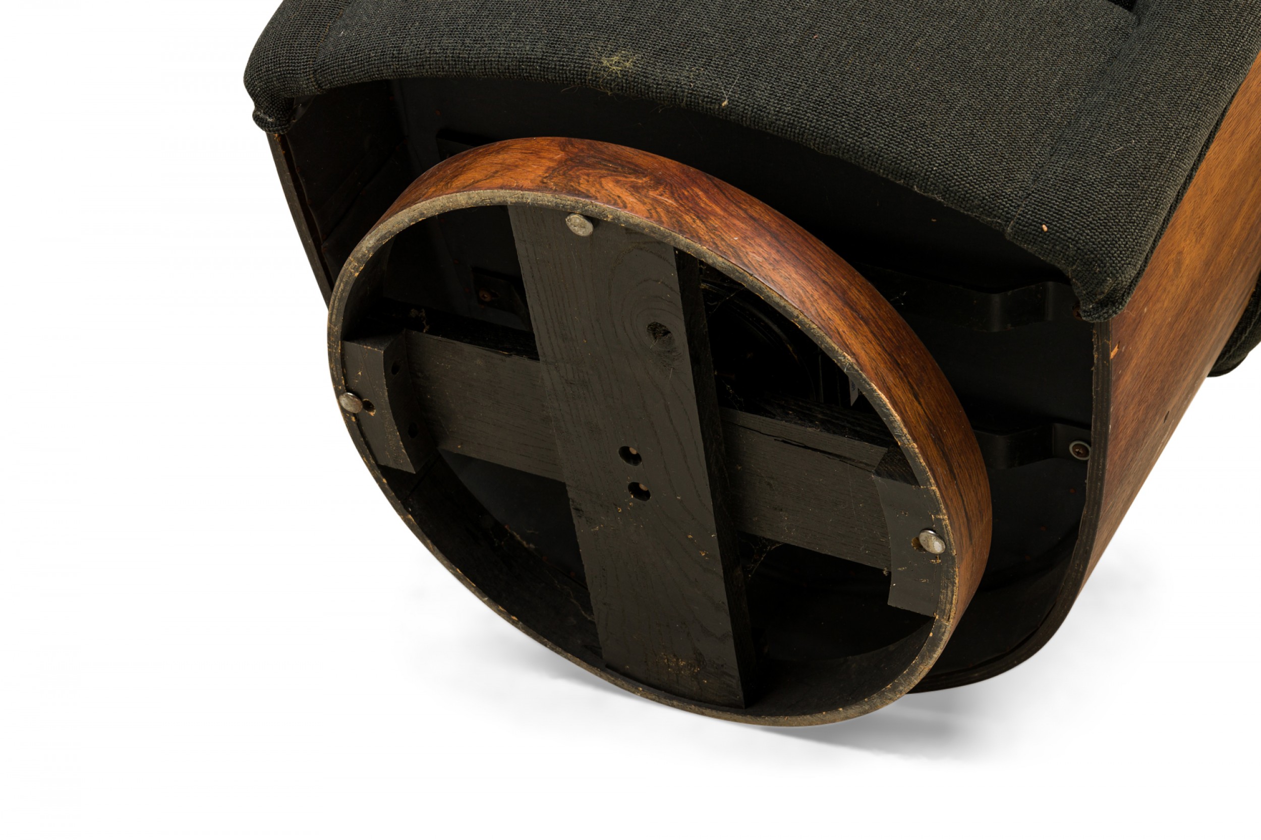 American Mid-Century horseshoe-form lounge / armchair with black textured fabric upholstery with removable seat cushion and a rosewood wrap around the back of the chair. (MILO BAUGHMAN FOR THAYER COGGIN)