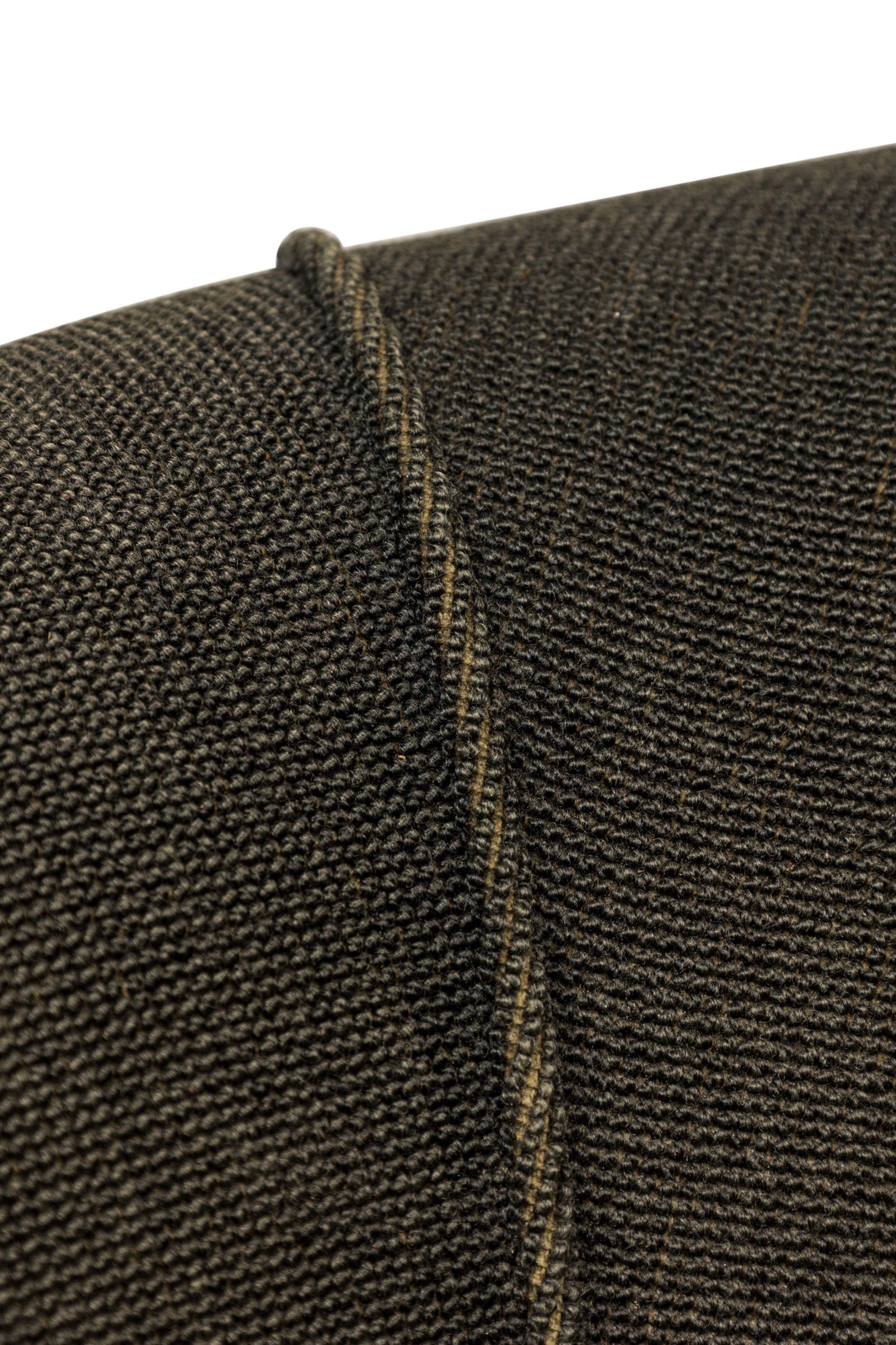 American Mid-Century horseshoe-form lounge / armchair with black textured fabric upholstery with removable seat cushion and a rosewood wrap around the back of the chair. (MILO BAUGHMAN FOR THAYER COGGIN).
