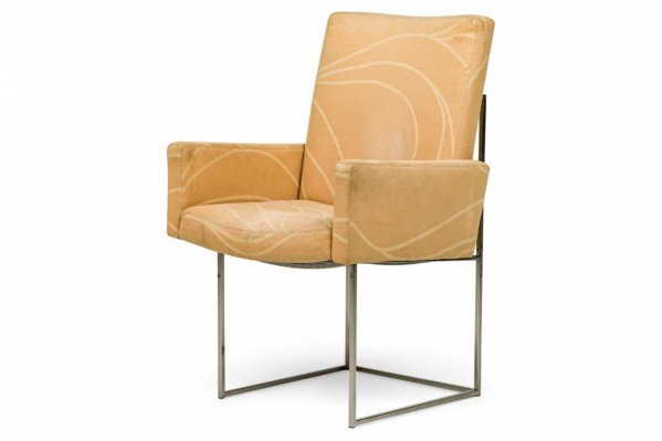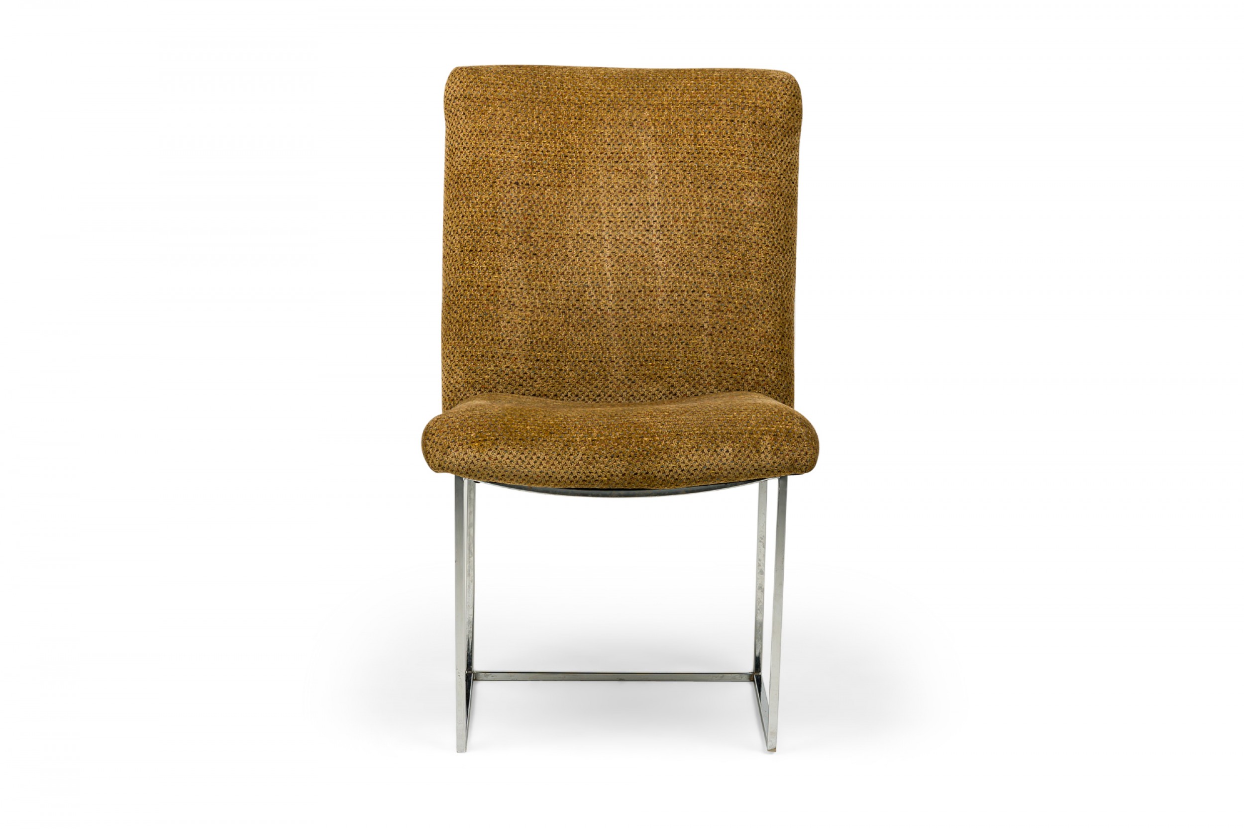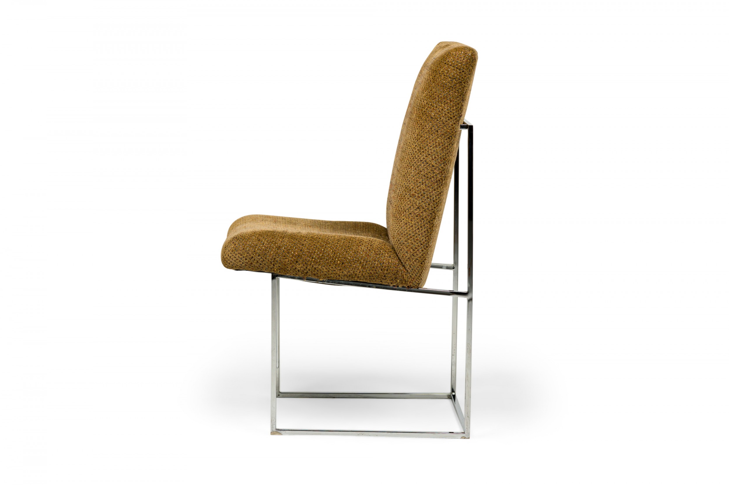 American Mid-Century 'Captain' dining side chair with a silver metal square tube frame and brown woven fabric upholstery with multi-colored accent thread. (MILO BAUGHMAN FOR THAYER COGGIN)(Other examples in different upholstery: DUF0798-DUF0801).