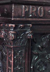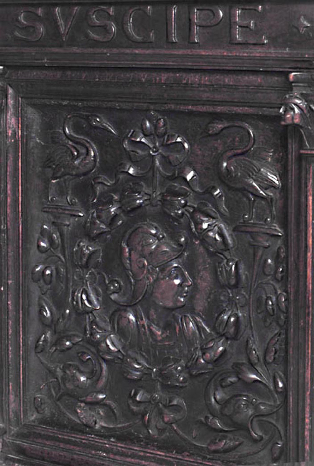 Italian Renaissance style (17th Cent) walnut carved cassone style floor trunk with column sides and Latin inscription