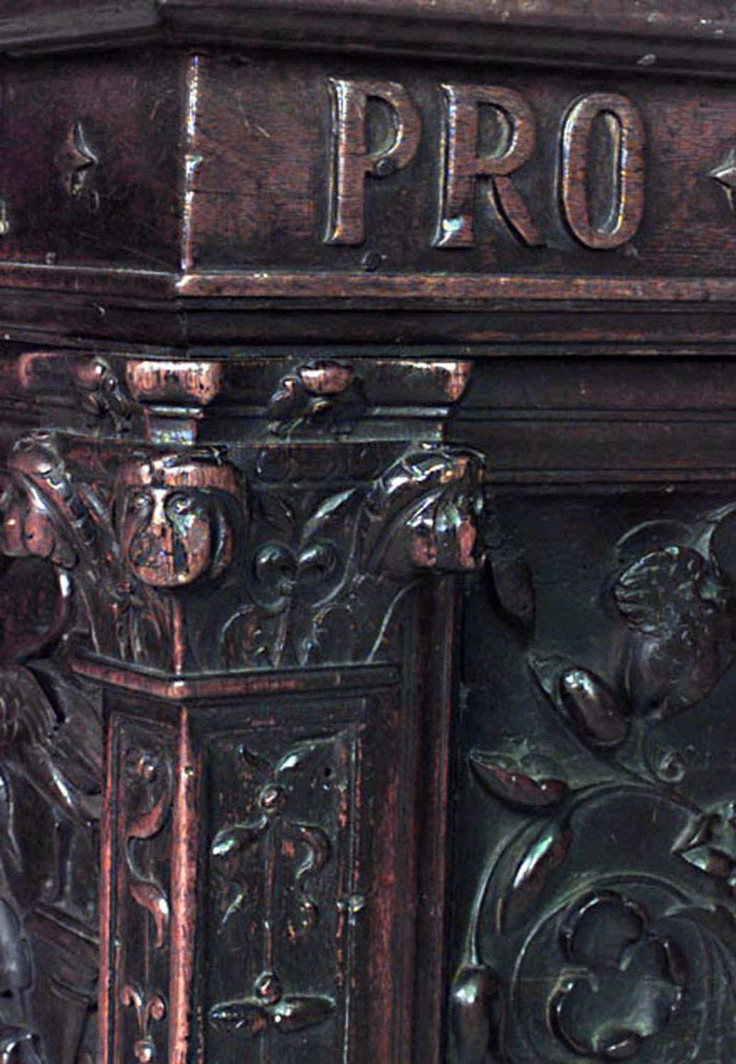 Italian Renaissance style (17th Cent) walnut carved cassone style floor trunk with column sides and Latin inscription.