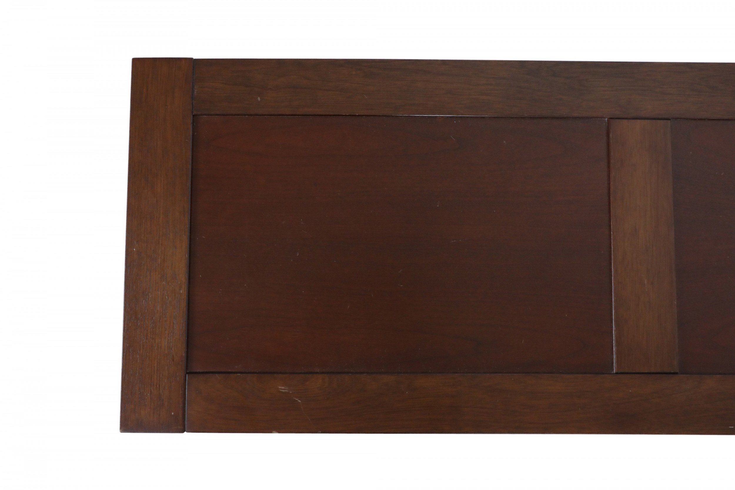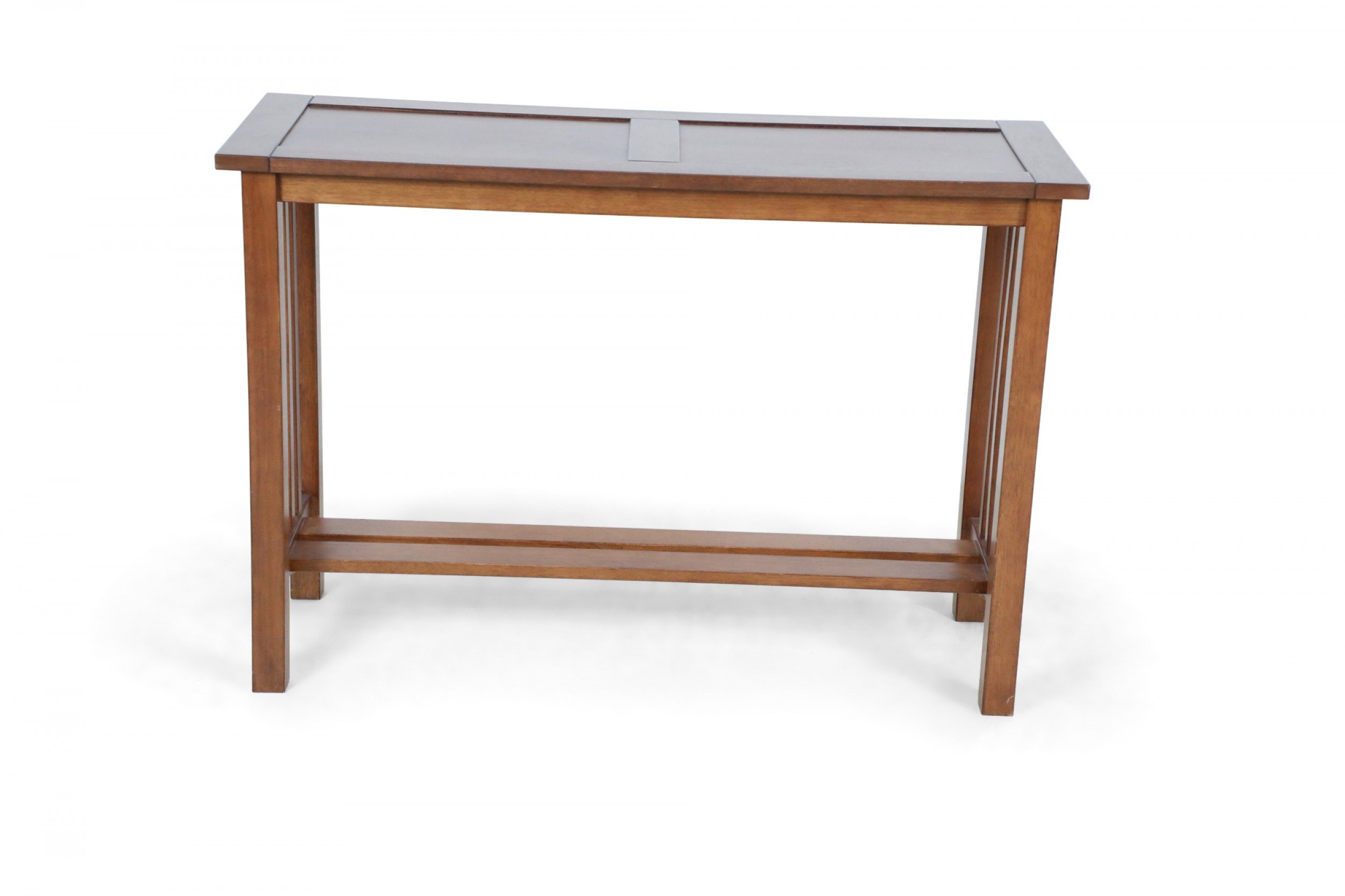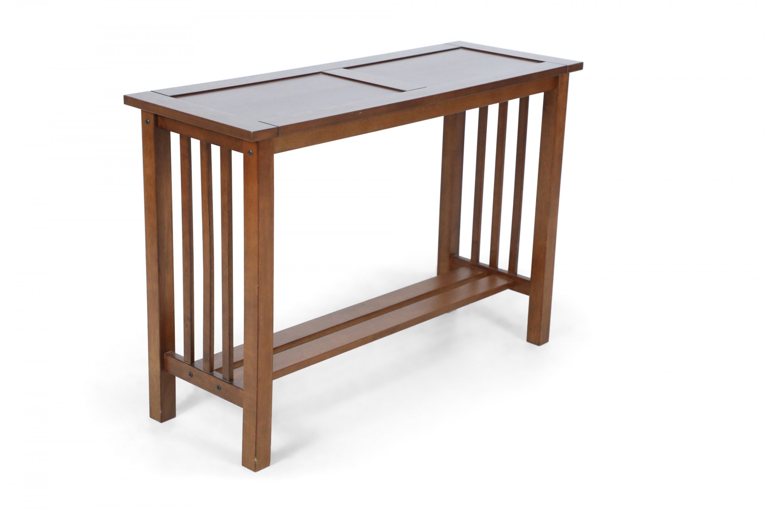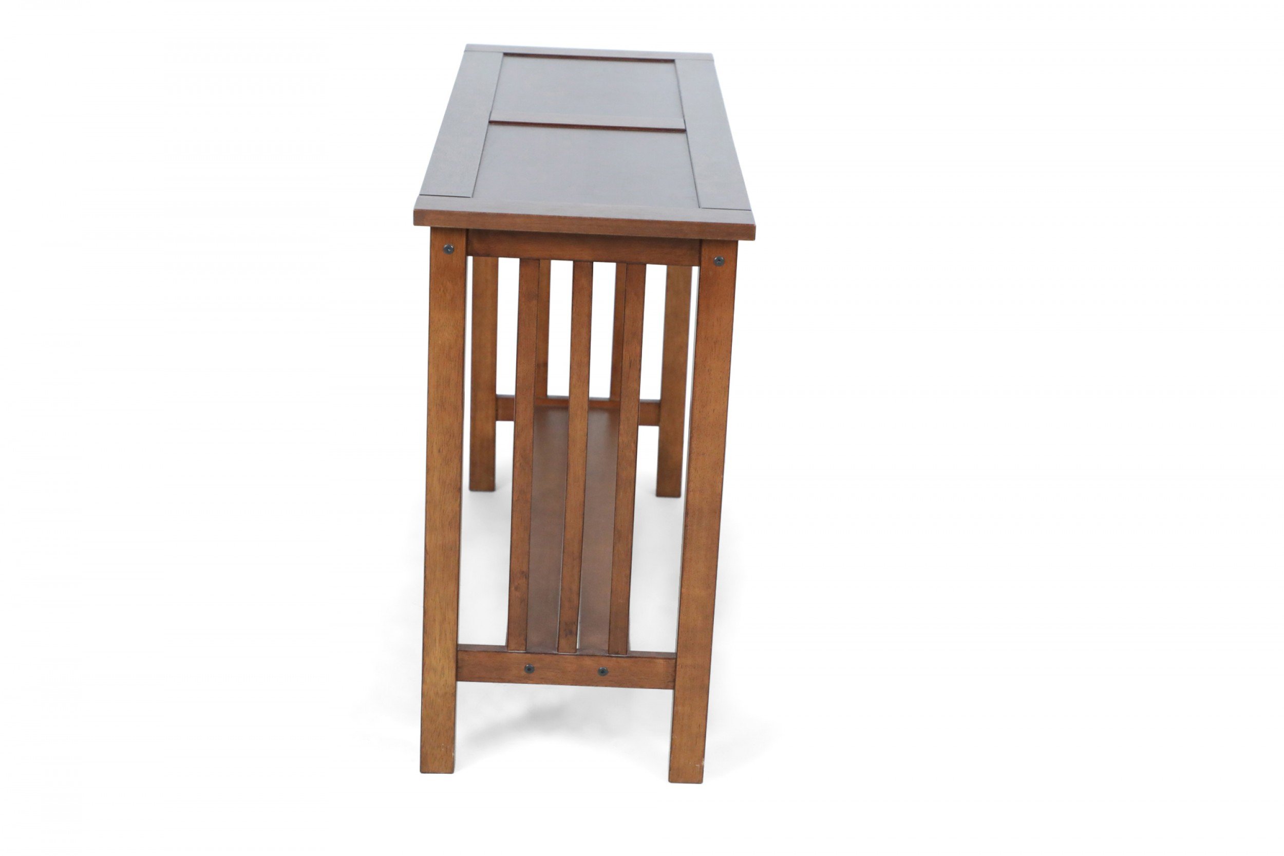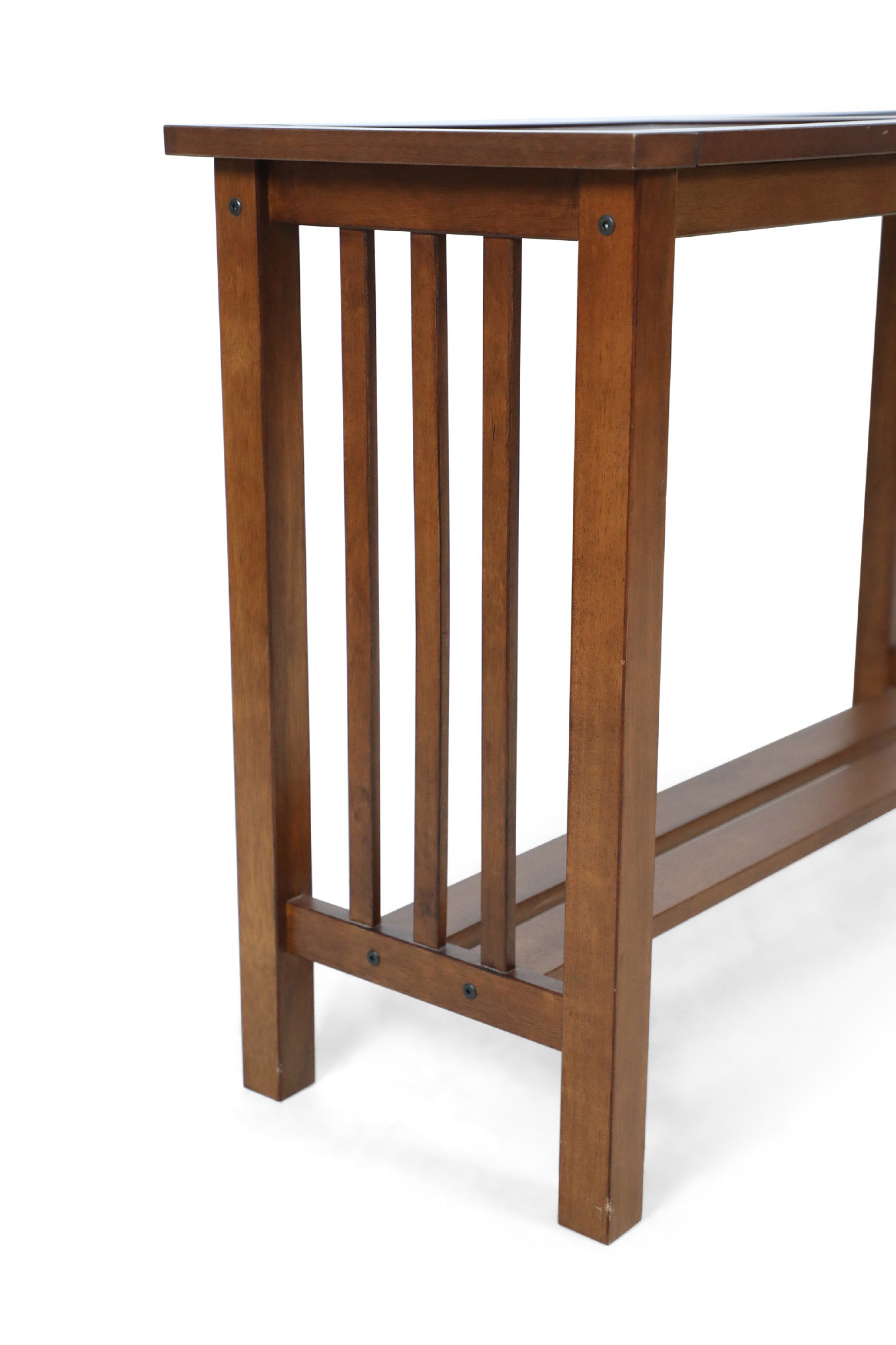 American Mission-style stained oak console / sofa table with slat sides and a double panel rectangular top and lower narrow stretcher/shelf.