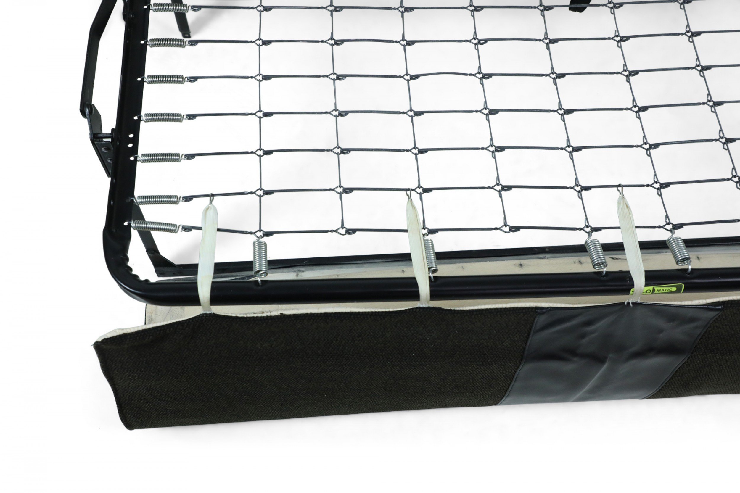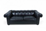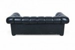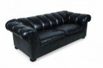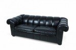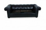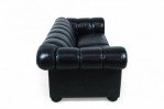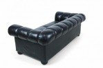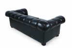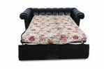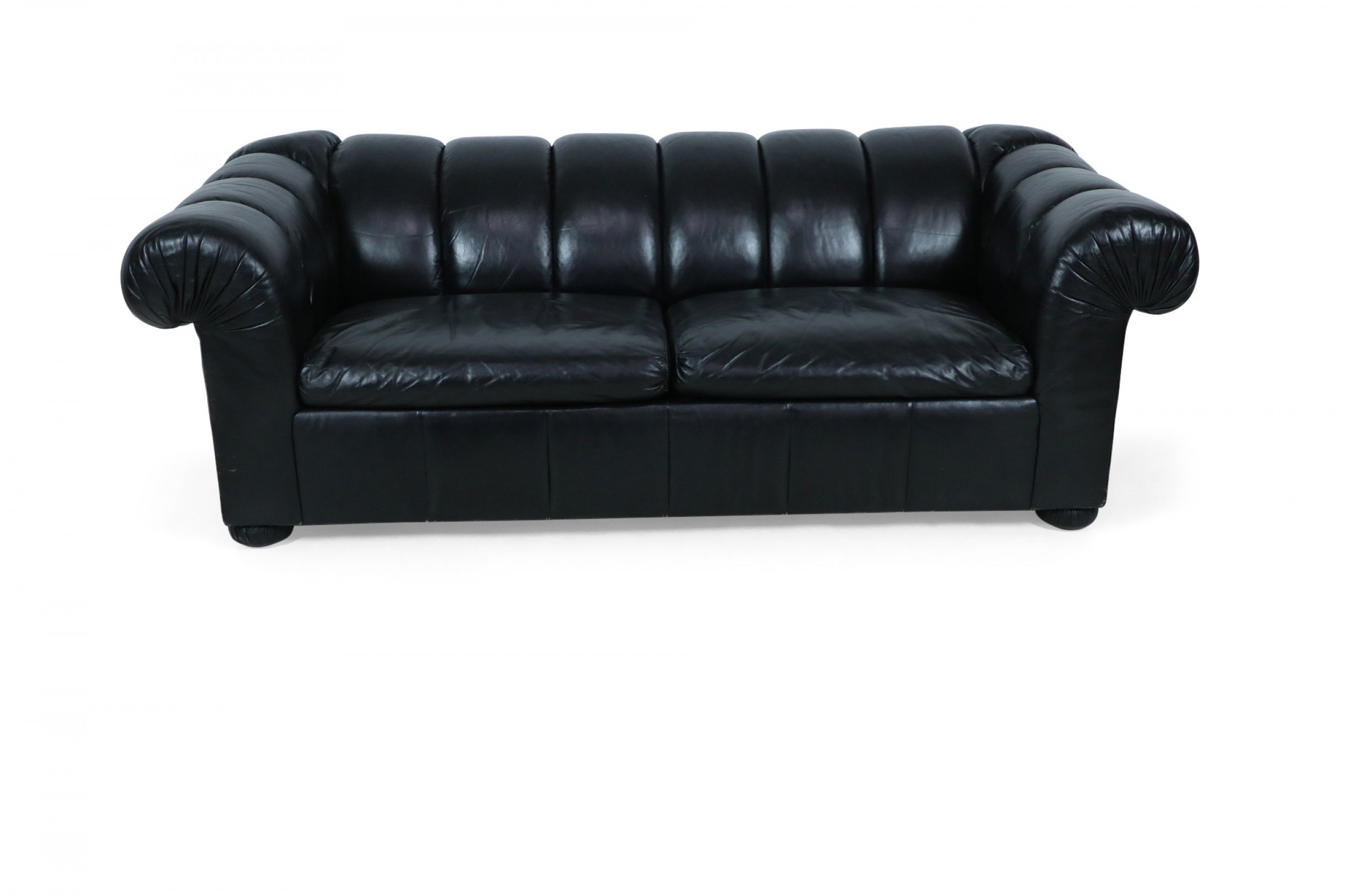 English style contemporary Chesterfield tufted black leather sofa with pull out folding bed beneath two channeled seat cushions..