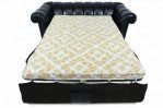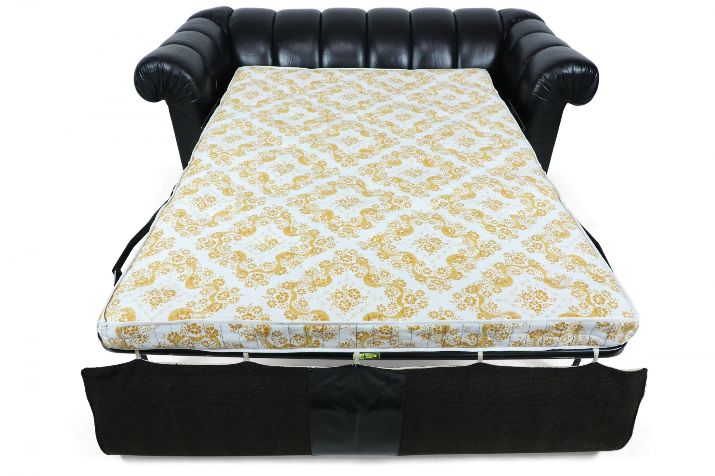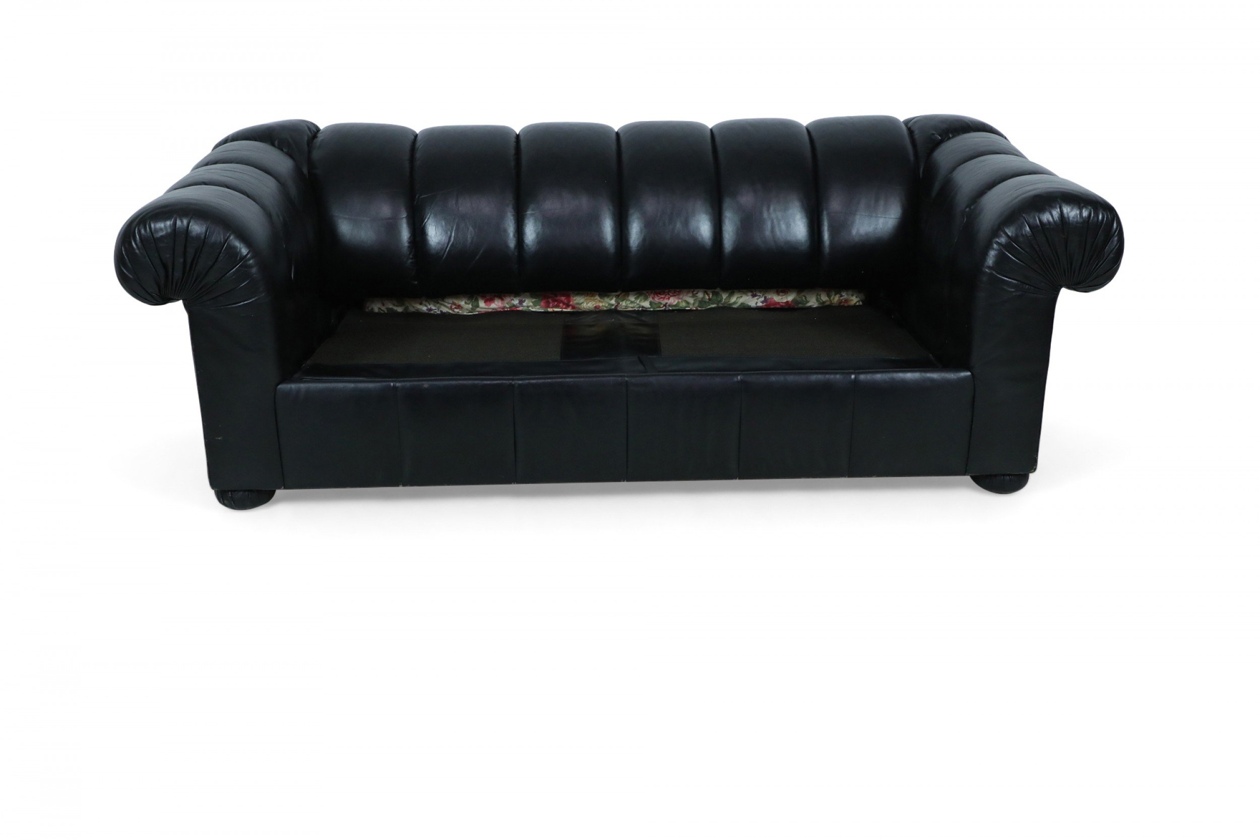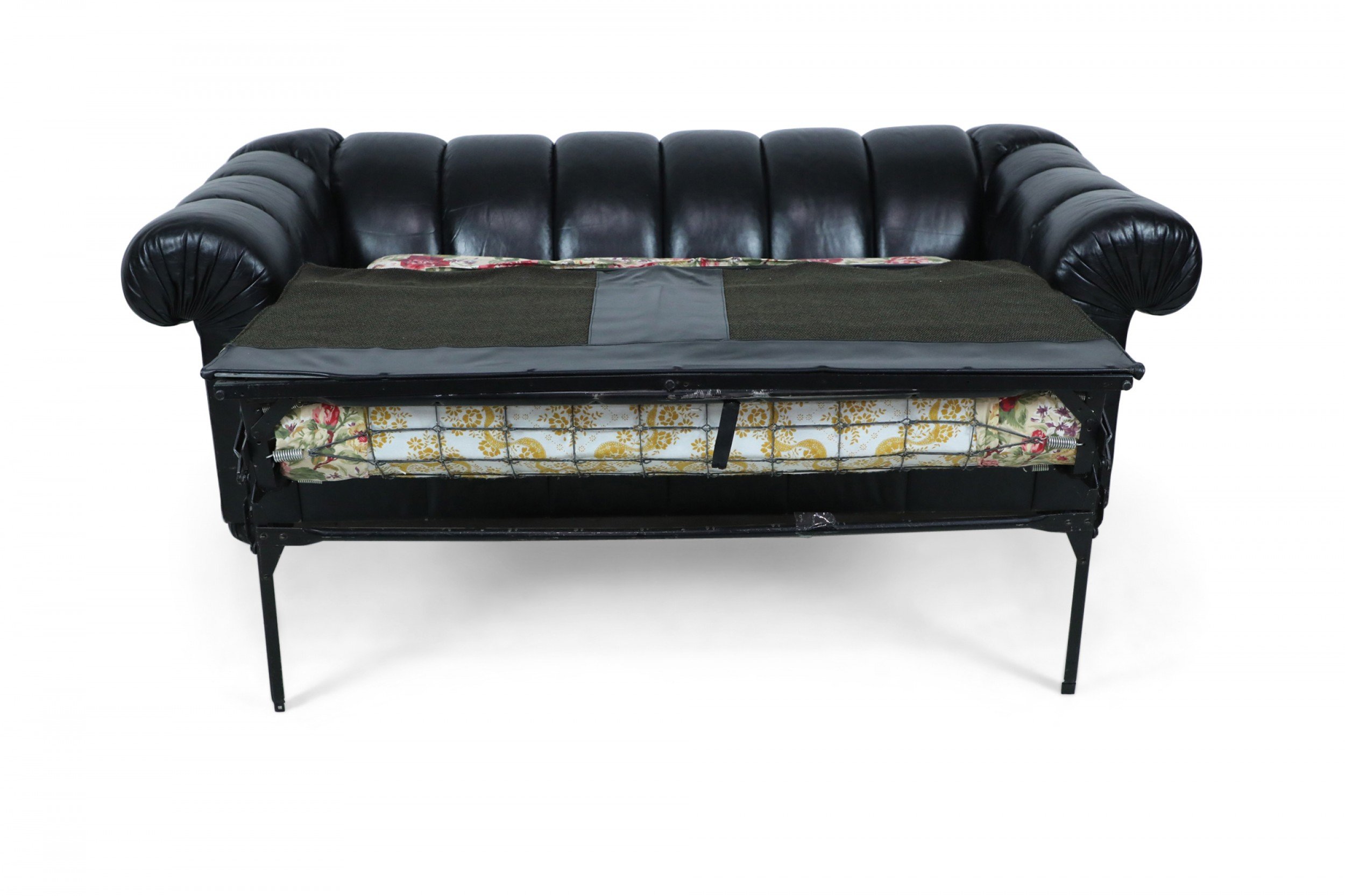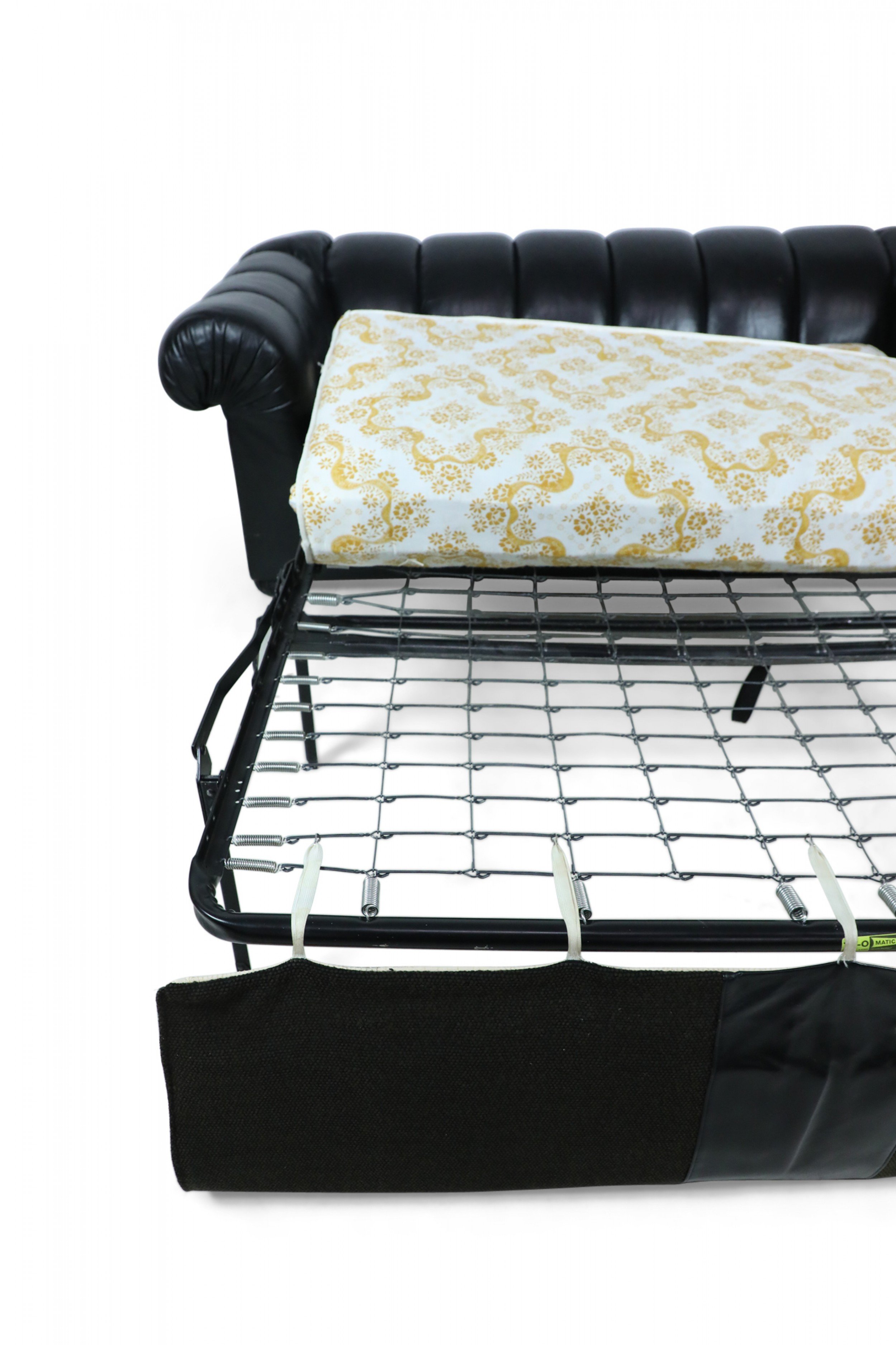 English style contemporary Chesterfield tufted black leather sofa with pull out folding bed beneath two channeled seat cushions.