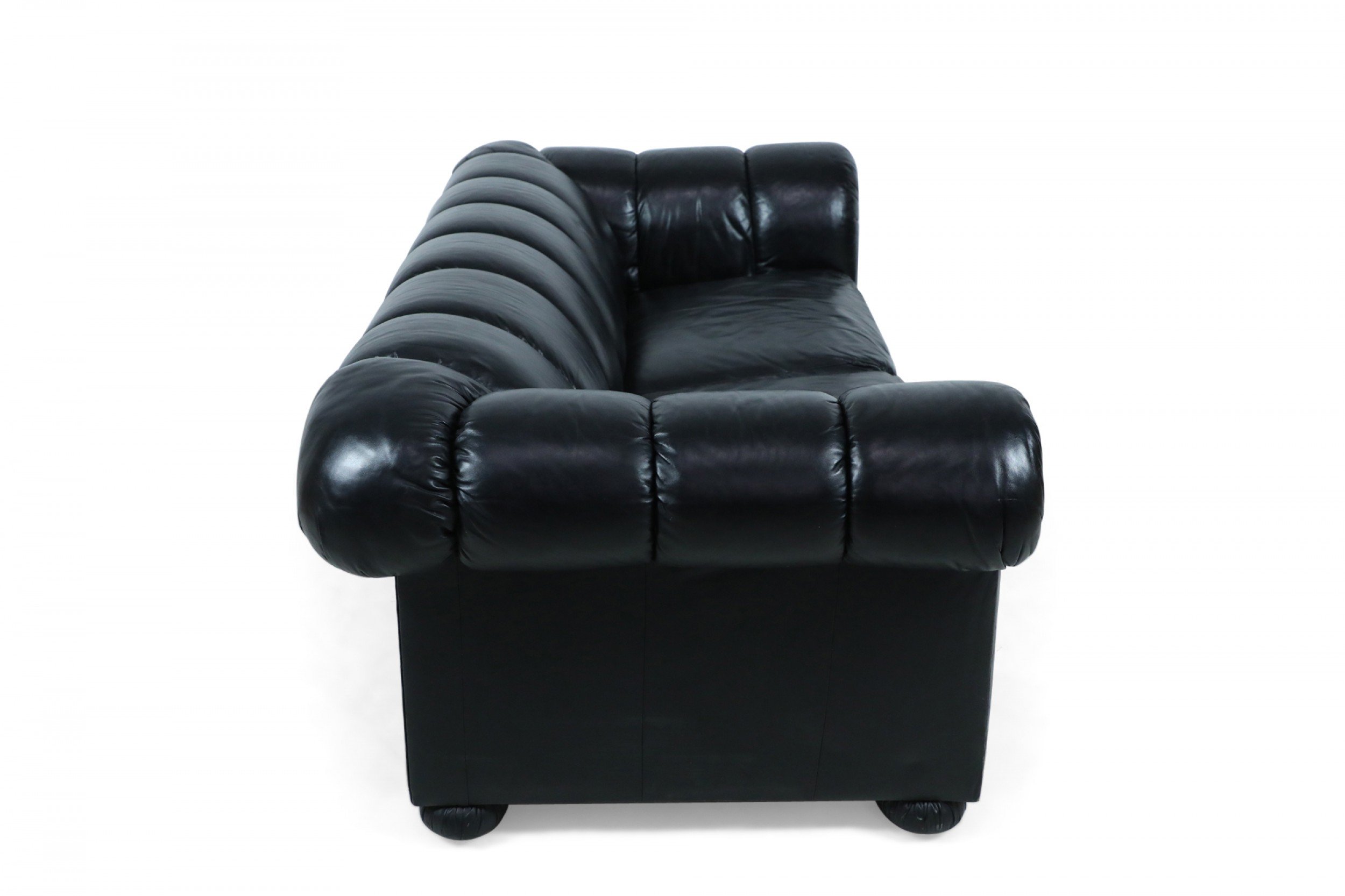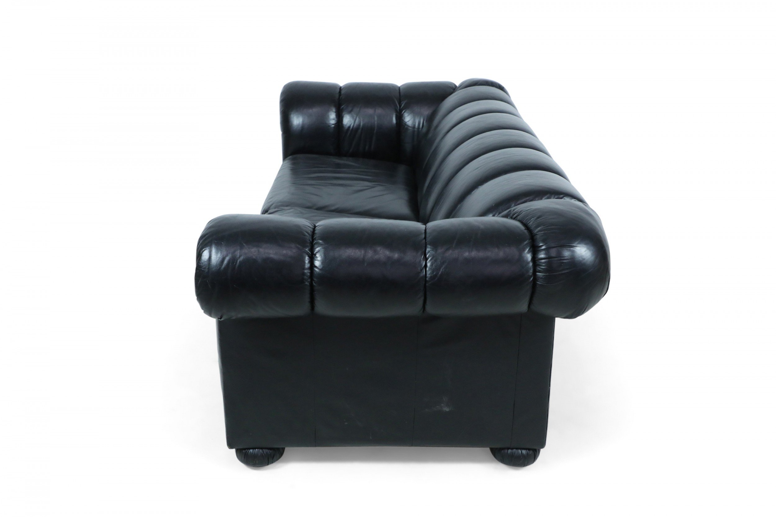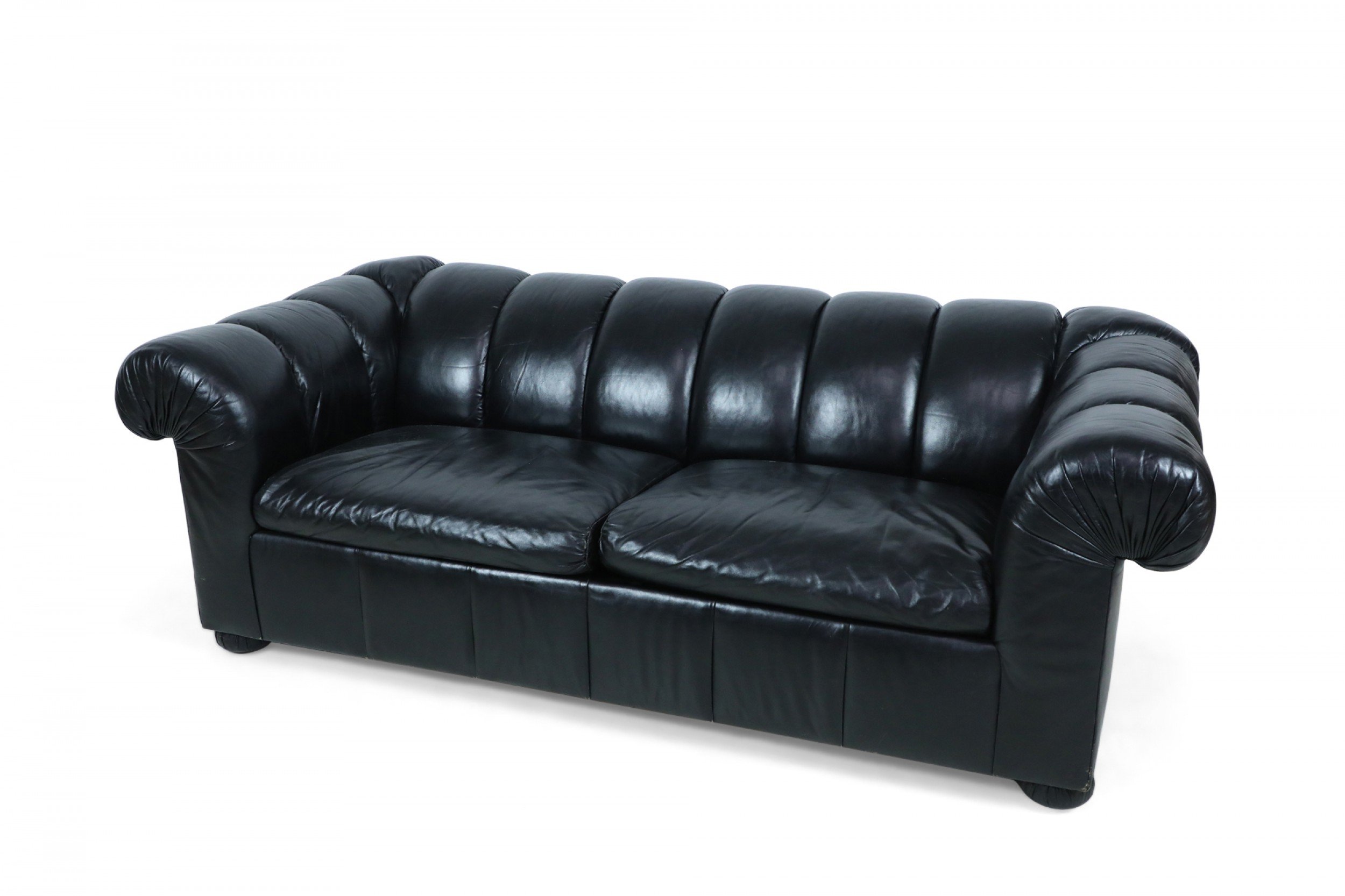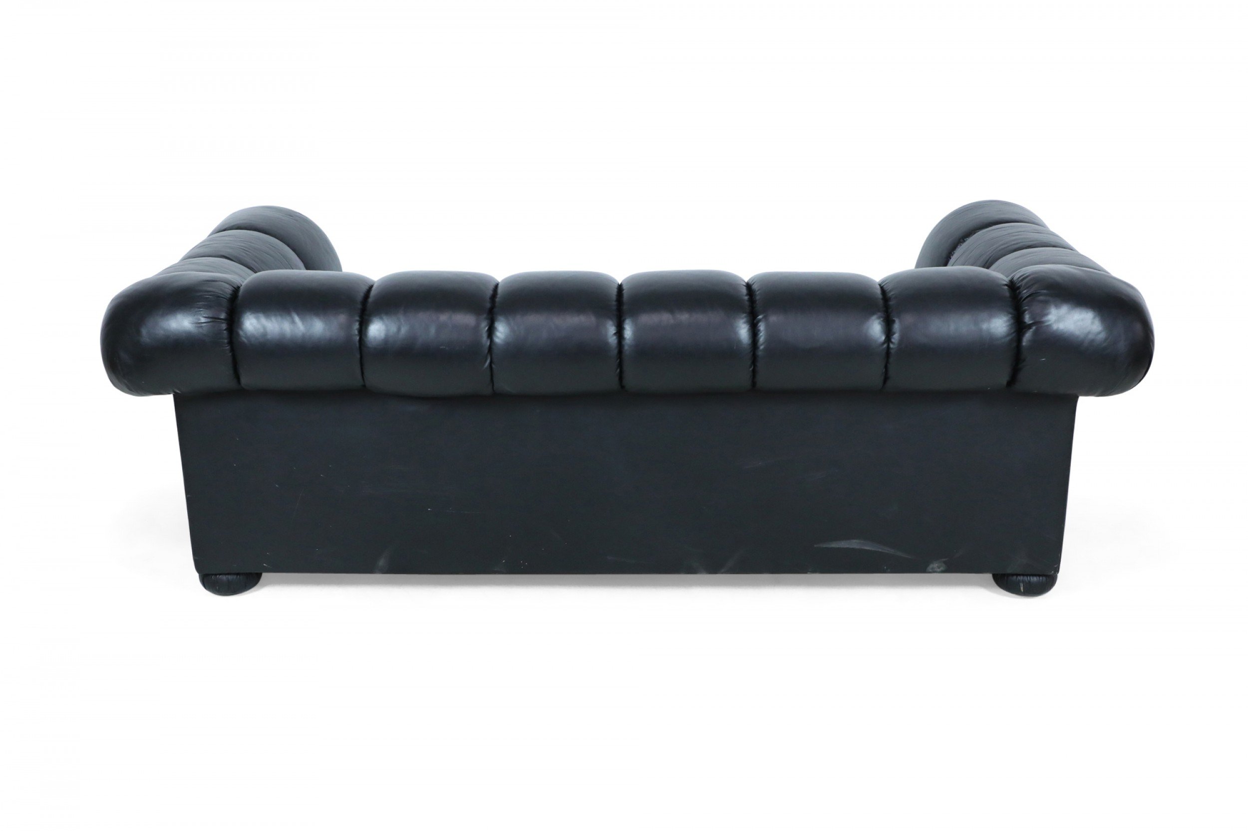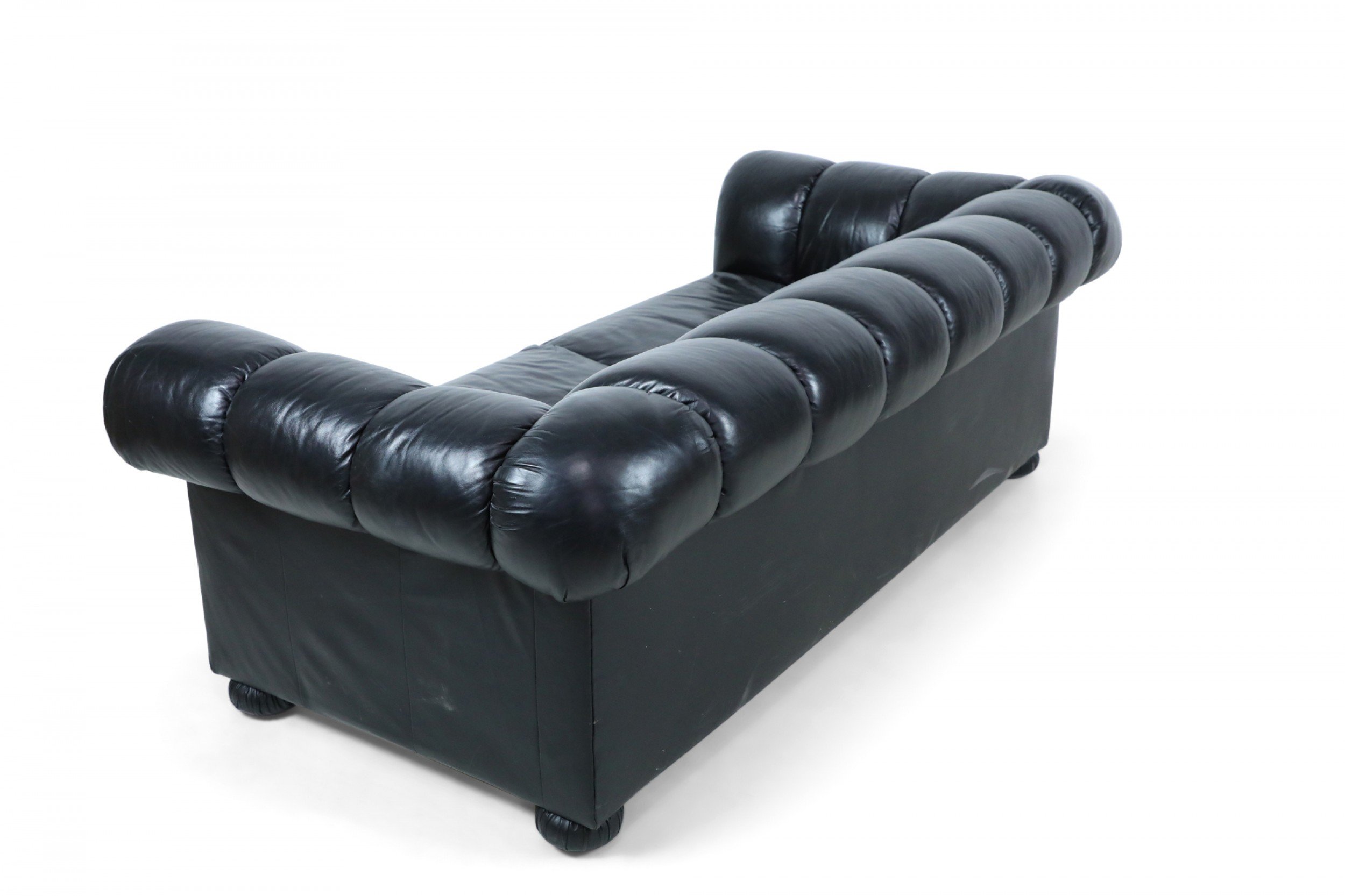 English style contemporary Chesterfield tufted black leather sofa with pull out folding bed beneath two channeled seat cushions.