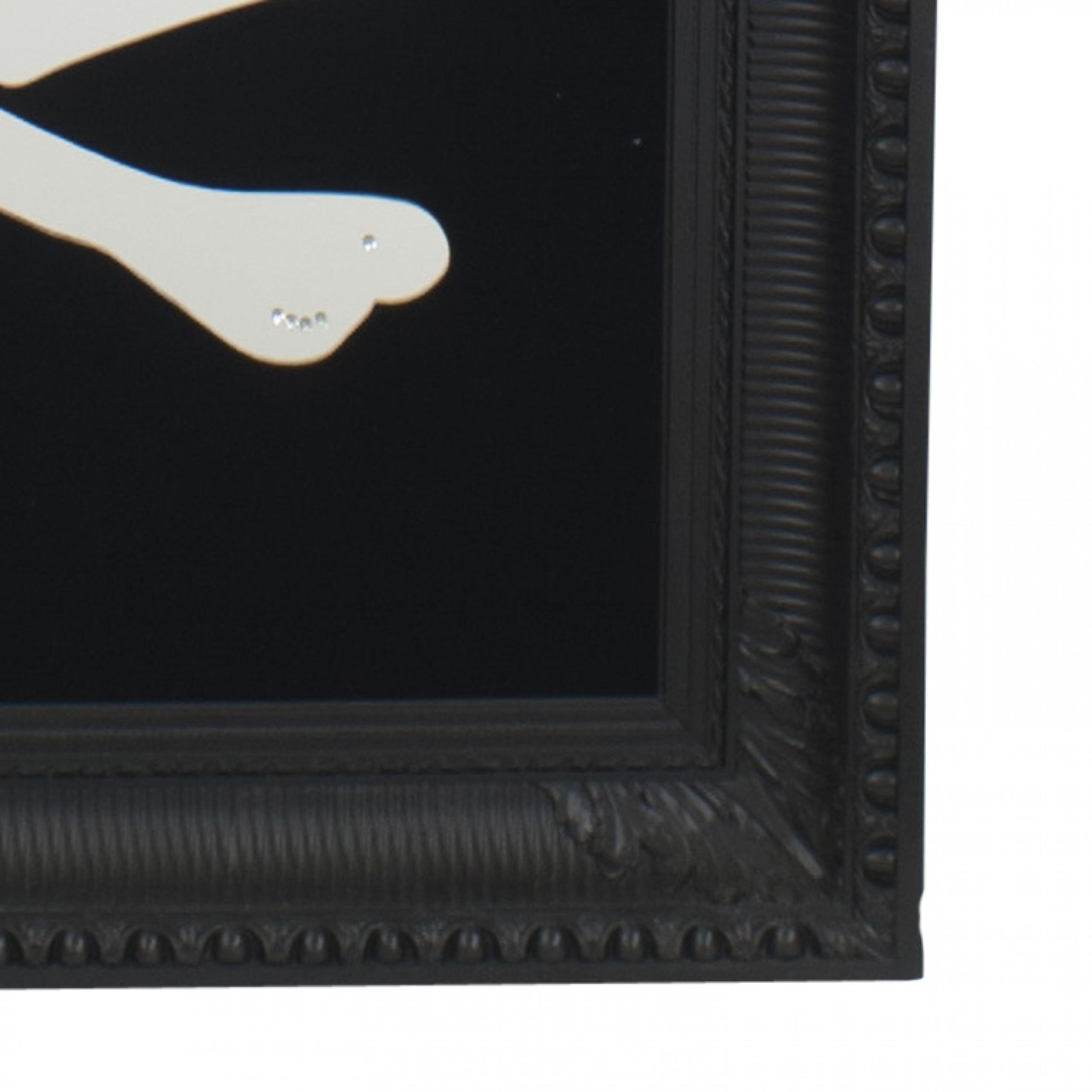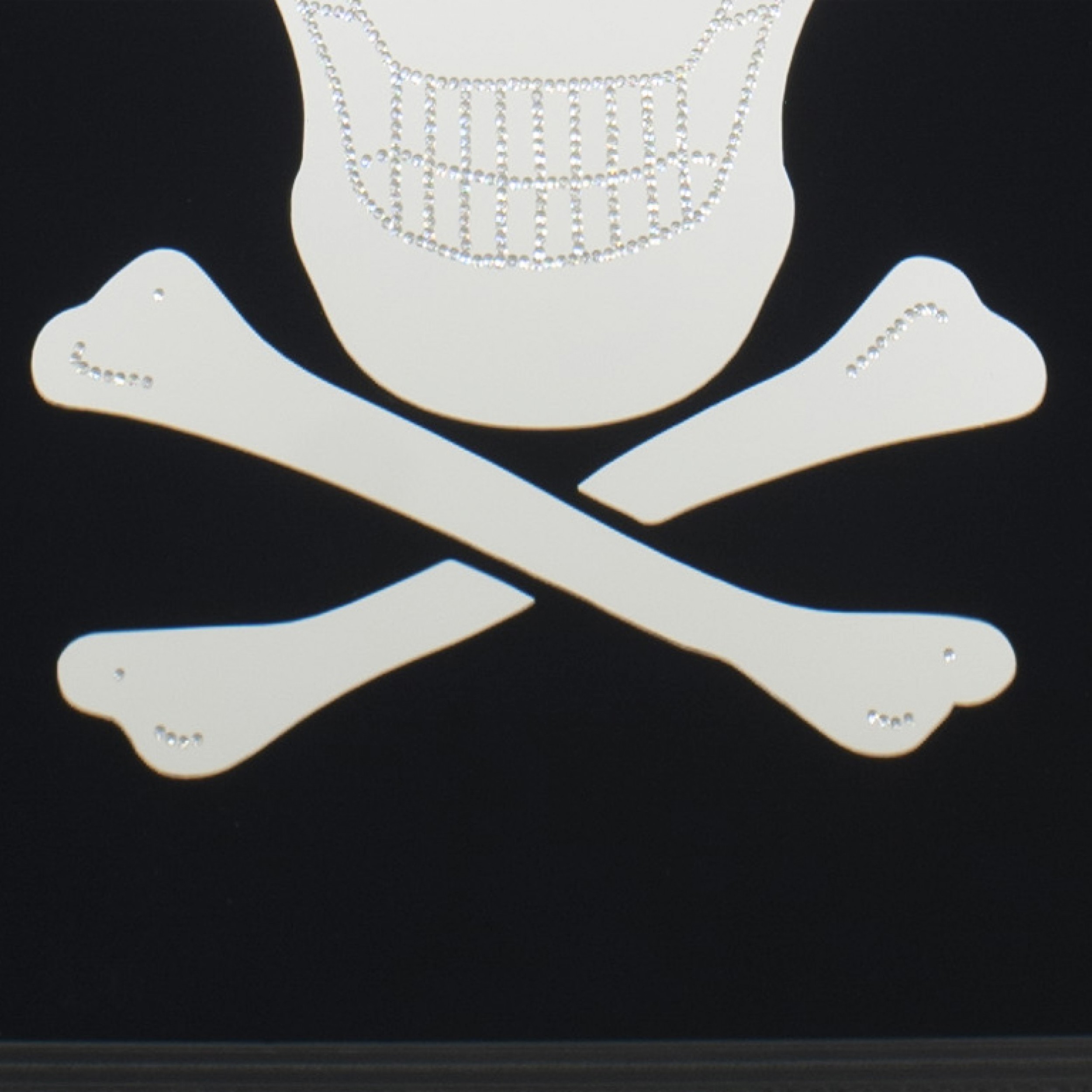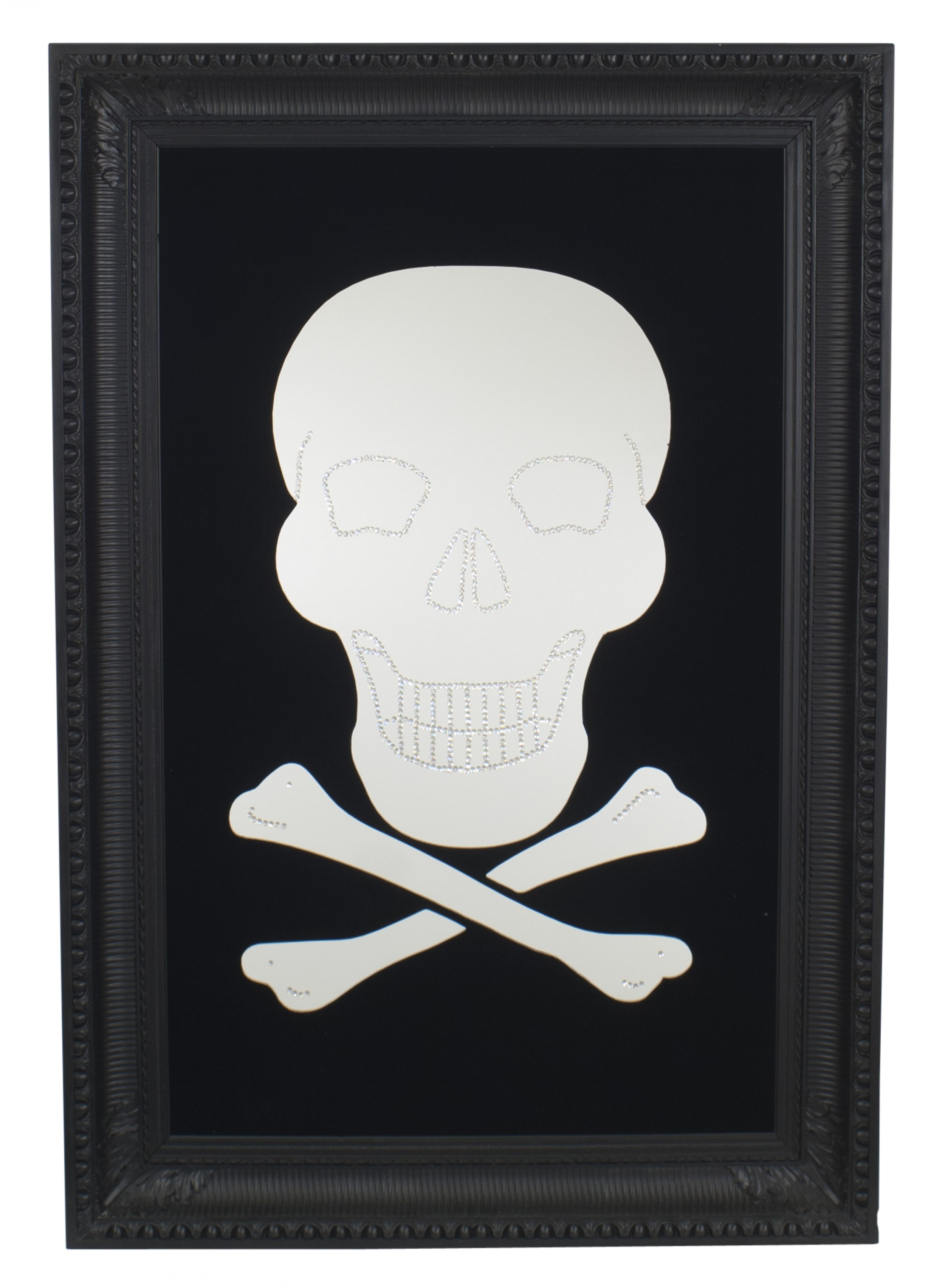 Modern skull & crossbones wall mirror with Swarovski crystal embellishments, black velvet backing, and a black Louis XV-style frame. (THE QUICK AND THE DEAD-"Black", by GEOFFREY BRADFIELD)(Related items: BRA027, BRA026, BRA028).