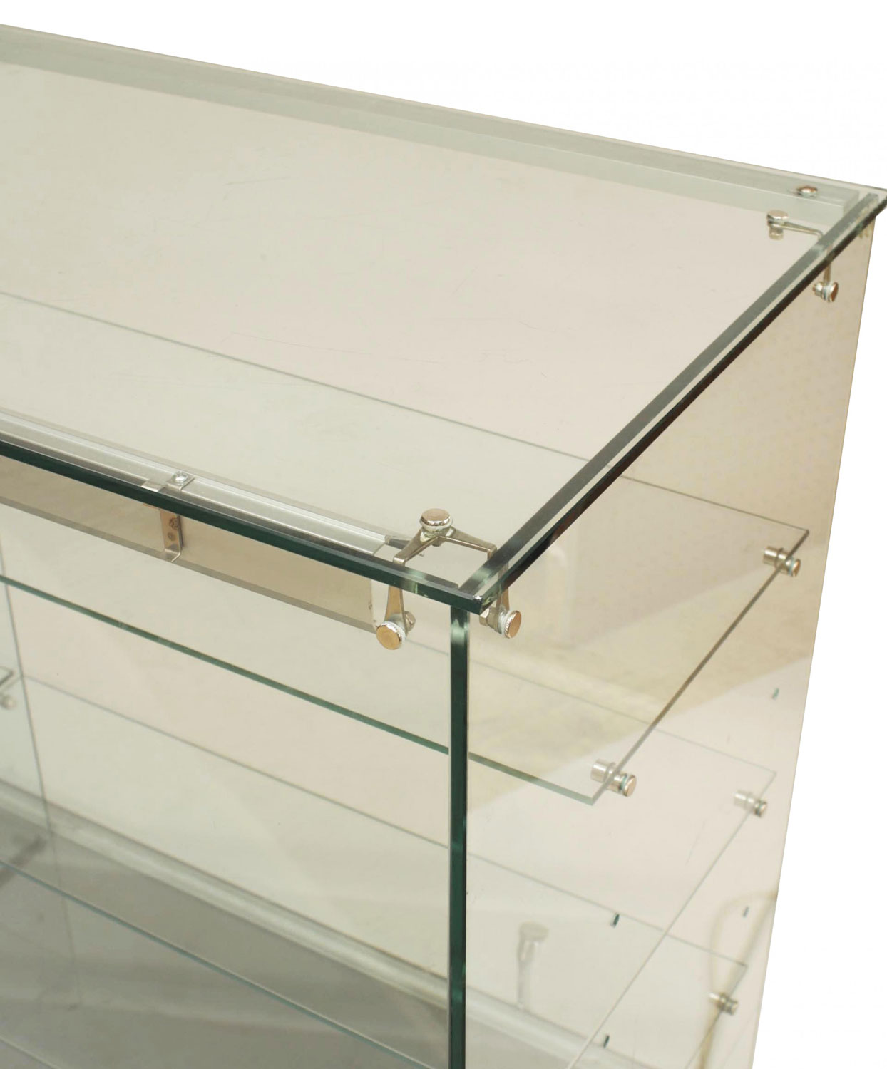 Modern glass showcase cabinet with steel & aluminum fittings with 2 sliding mirrored doors on a wood base with 6 adjustable glass shelves and lighted interior.