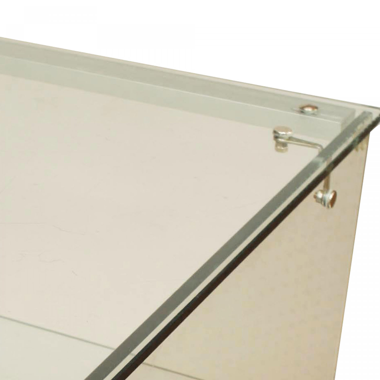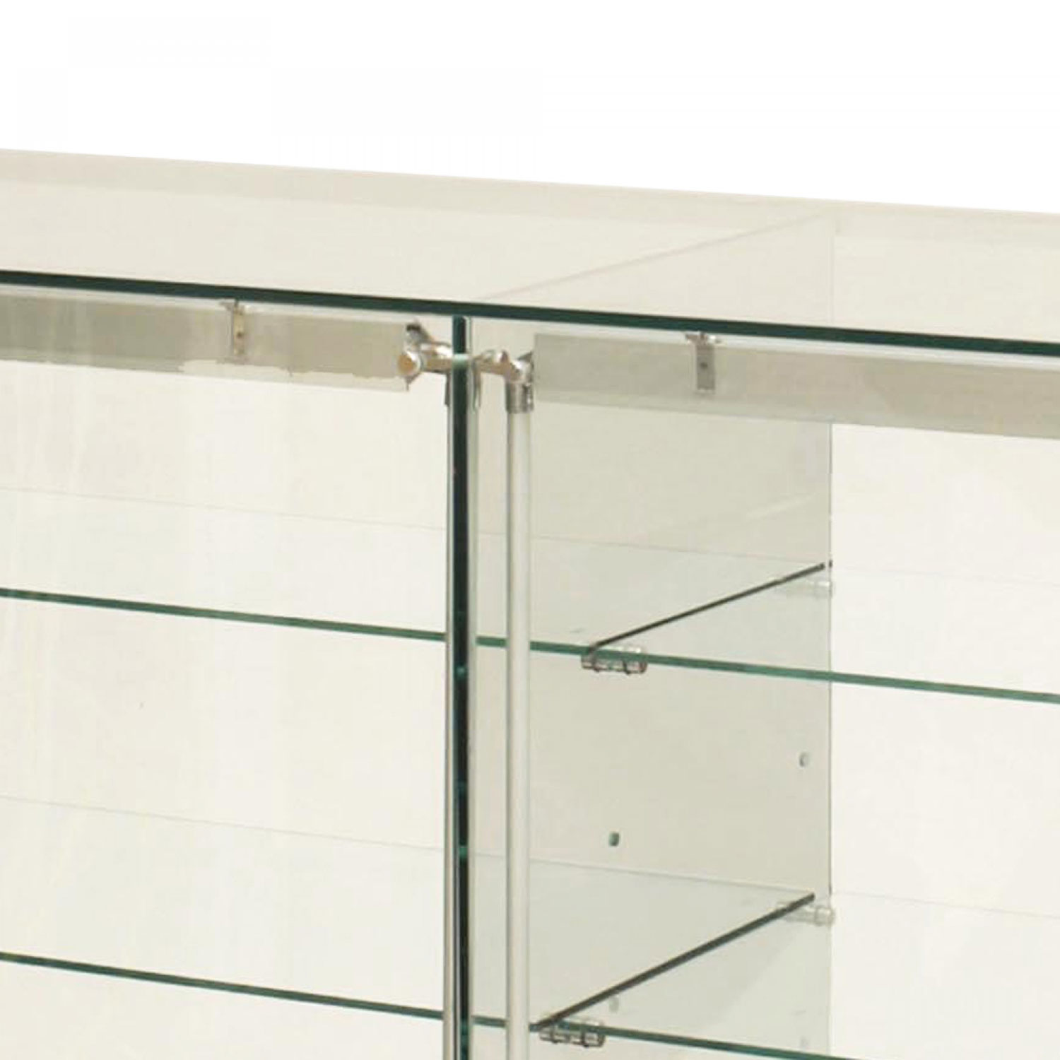 Modern glass showcase cabinet with steel & aluminum fittings with 2 sliding mirrored doors on a wood base with 6 adjustable glass shelves and lighted interior..
