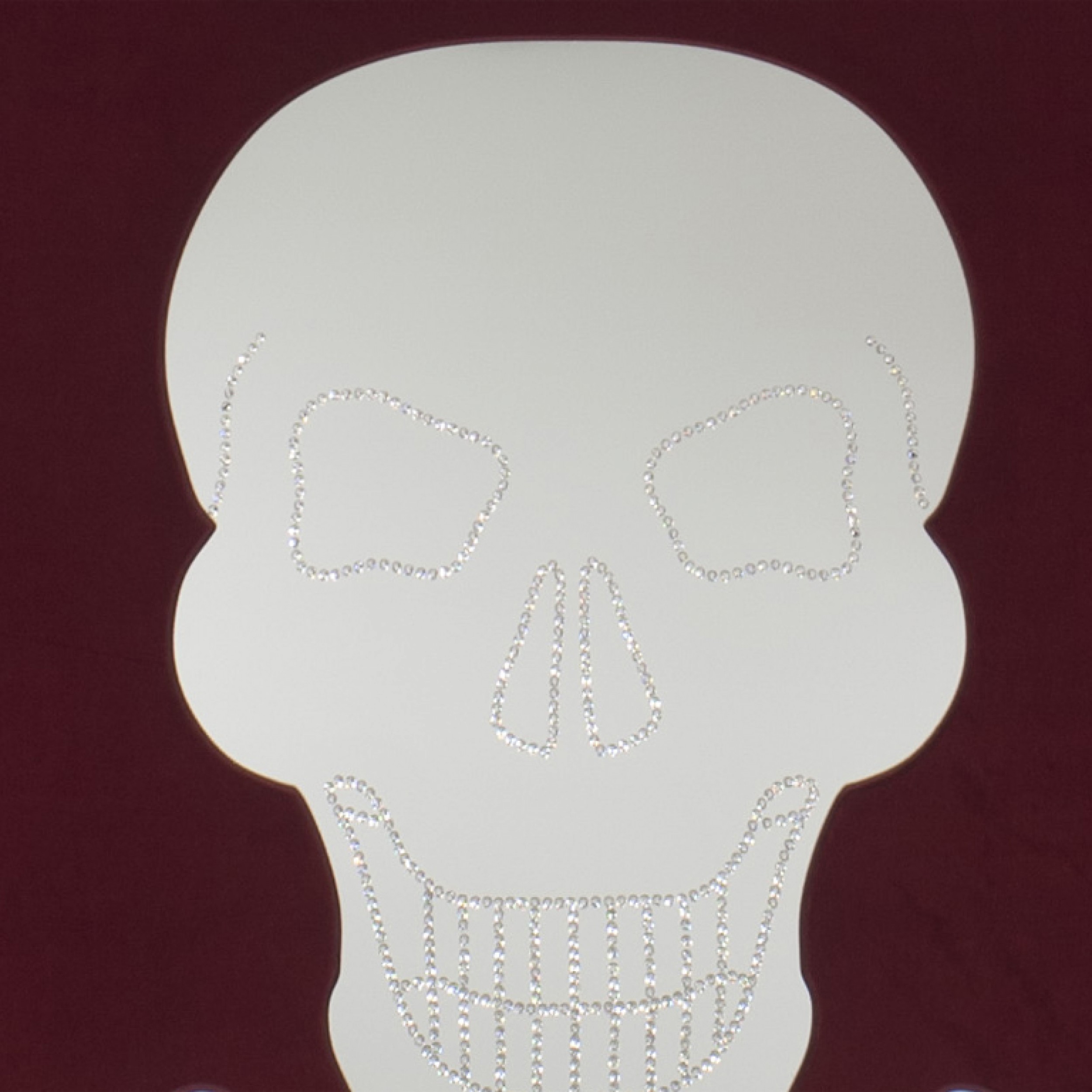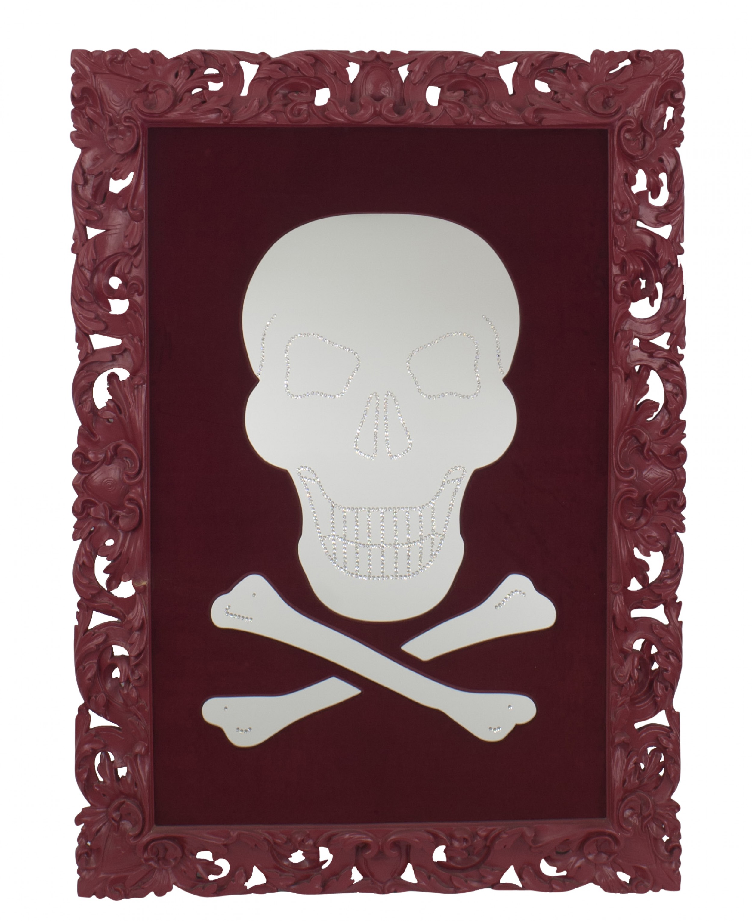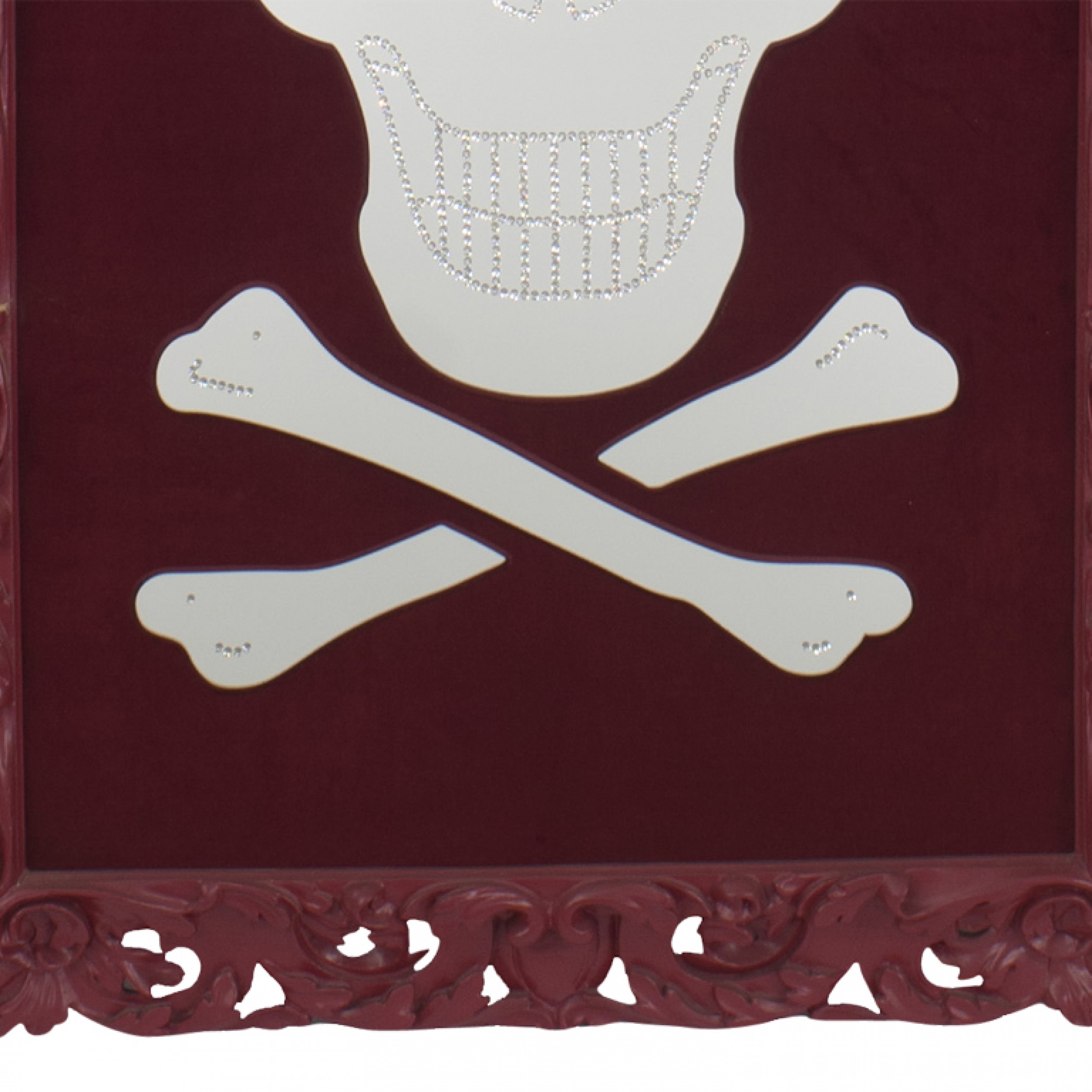 Modern skull & crossbones wall mirror with Swarovski crystal embellishments, red velvet backing, and an ornate red filigree Louis XV-style frame. (THE QUICK AND THE DEAD-"Pirate Red No. 3", by GEOFFREY BRADFIELD) (Related items: BRA027, BRA028, BRA029).