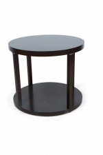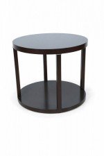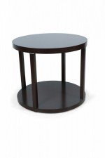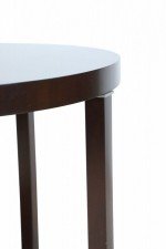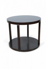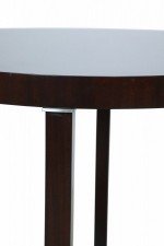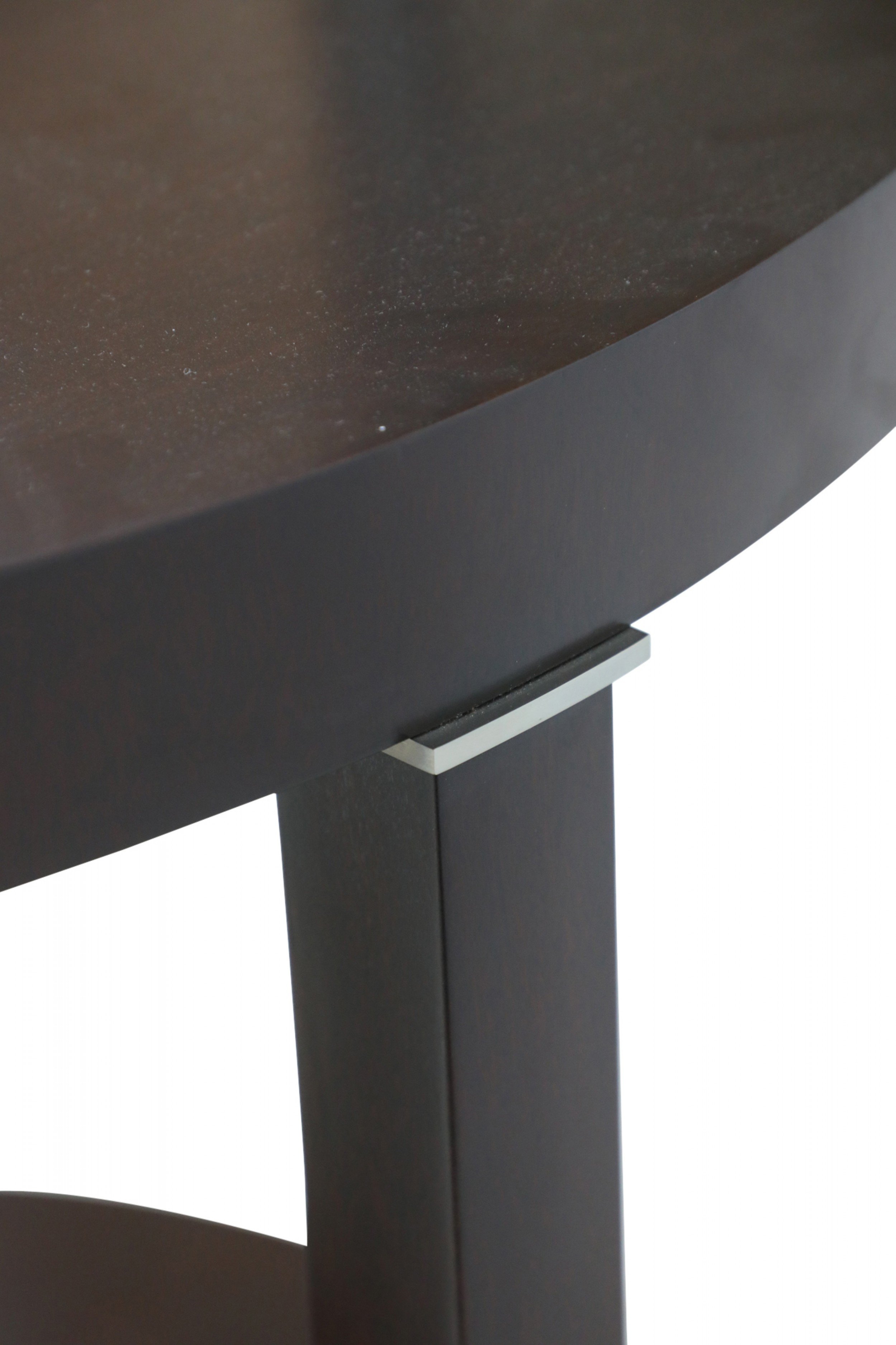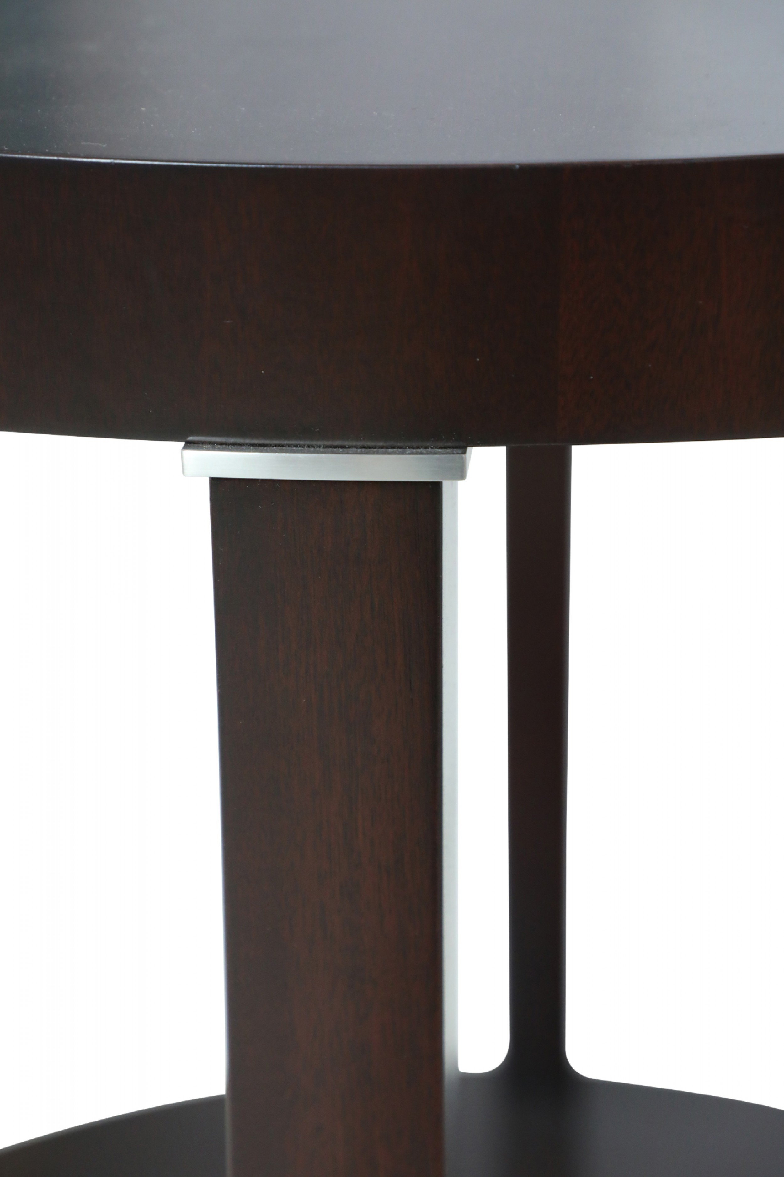Contemporary round mahogany center table with four cylindrical legs atop a round platform base, with stainless steel detail at tops of columns.