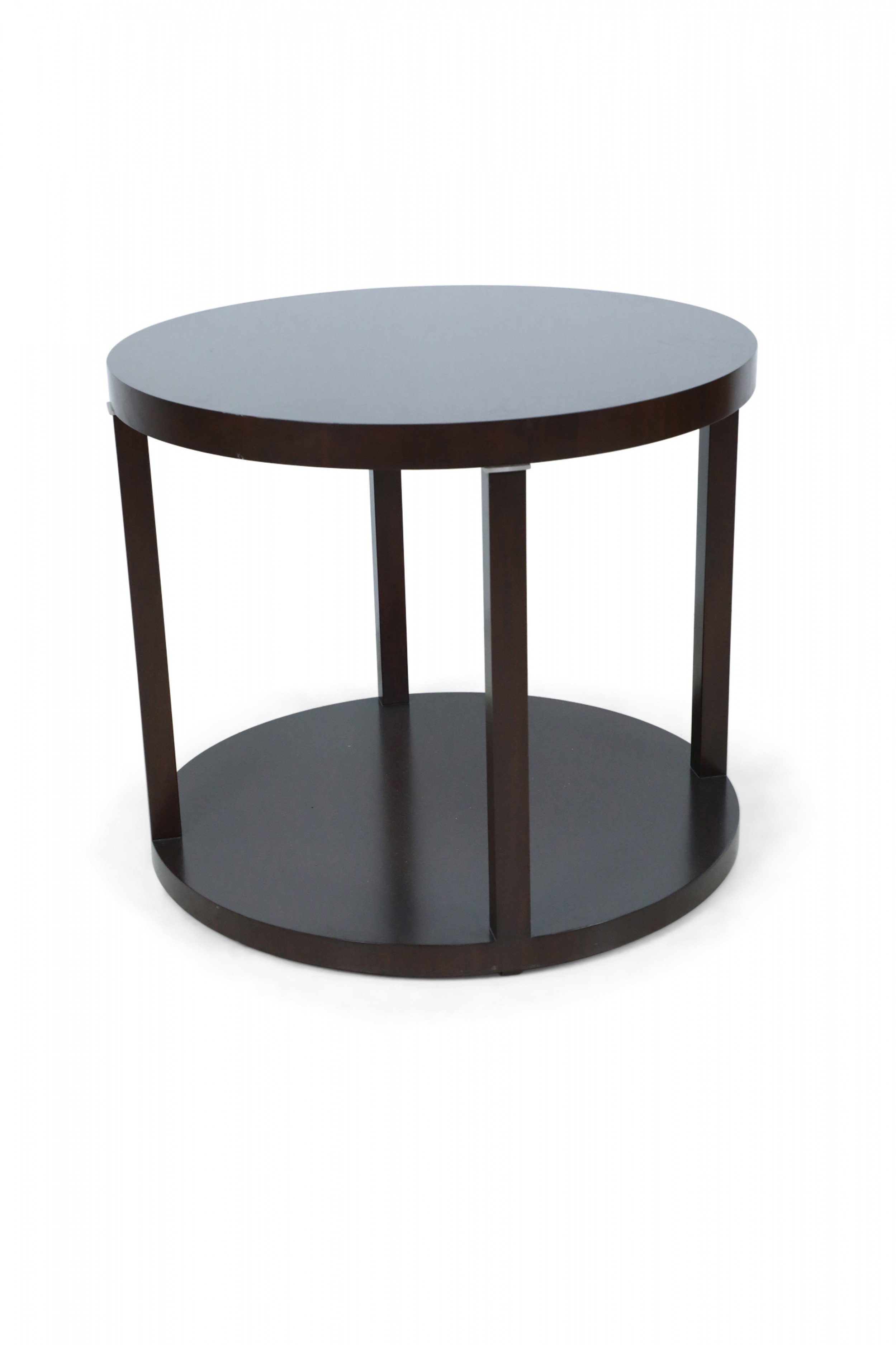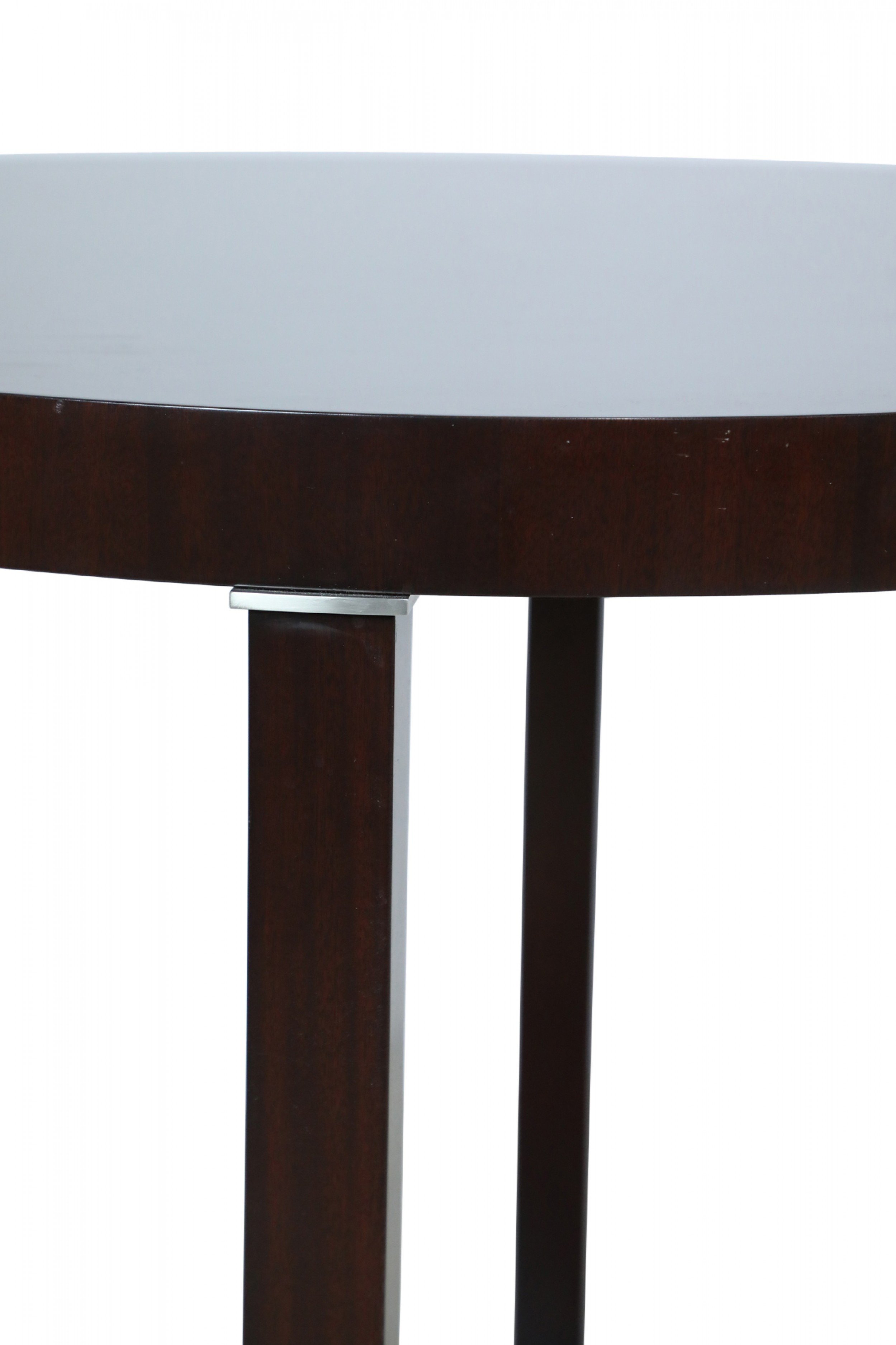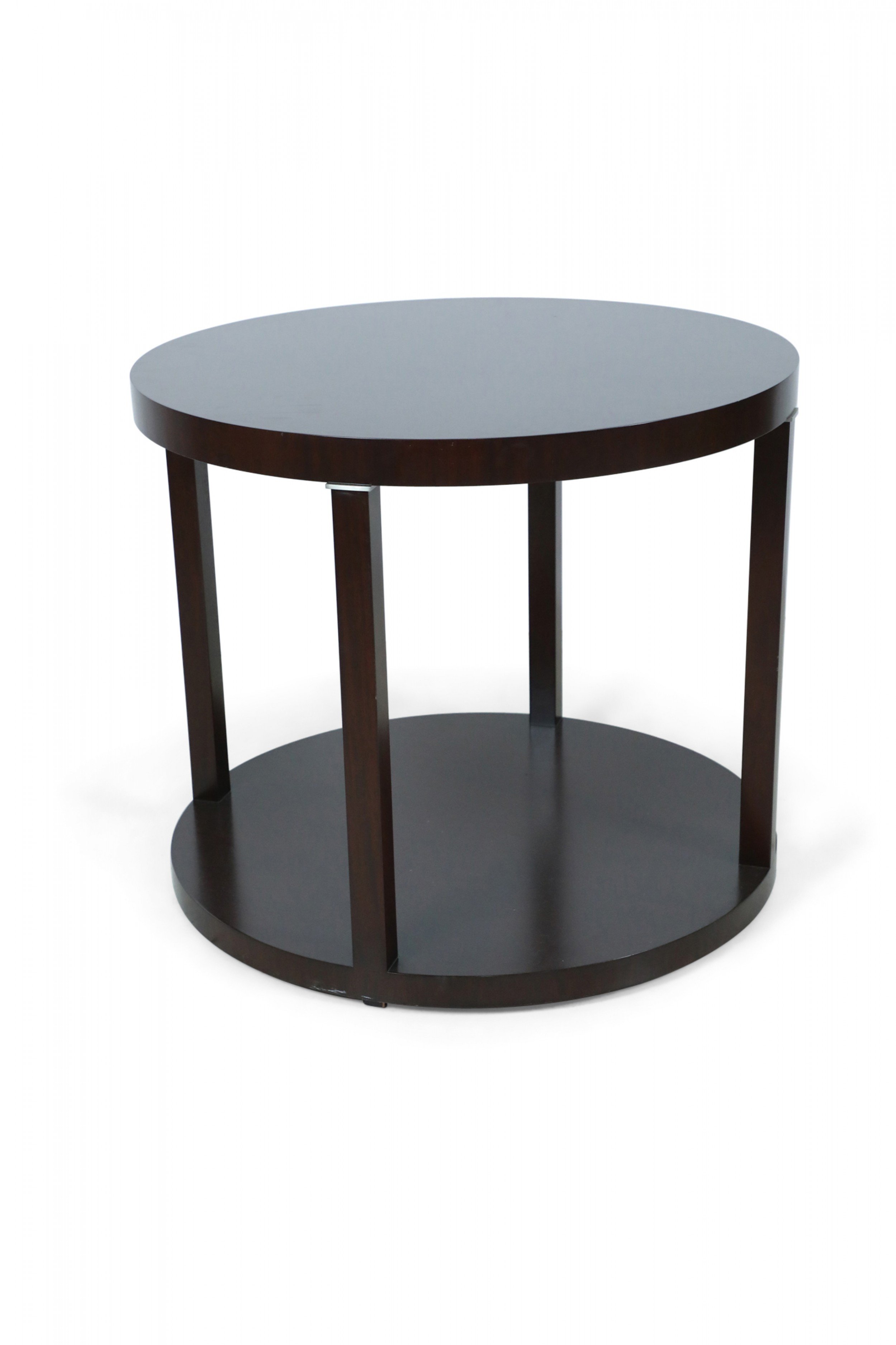 Contemporary round mahogany center table with four cylindrical legs atop a round platform base, with stainless steel detail at tops of columns..
