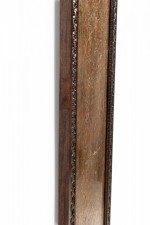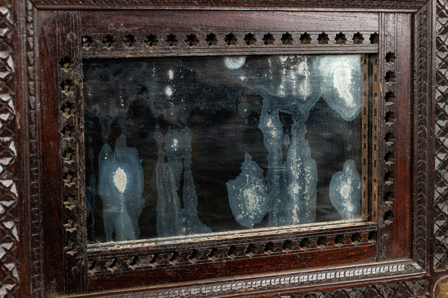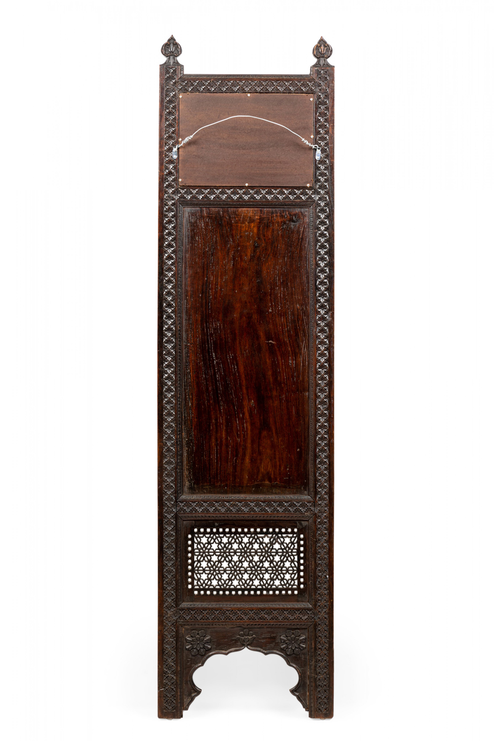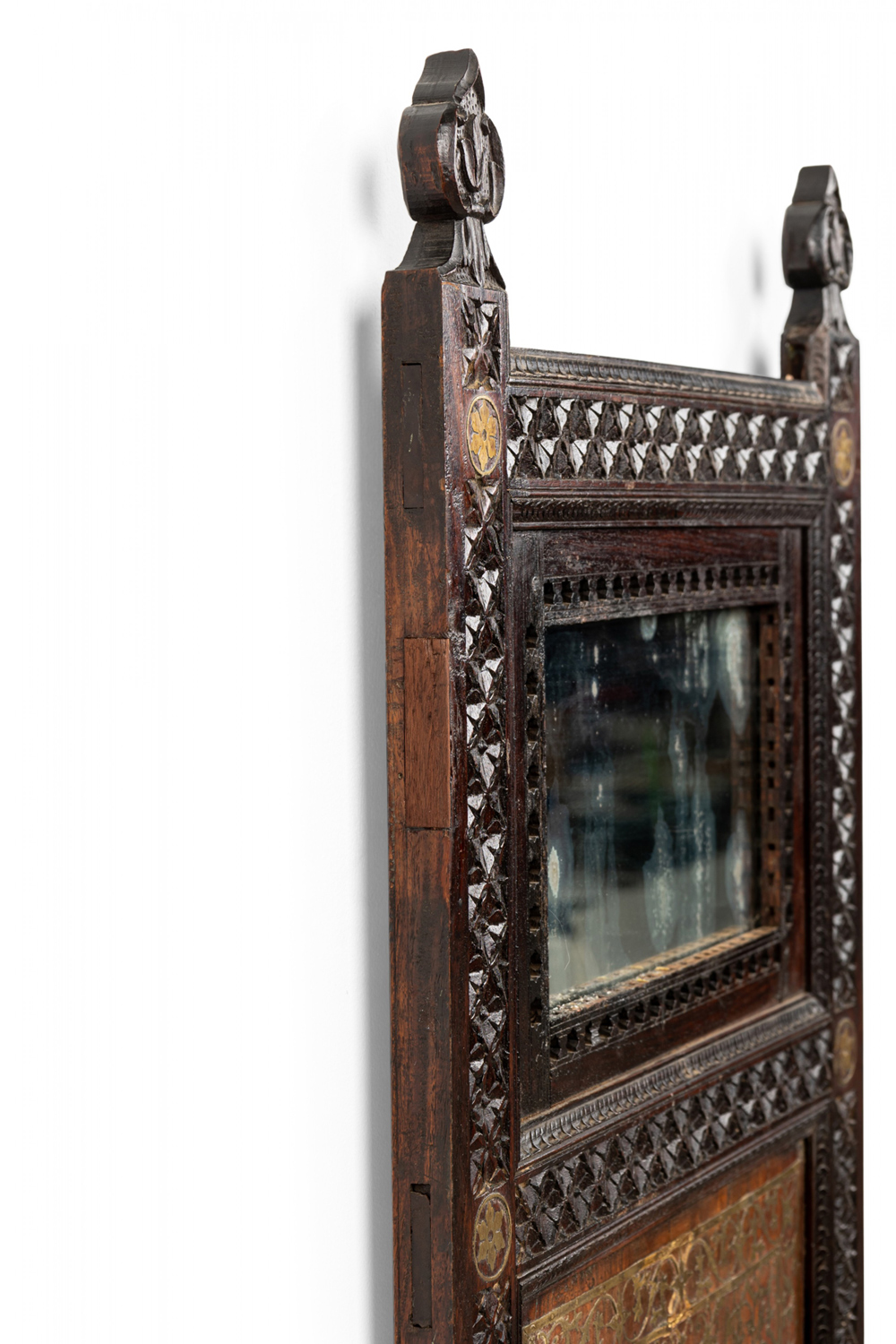 Middle Eastern Moorish style (19th Century) carved teak wall panel with a large brass inlaid center panel centered between a mirrored top panel and filigree bottom panel..