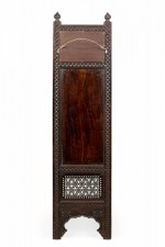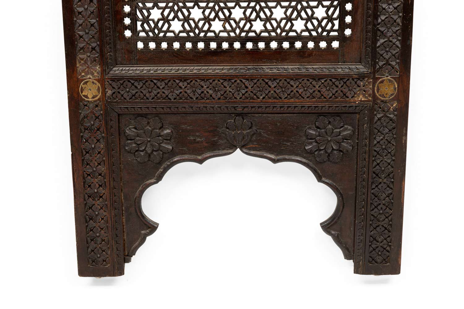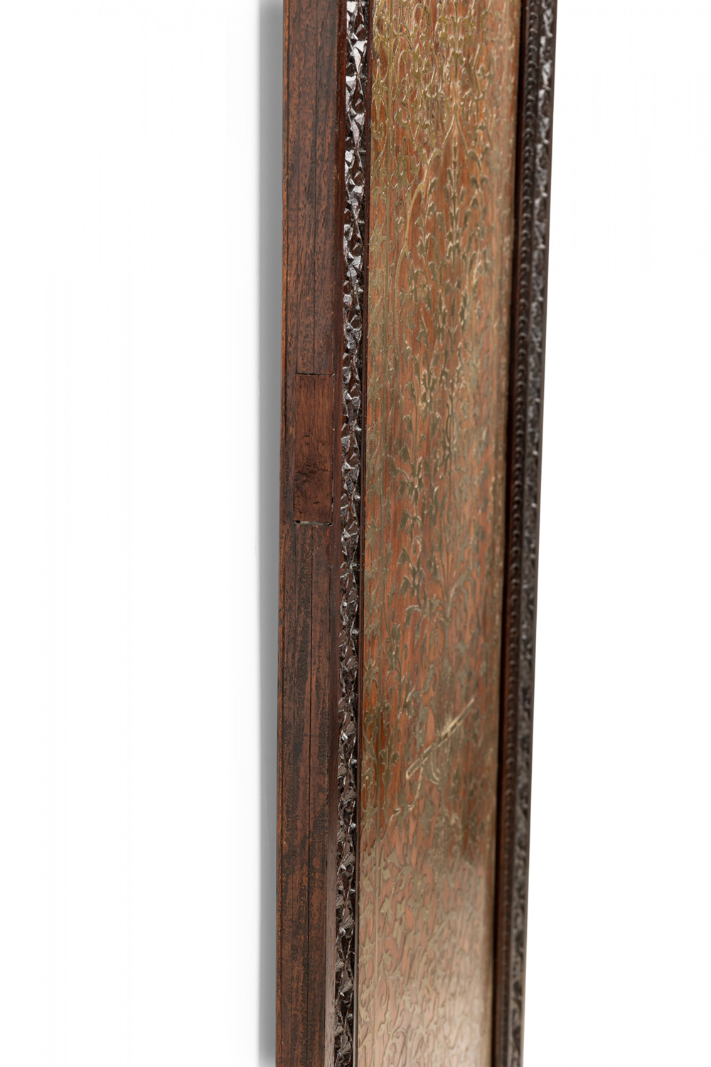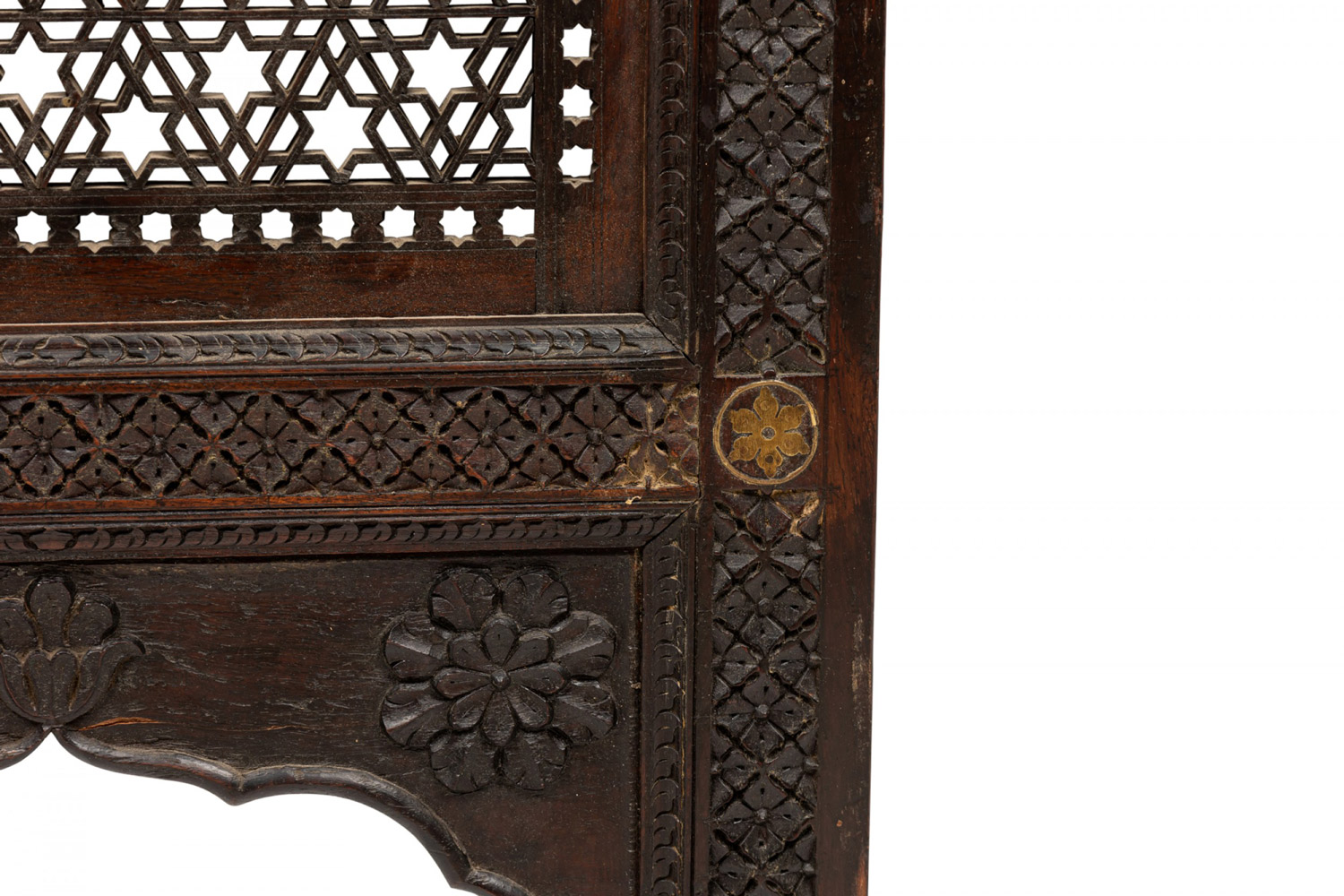 Middle Eastern Moorish style (19th Century) carved teak wall panel with a large brass inlaid center panel centered between a mirrored top panel and filigree bottom panel.