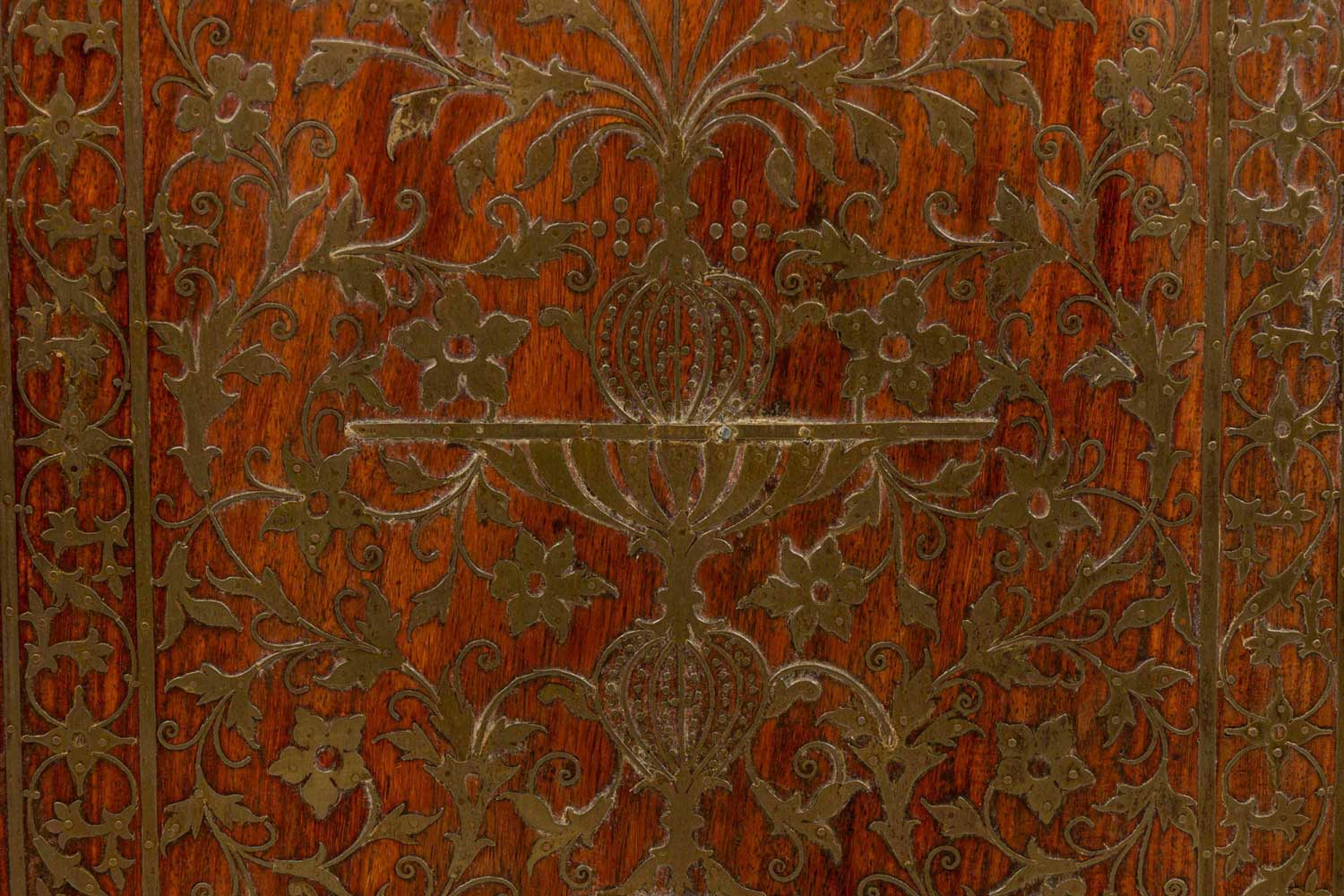 Style: Middle Eastern Materials & Techniques: Brass, carved, inlaid, teak Category: Cleared Art, Rugs/Textile