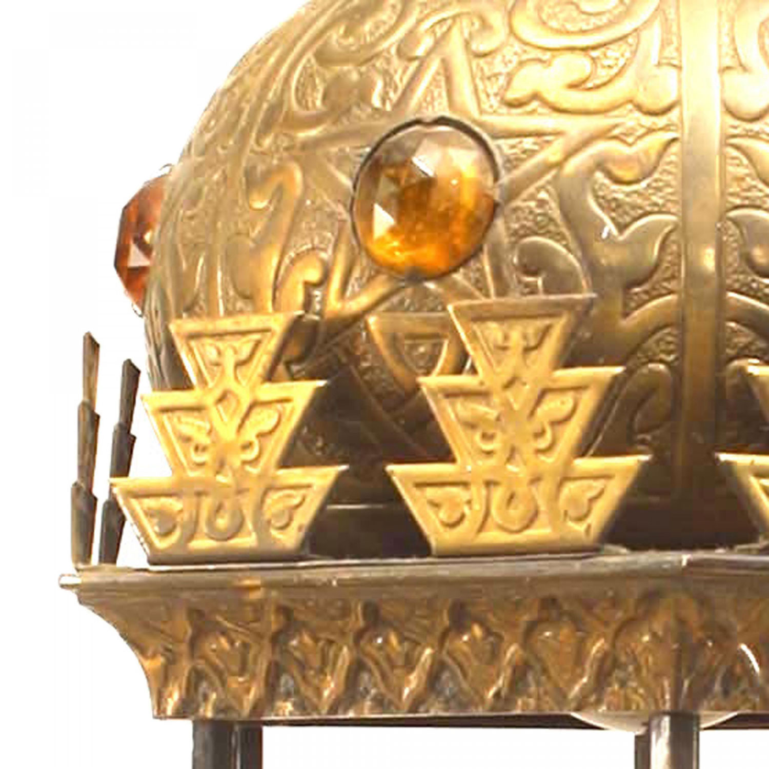 Middle Eastern-style (circa 1920s) 6 sided lantern with embossed brass & fretwork design & glass jewels inset in top.