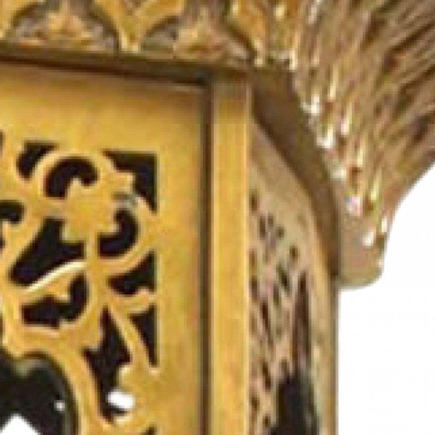 Middle Eastern Moorish-style (1st quarter 20th Century) six-sided bracket lantern wall sconce with embossed brass and fretwork design and glass jewels inset in the tops..
