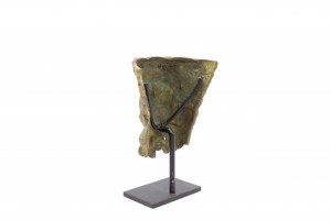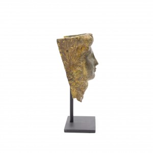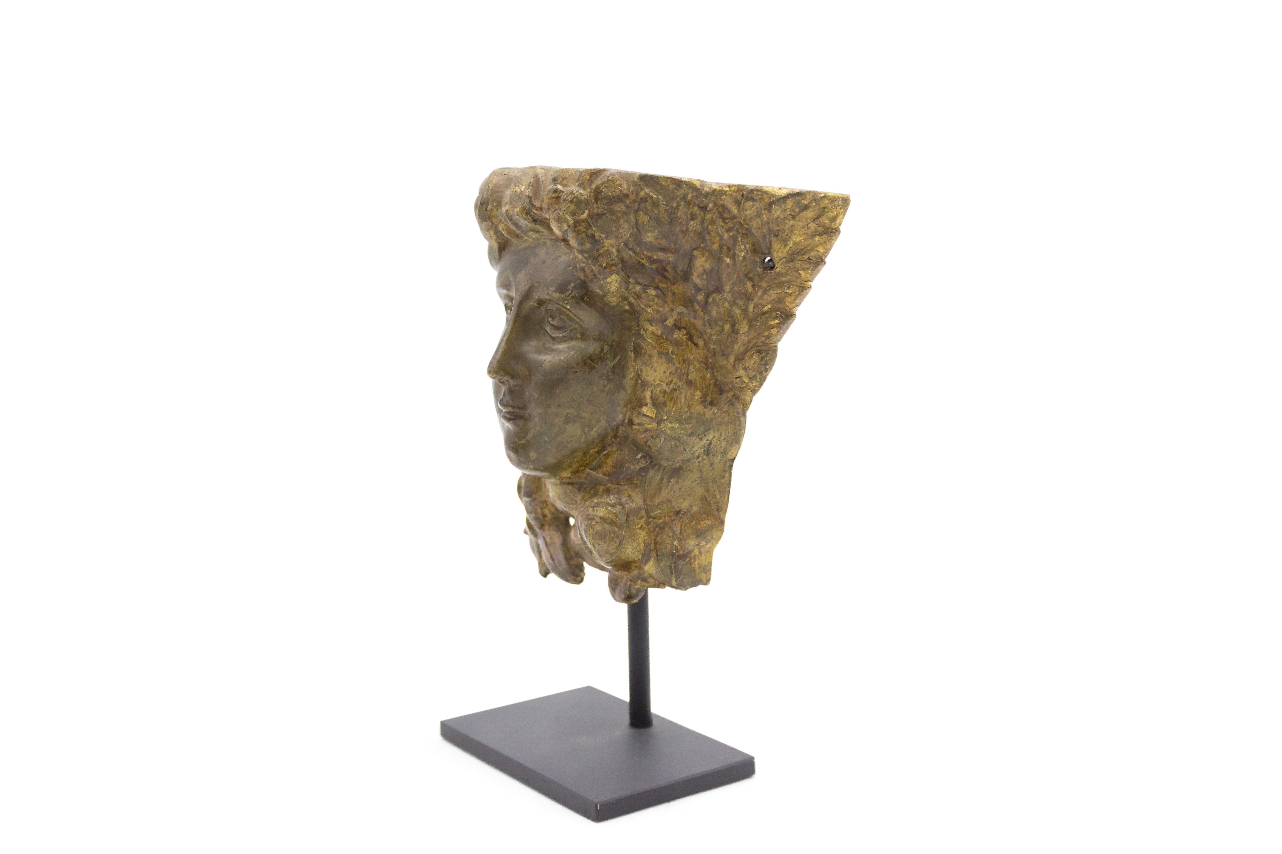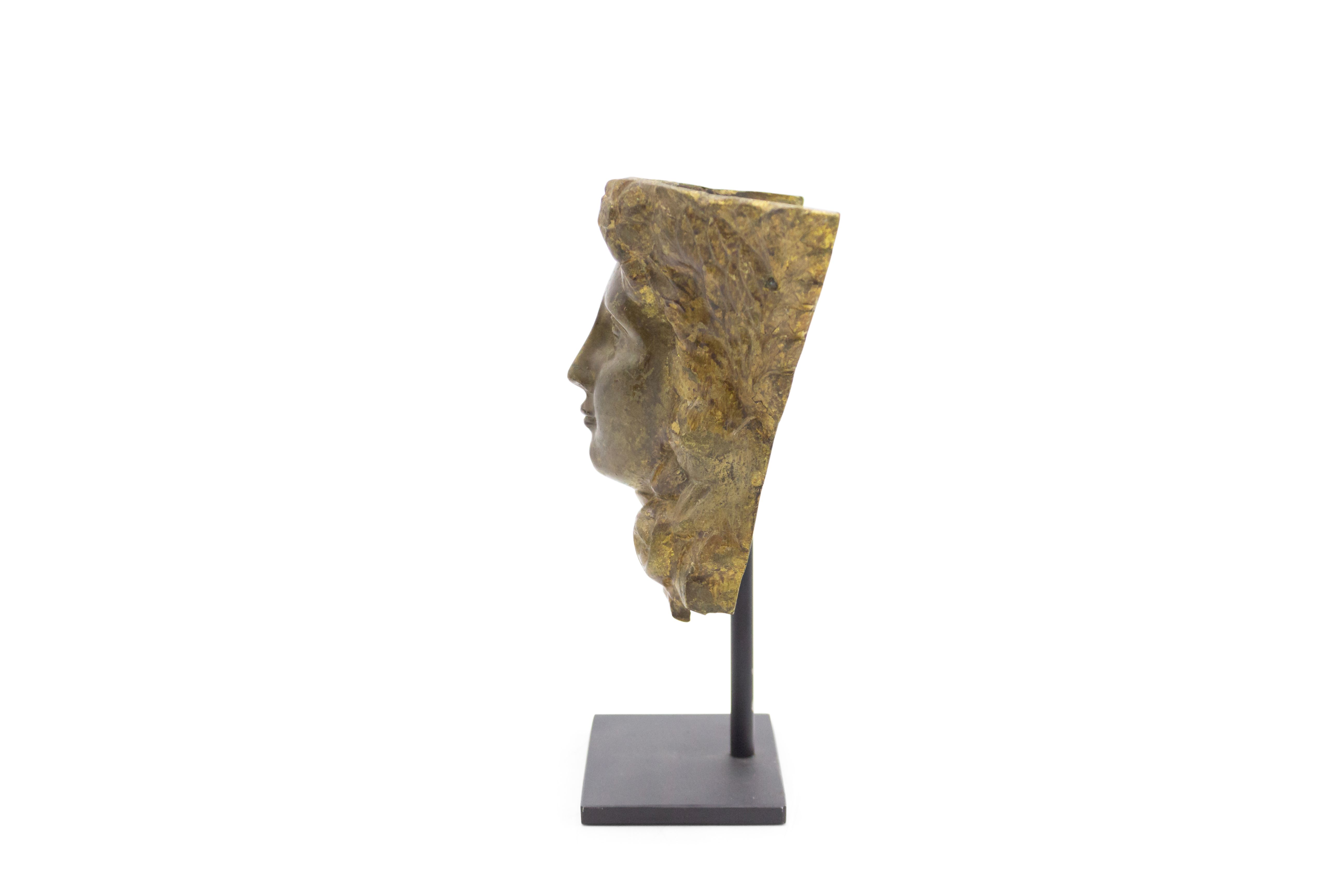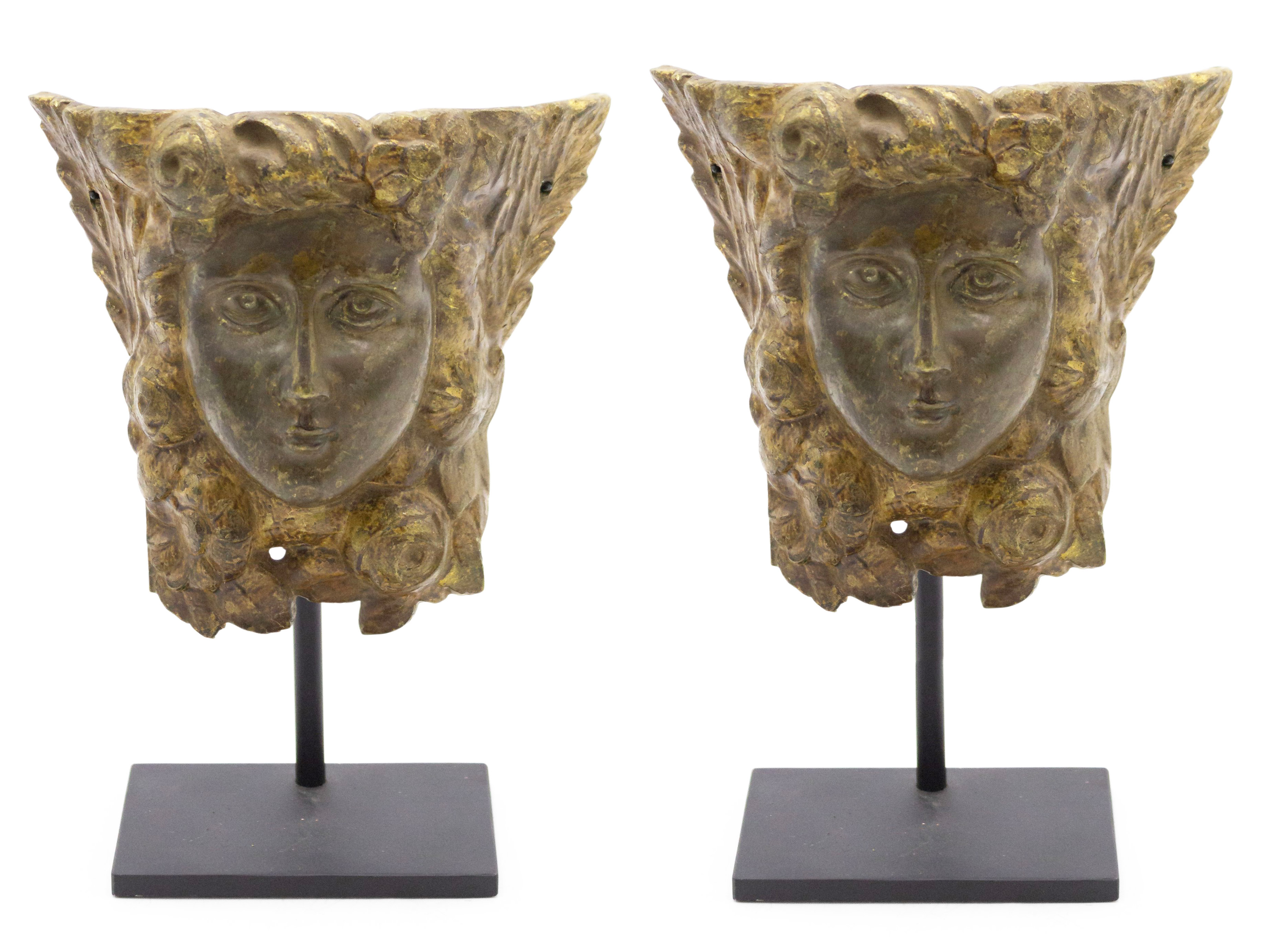 Italian Neo-classic (19th Cent) bronze masks of a classical woman's face mounted on a modern ebonized metal rectangular base. (PRICED EACH)