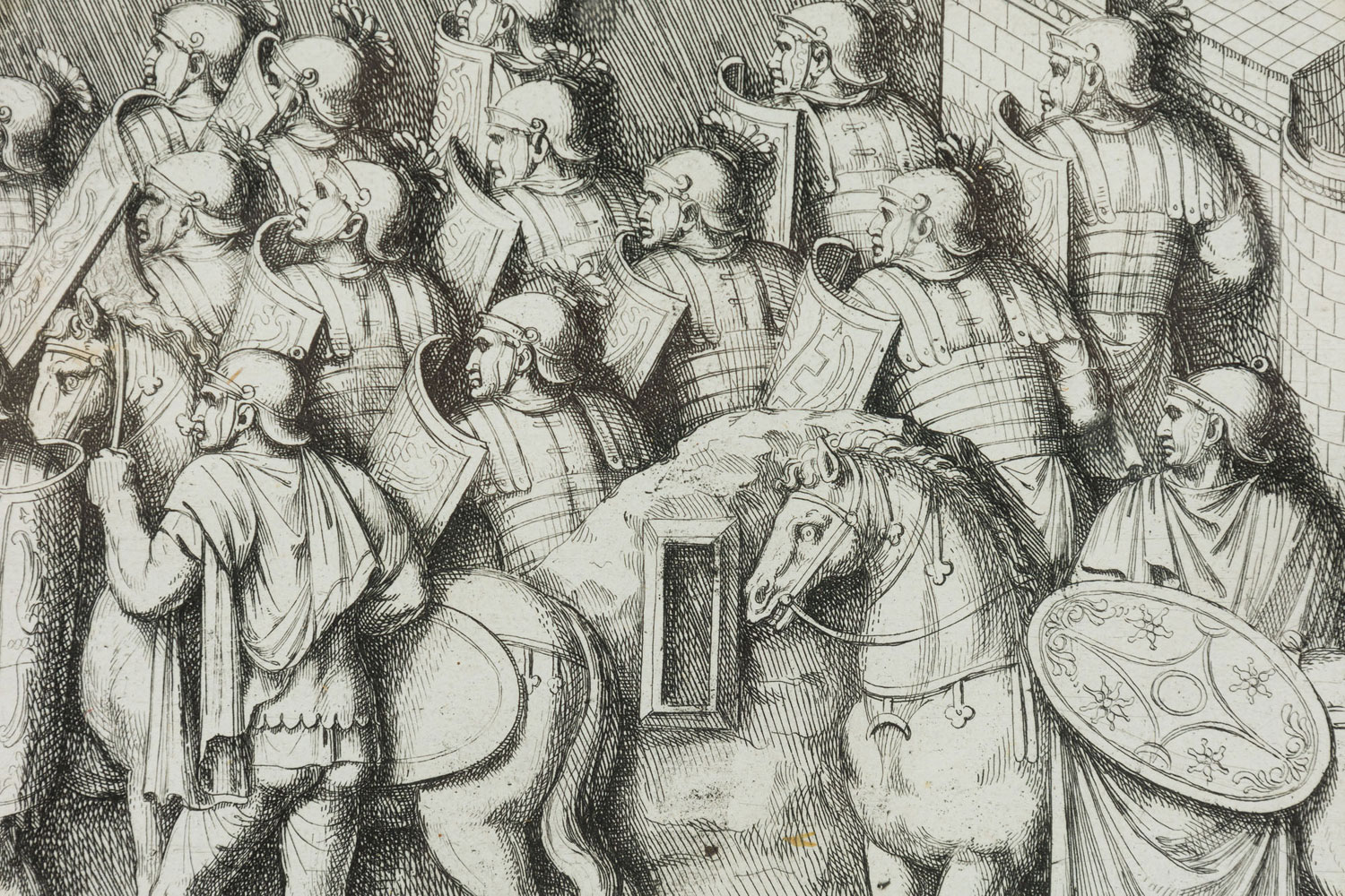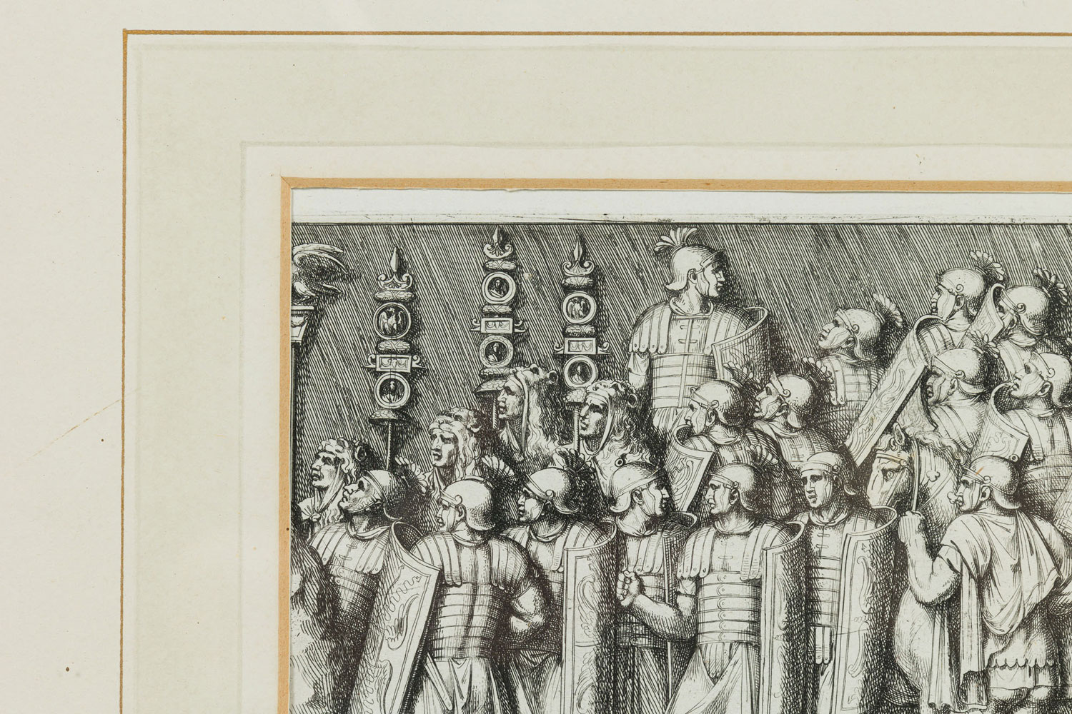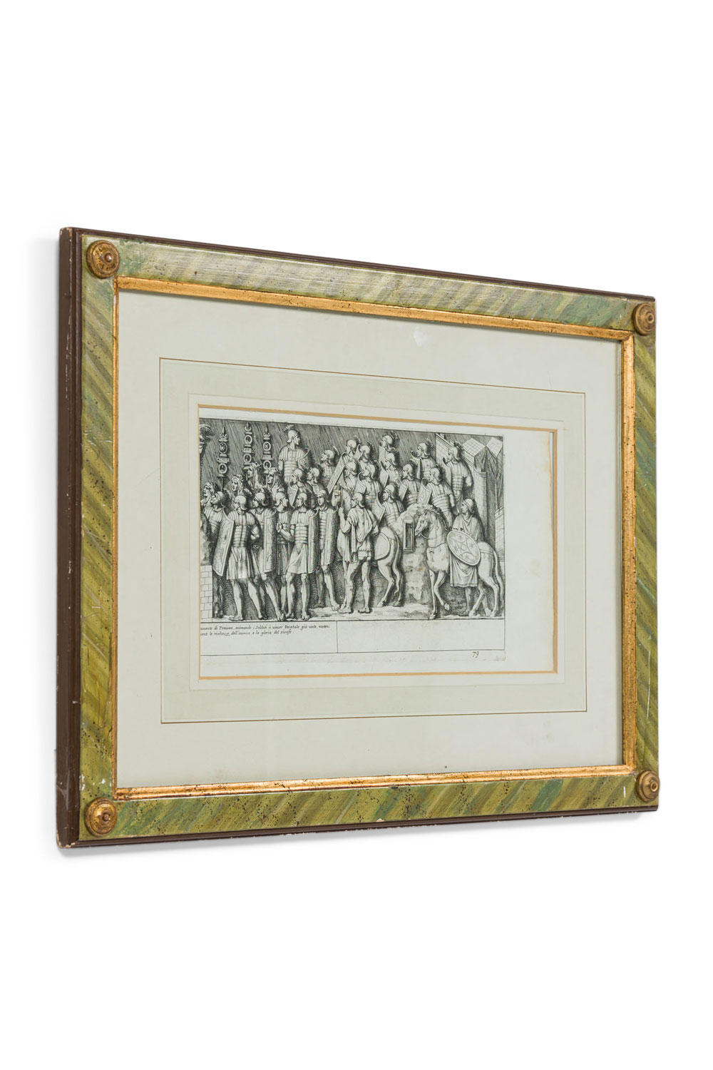 Italian Neo-classic style prints of various ancient Roman historical scenes matted in a green painted and gold trim frame (part of a set of 15; associated Pieces: 040102A-O)