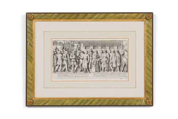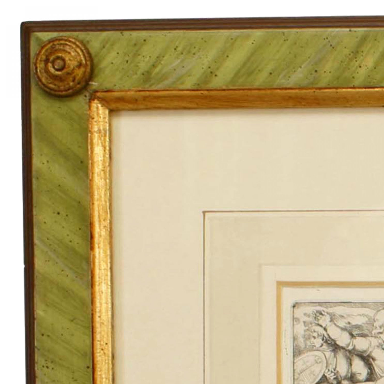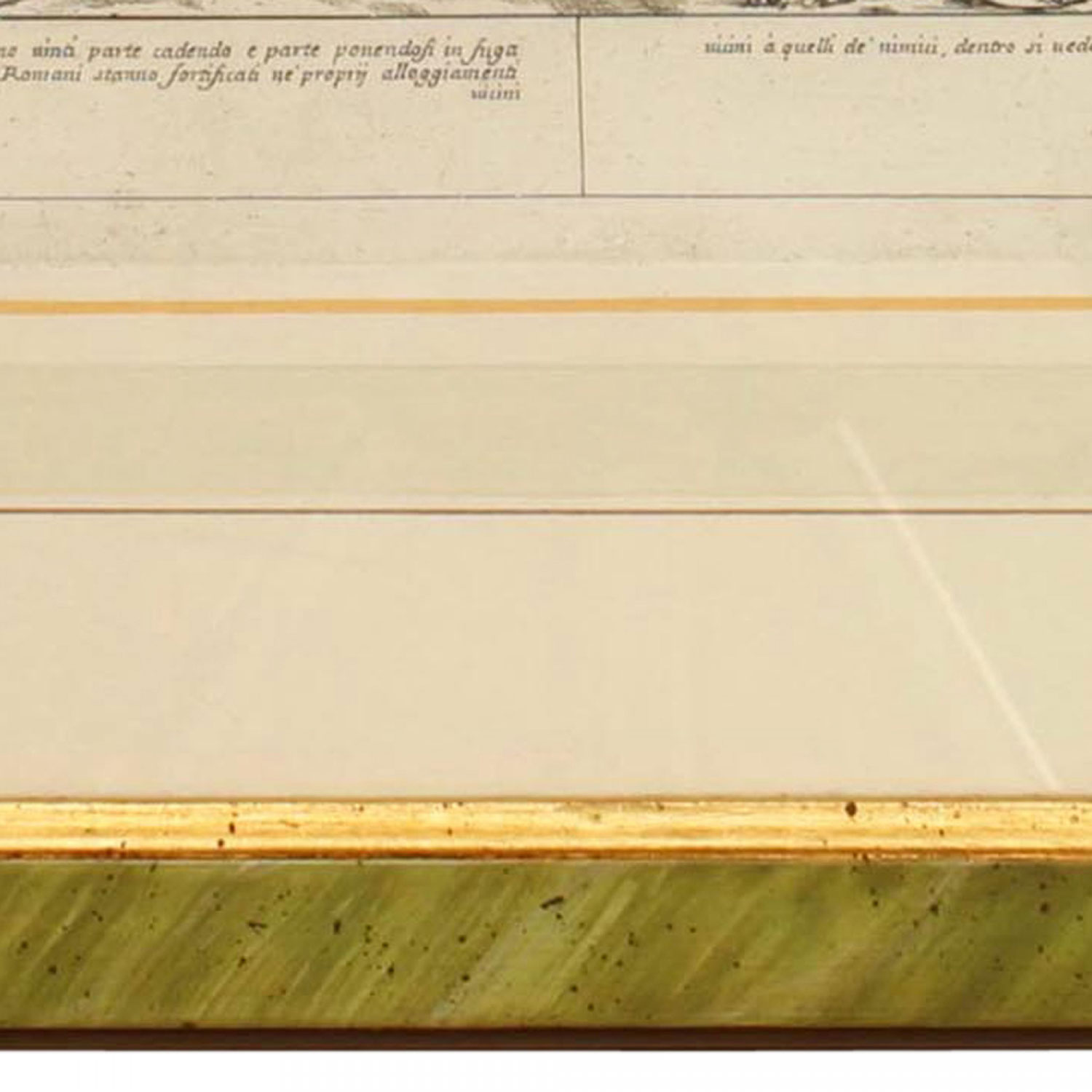 Italian Neo-classic style prints of various ancient Roman historical scenes matted in a green painted and gold trim frame (part of a set of 15; associated pieces: 040102A-O)