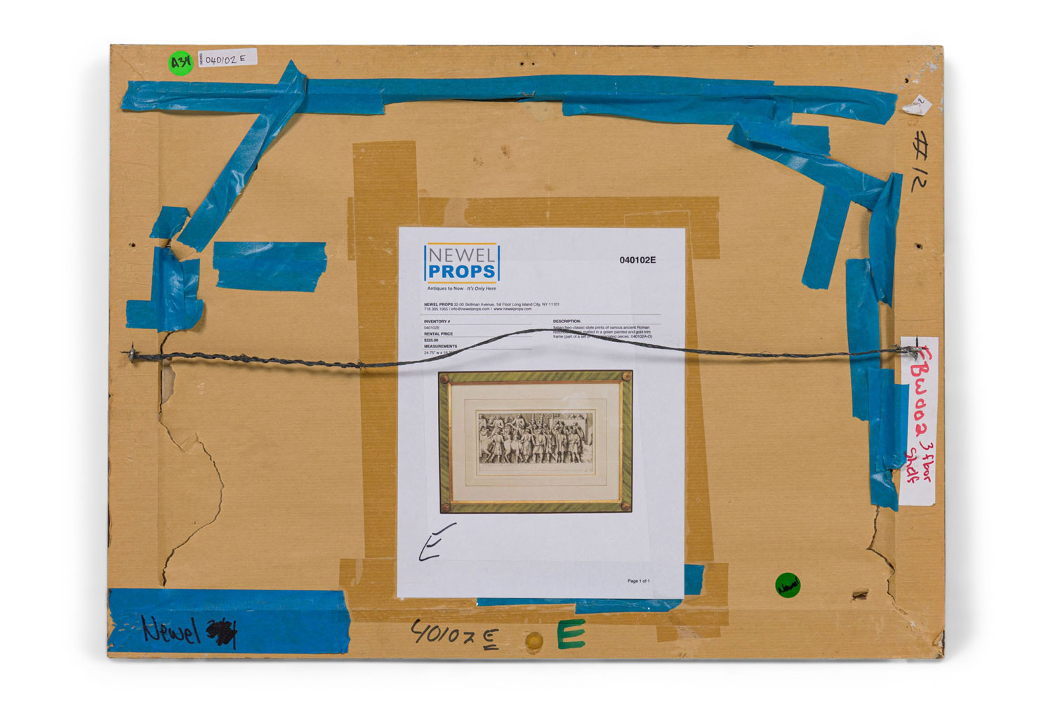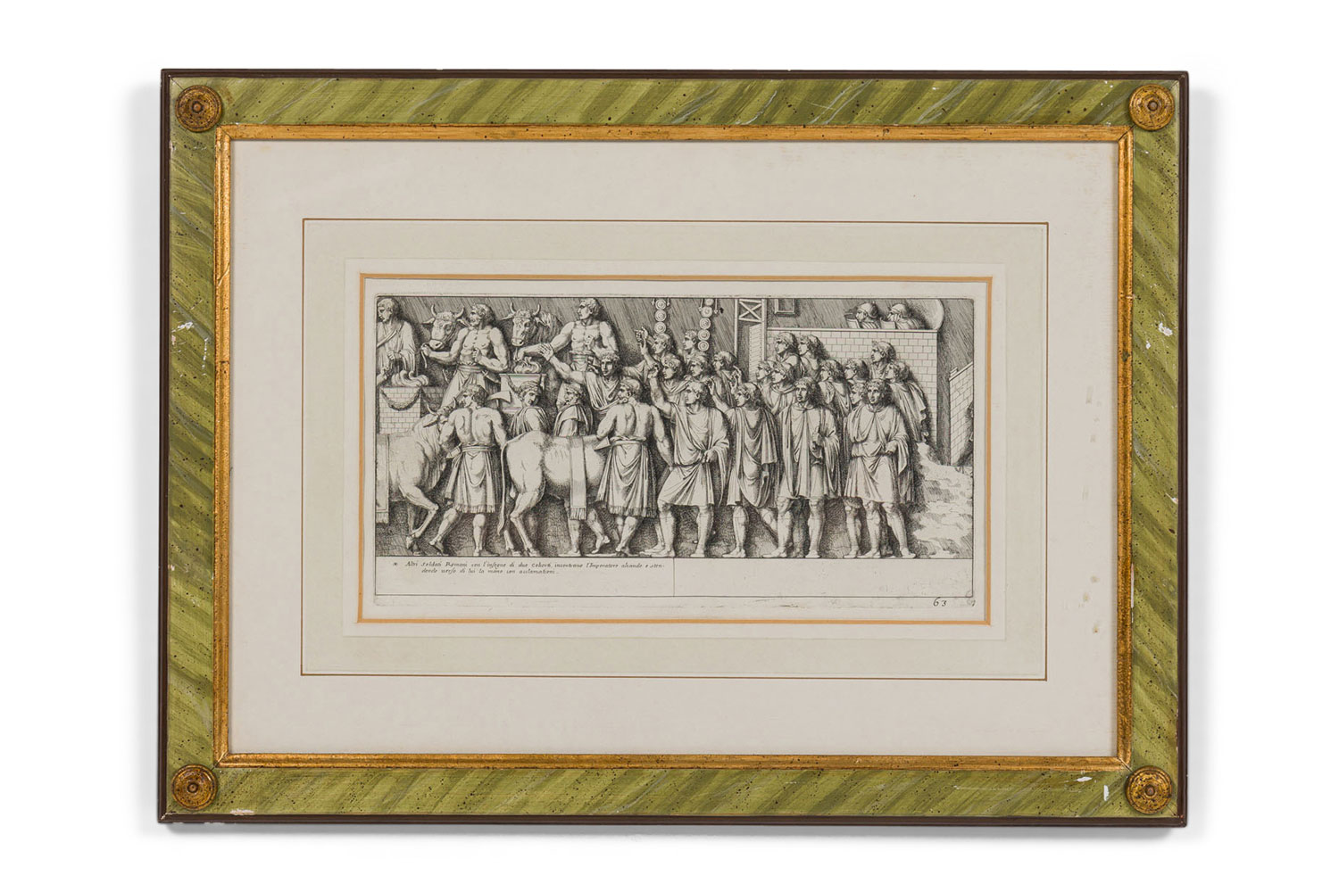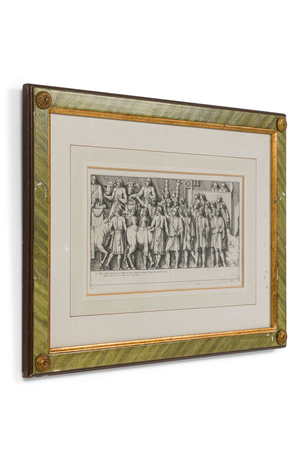 Italian Neo-classic style prints of various ancient Roman historical scenes matted in a green painted and gold trim frame (part of a set of 15; associated pieces: 040102A-O)