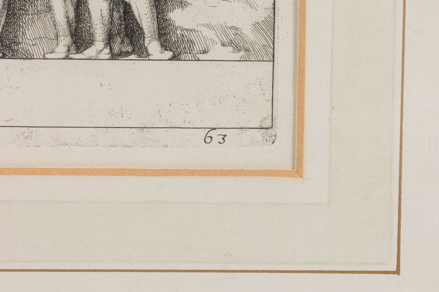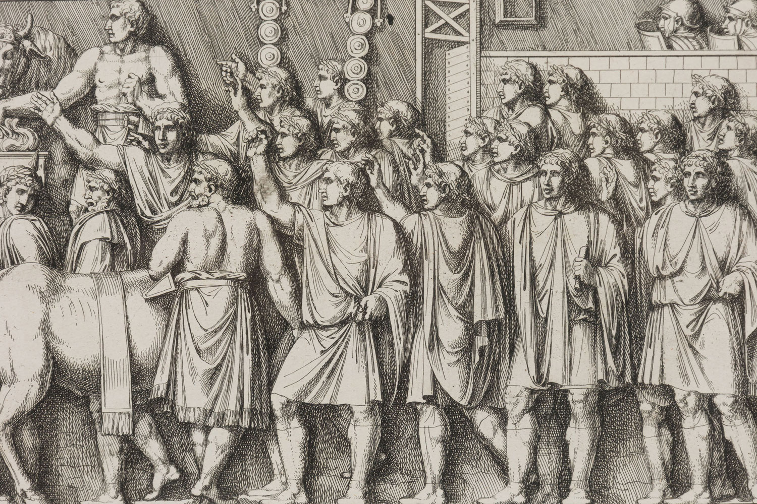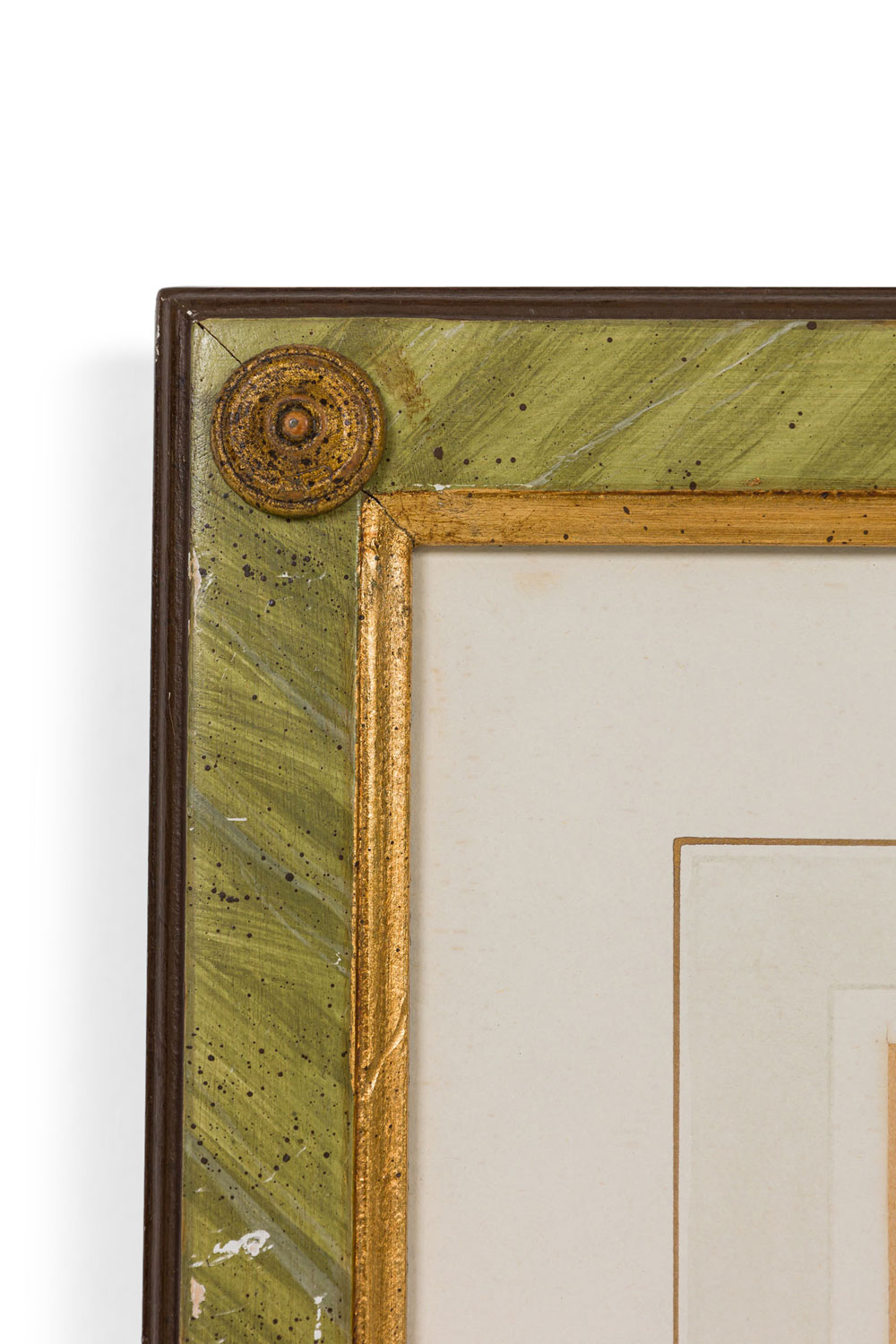 Italian Neo-classic style prints of various ancient Roman historical scenes matted in a green painted and gold trim frame (part of a set of 15; associated pieces: 040102A-O)