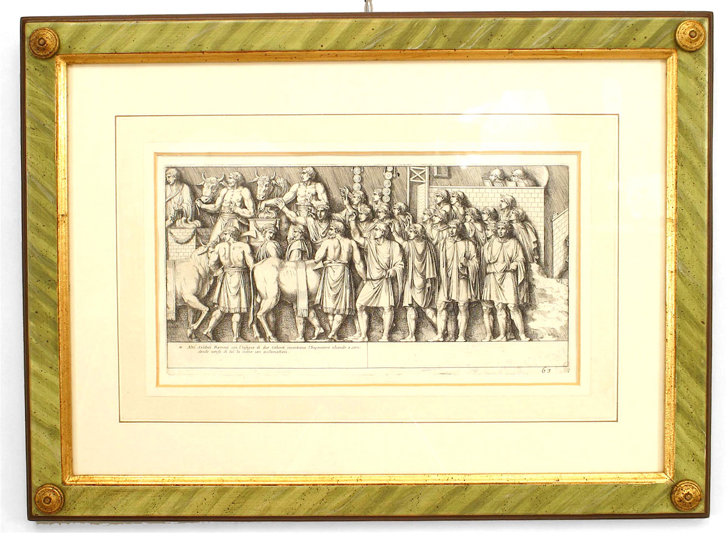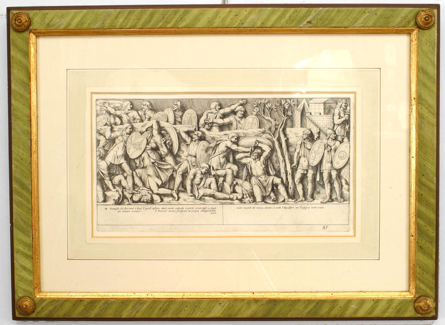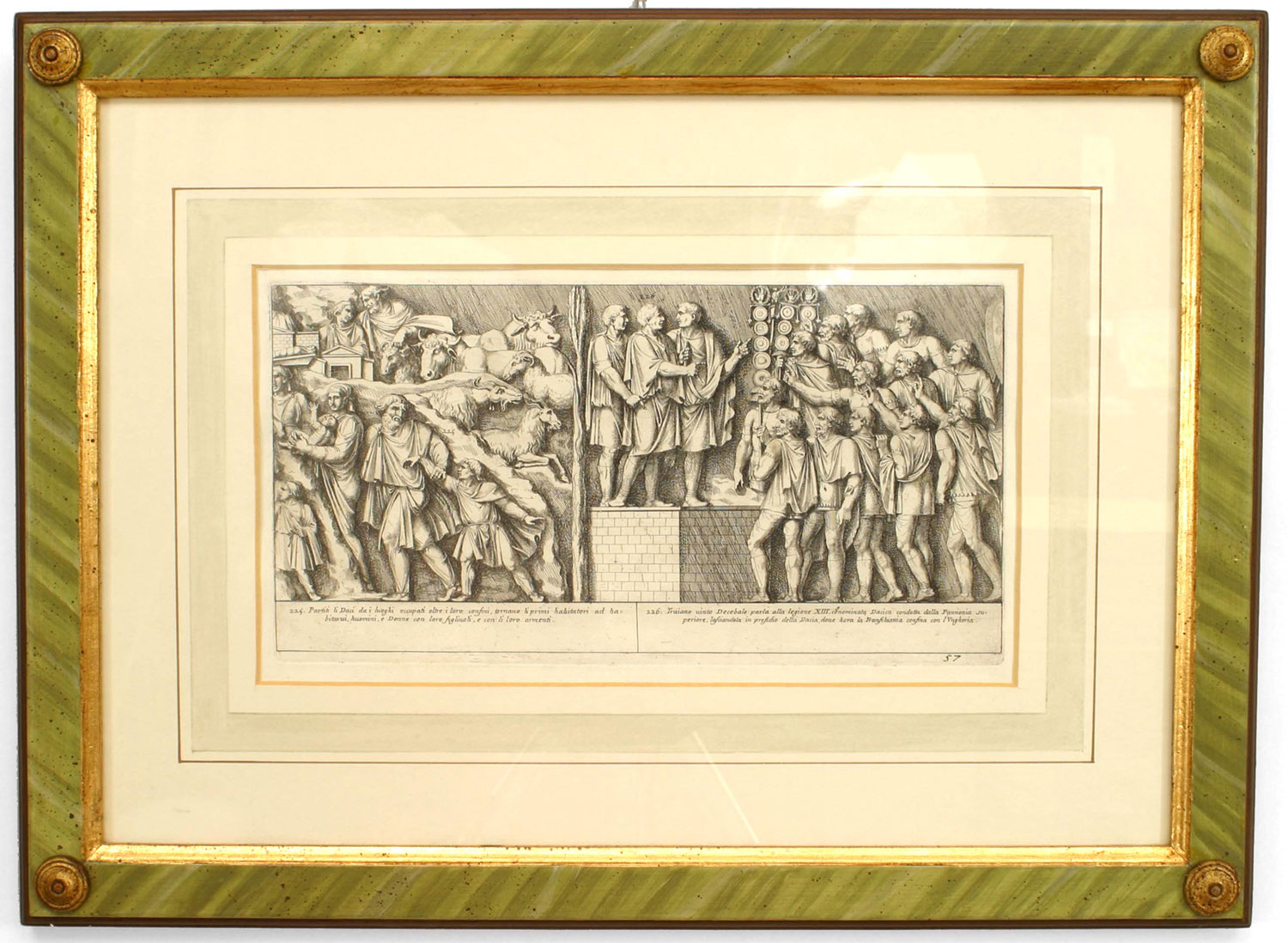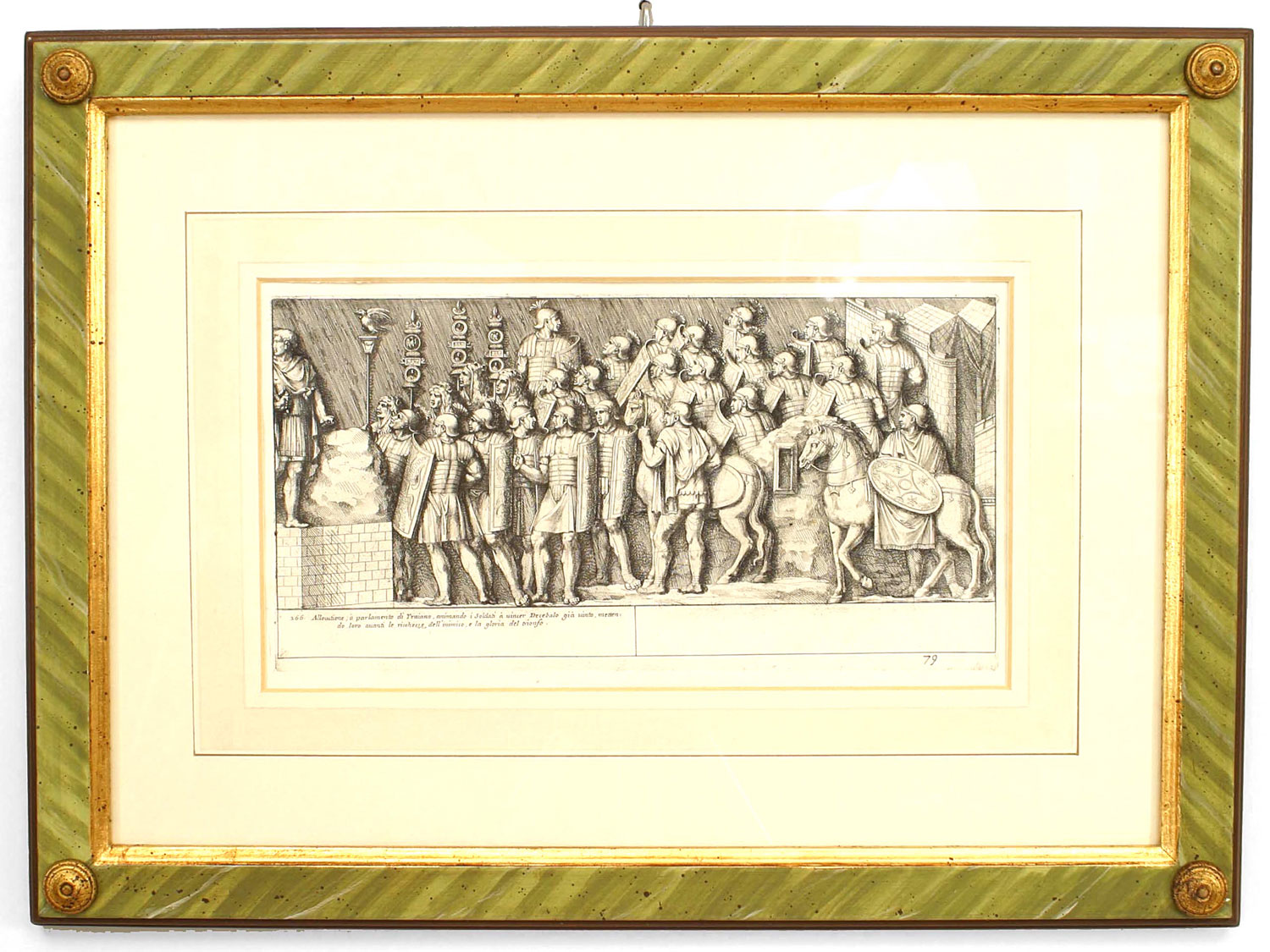 15 Italian Neo-classic style prints of various ancient Roman historical scenes matted in a green painted and gold trim frame (available individually 041020A-O; PRICED EACH).
