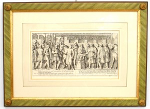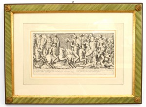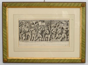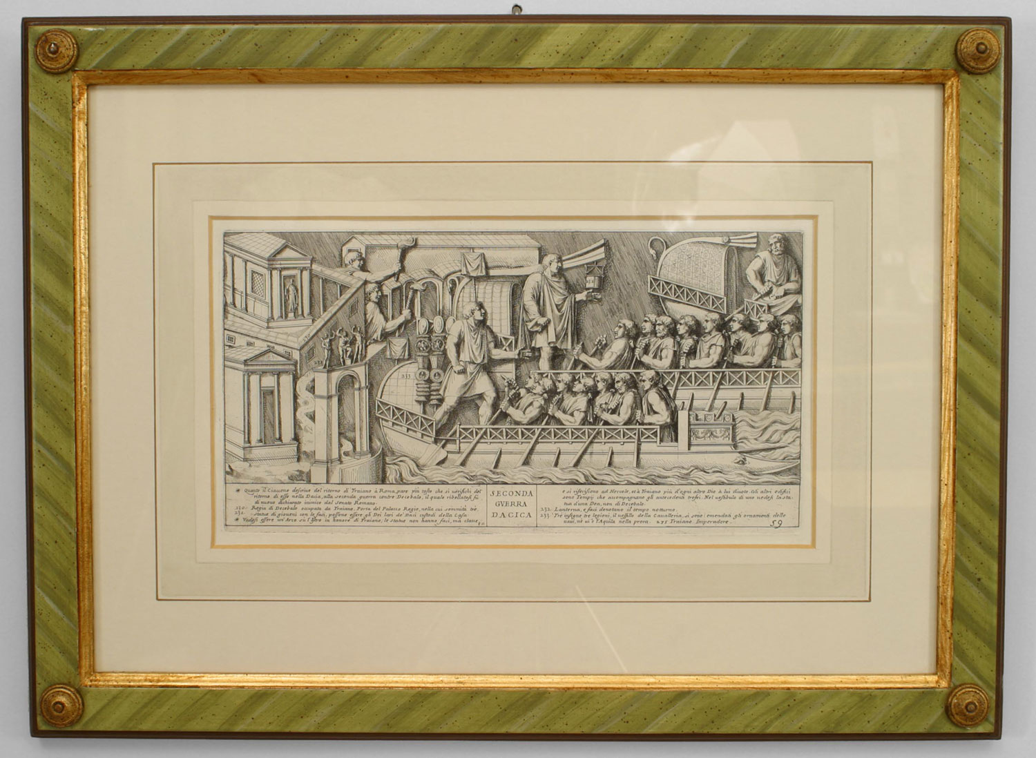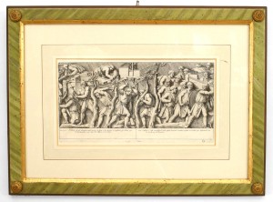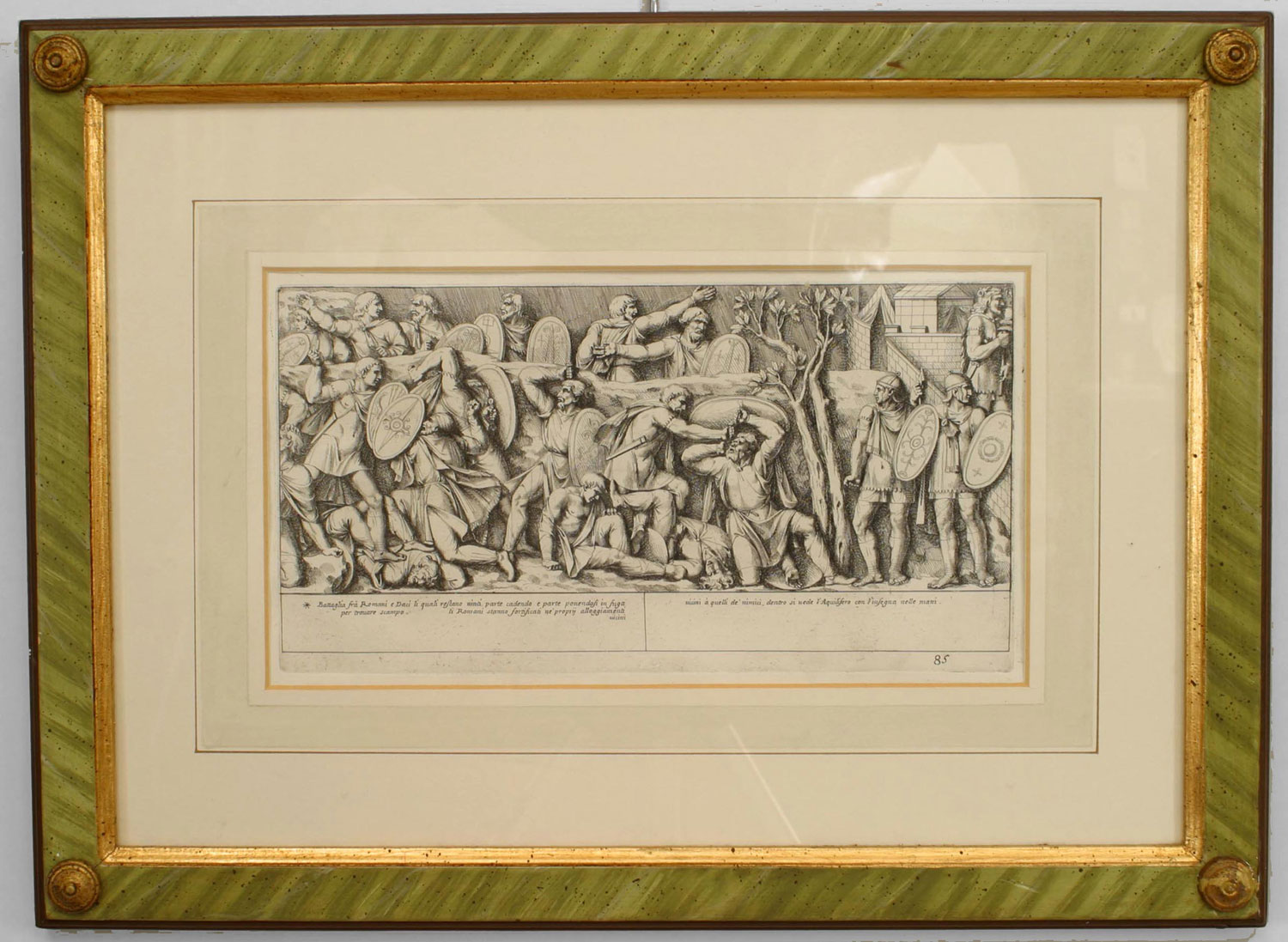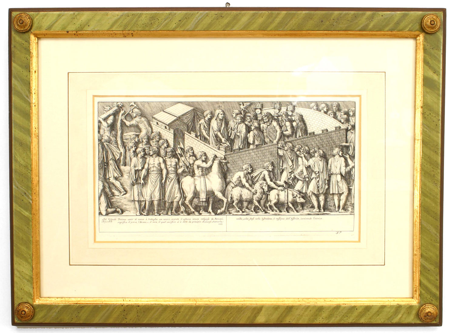 15 Italian Neo-classic style prints of various ancient Roman historical scenes matted in a green painted and gold trim frame (available individually 041020A-O; PRICED EACH).