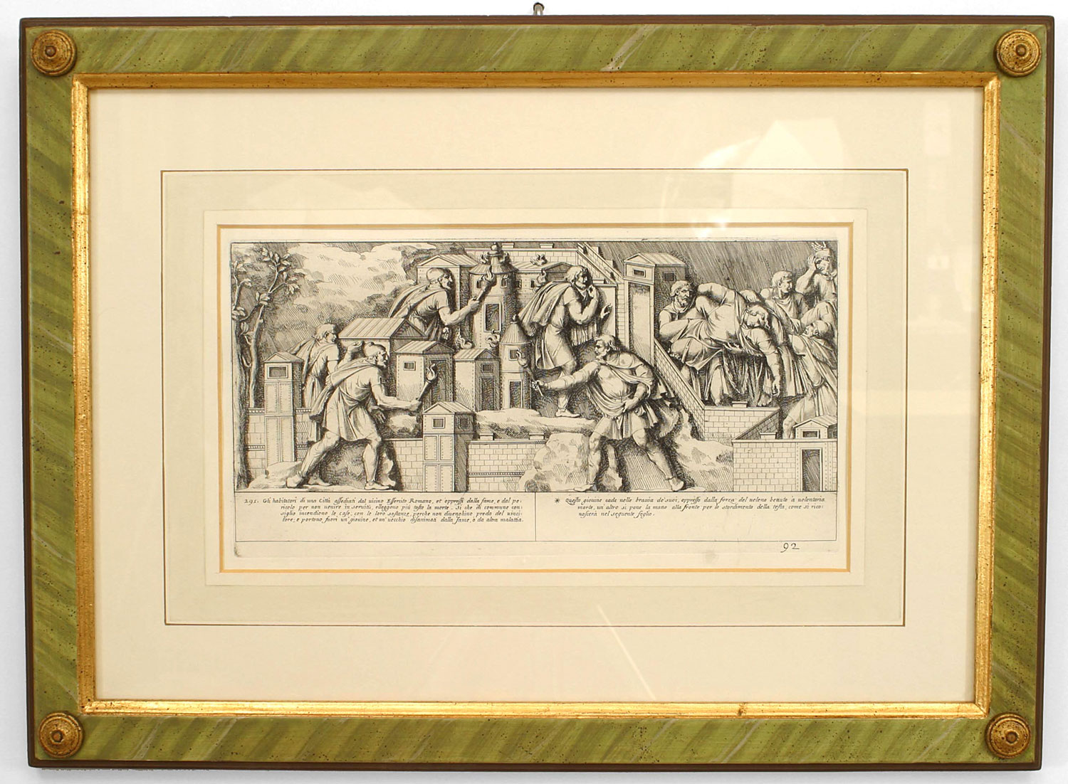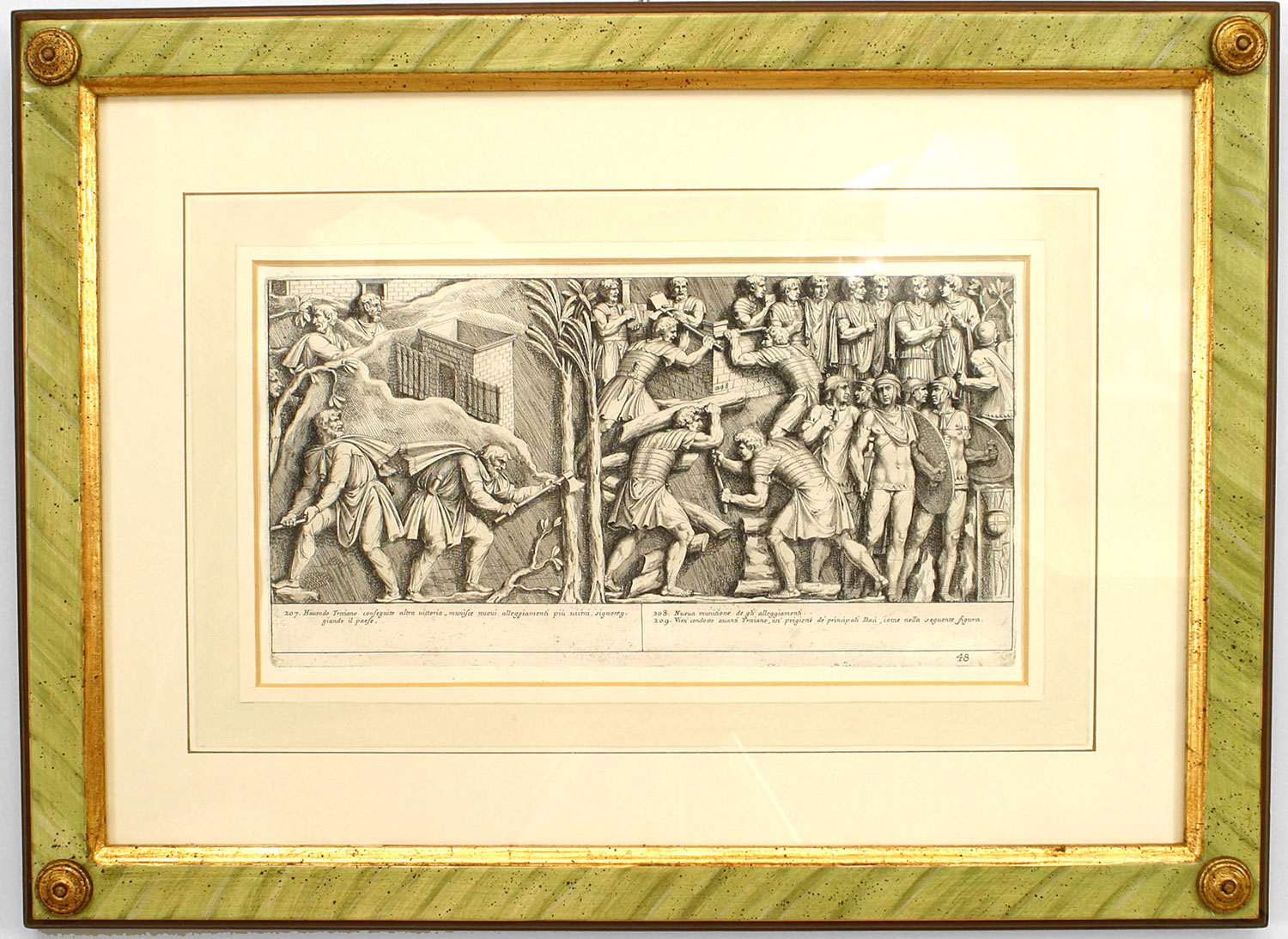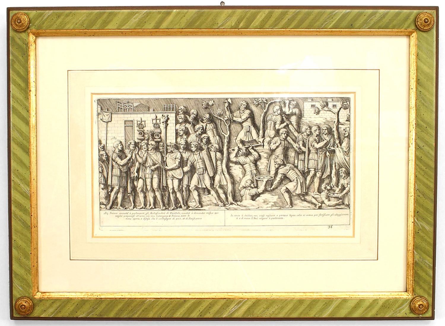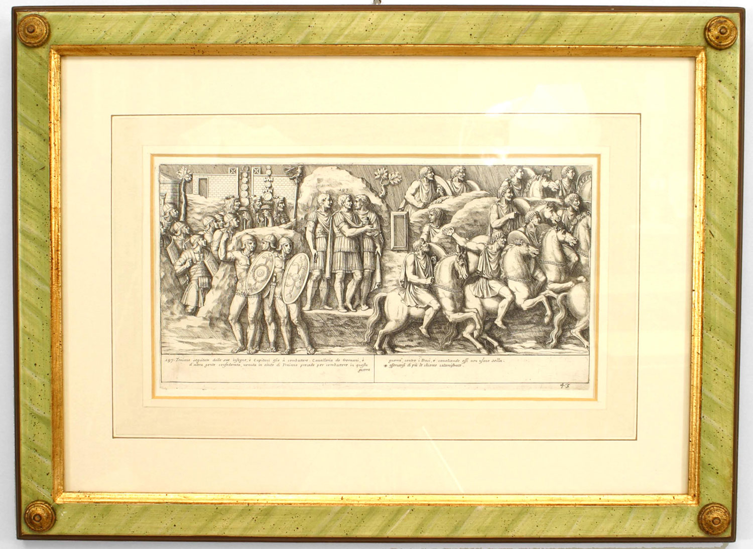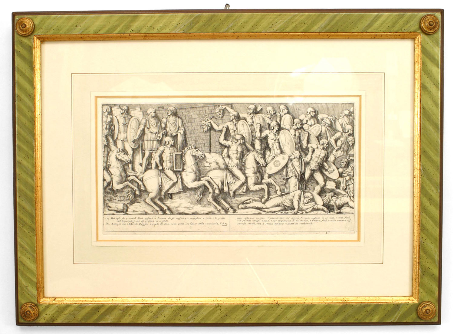 15 Italian Neo-classic style prints of various ancient Roman historical scenes matted in a green painted and gold trim frame (available individually 041020A-O; PRICED EACH)