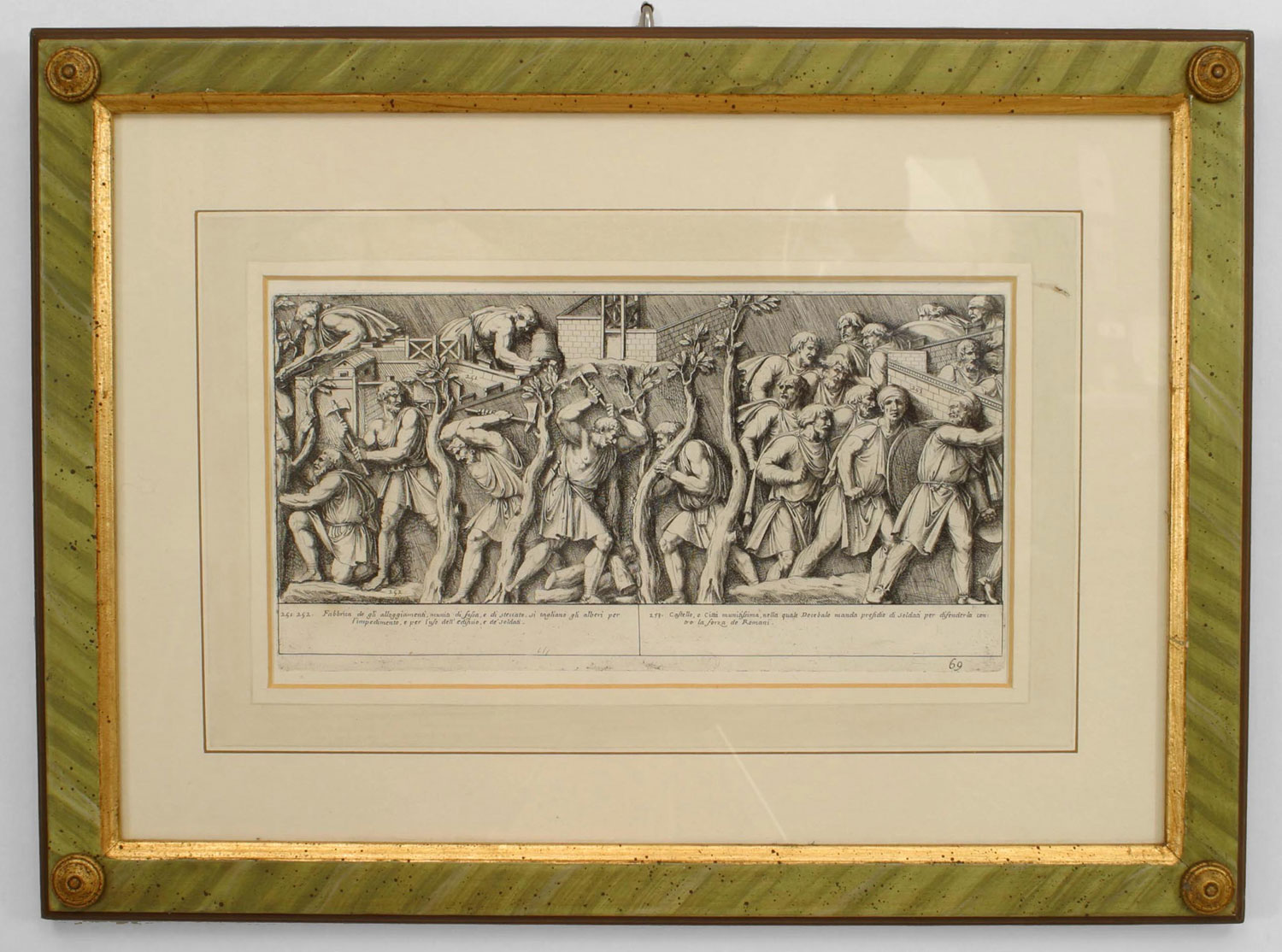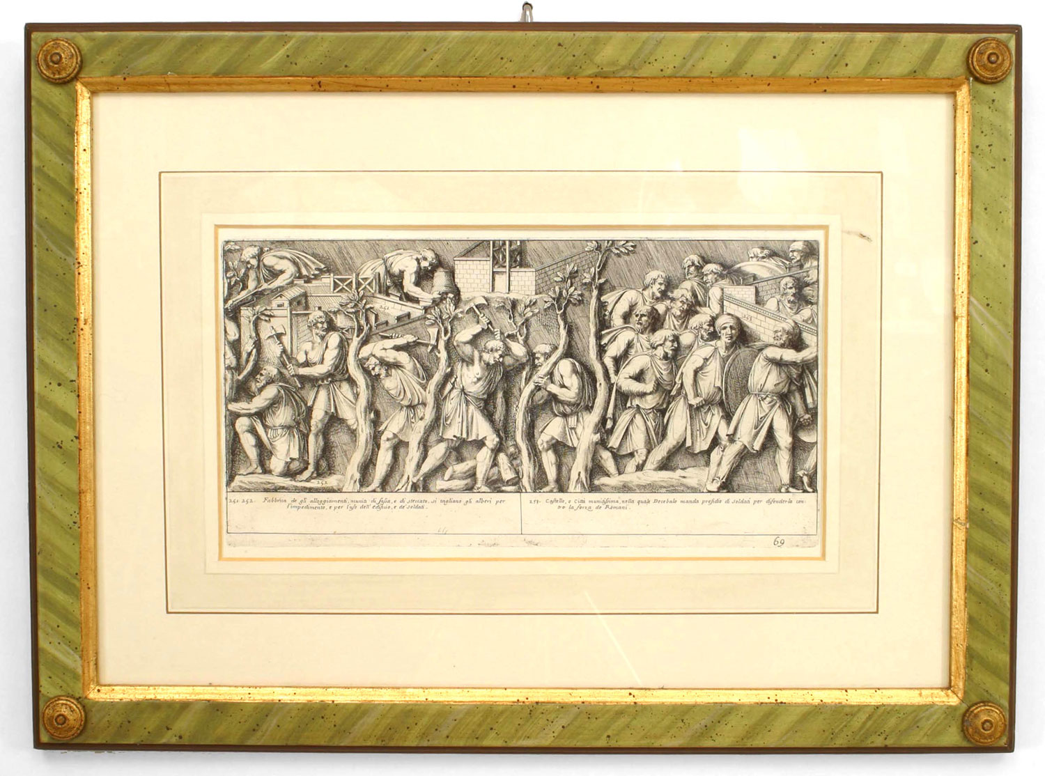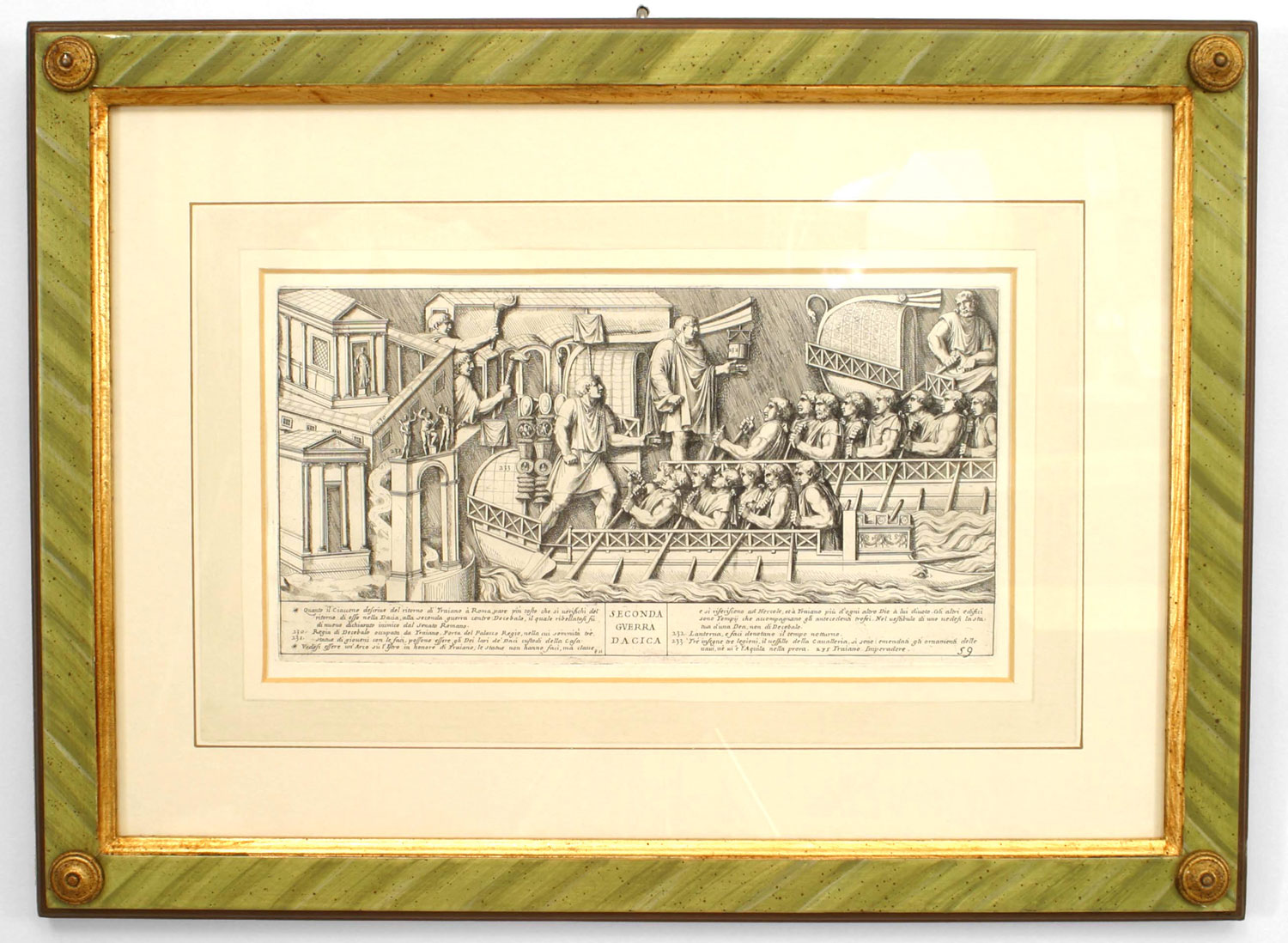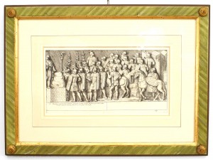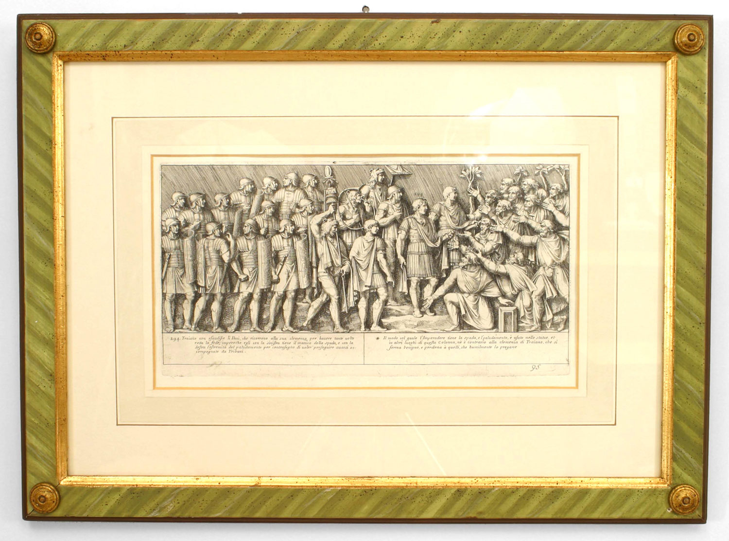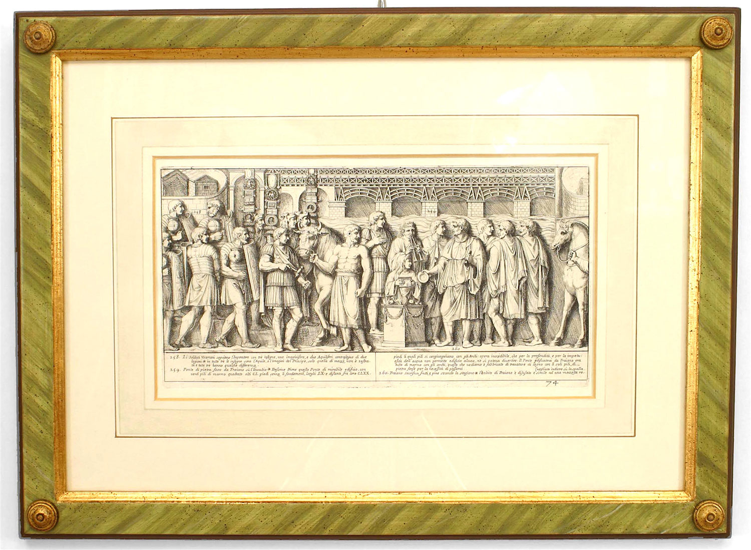 15 Italian Neo-classic style prints of various ancient Roman historical scenes matted in a green painted and gold trim frame (available individually 041020A-O; PRICED EACH)