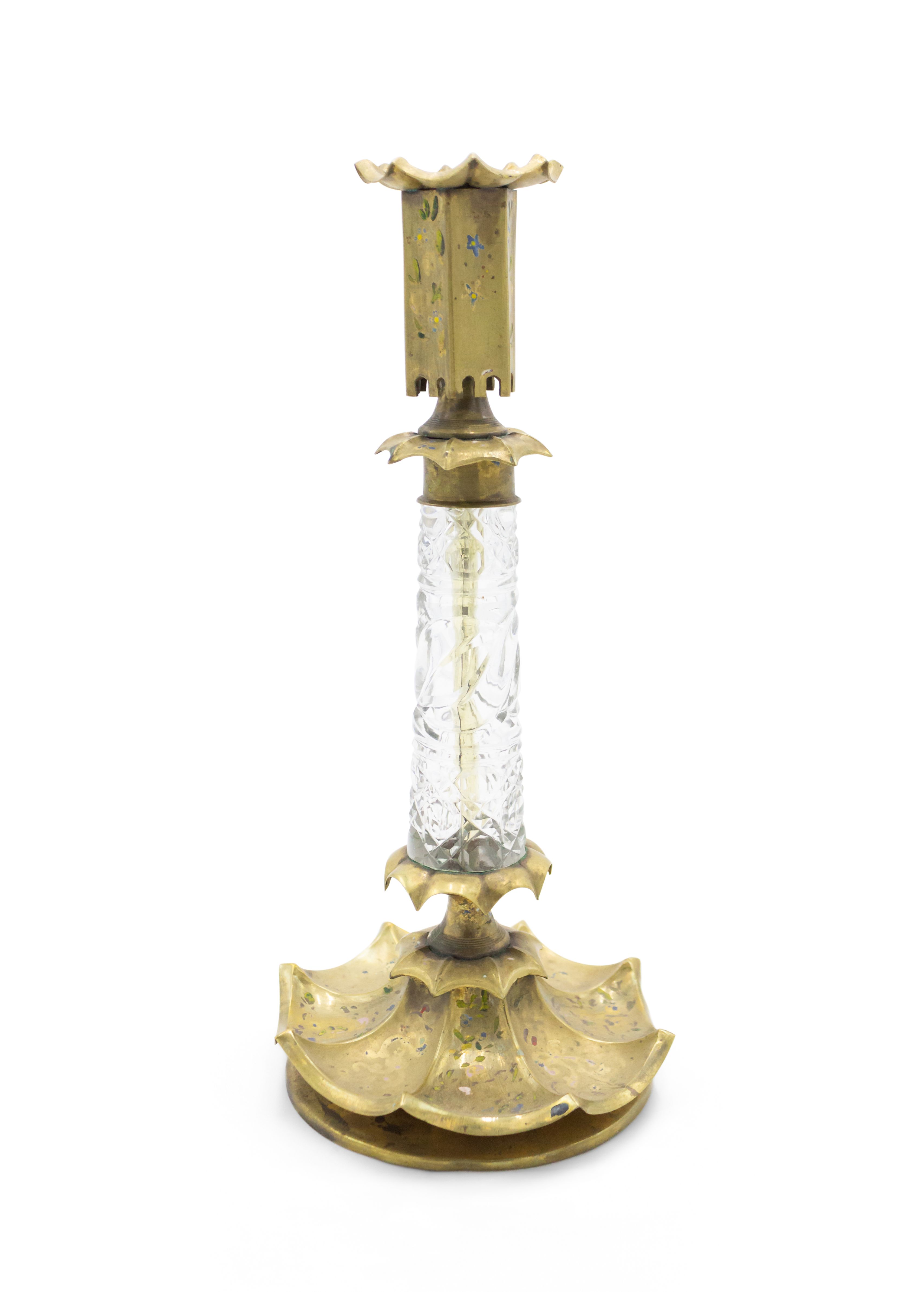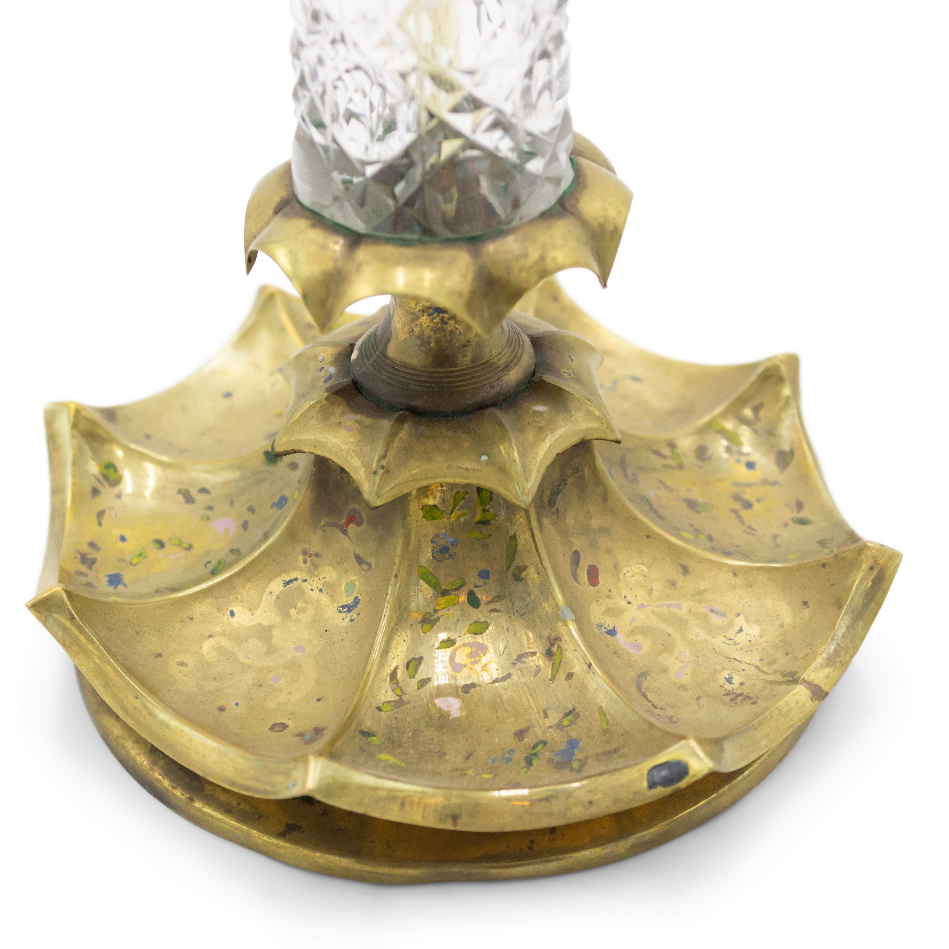 PAIR of North European Neo-classic (Possibly Russian19th Century) cut glass candlesticks with enamel decorated lacquered brass pagoda designed drip pan and base (PRICED AS PAIR).
