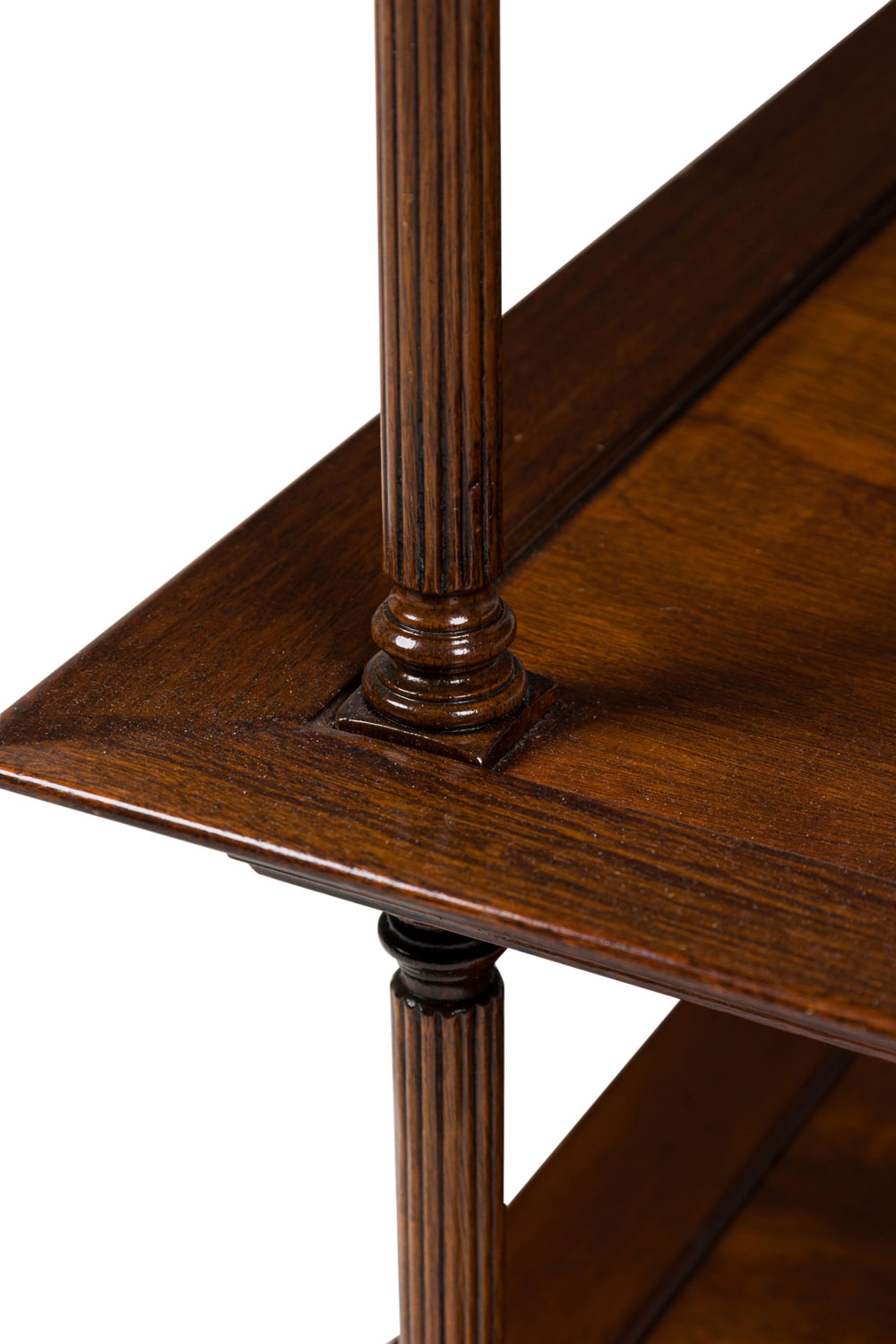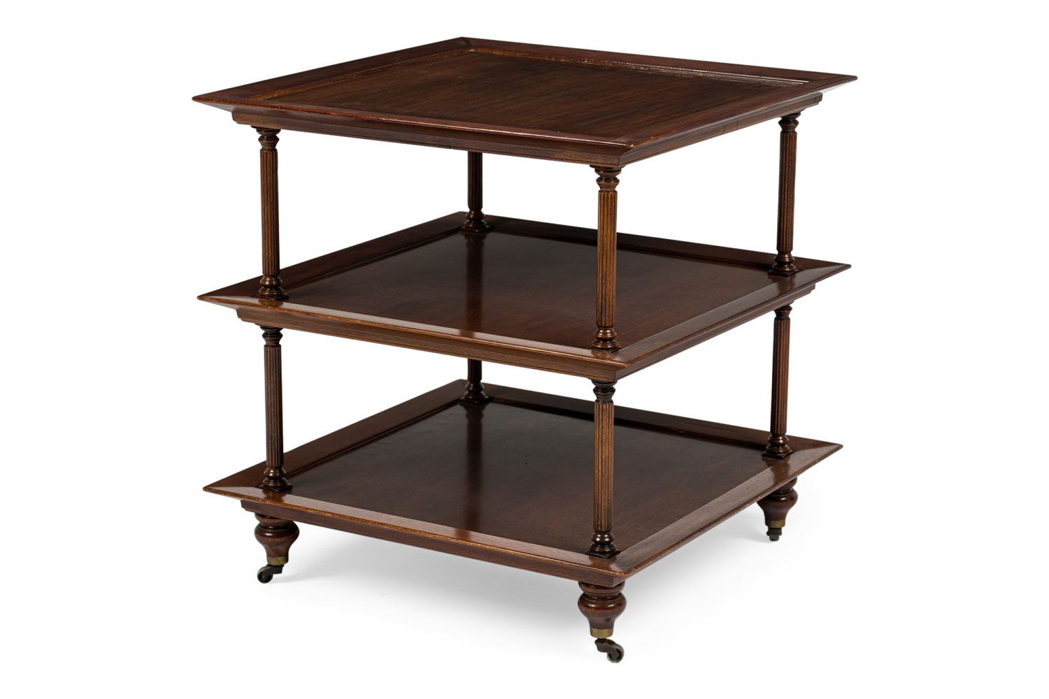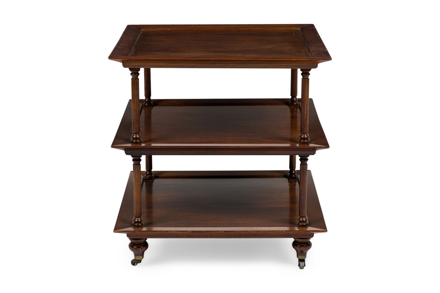 English Georgian style 3-tier walnut square end table partitioned by fluted column supports ending with four brass casters