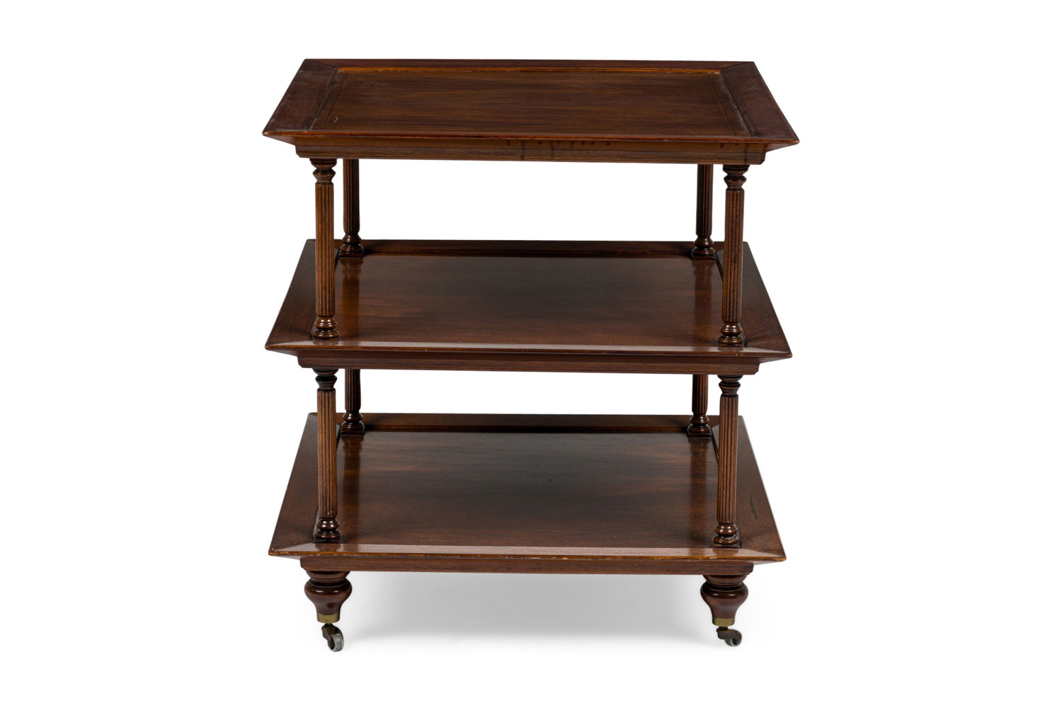 English Georgian style 3-tier walnut square end table partitioned by fluted column supports ending with four brass casters.