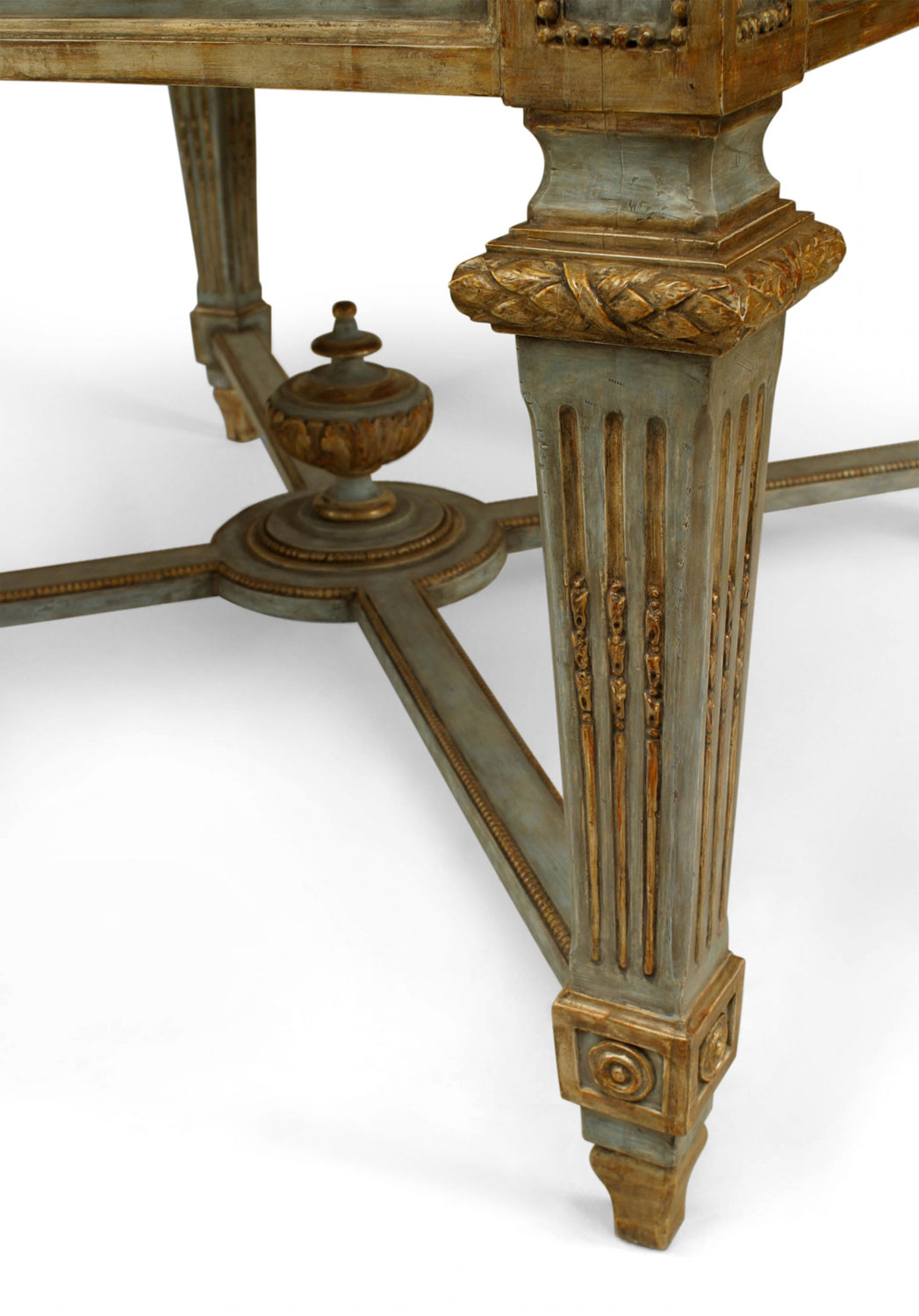 Northern Italian Neo-classic (late 18th Century) silver gilt & blue painted square center table with swags & masks on apron over tapered square legs with stretcher & faux painted marble top.