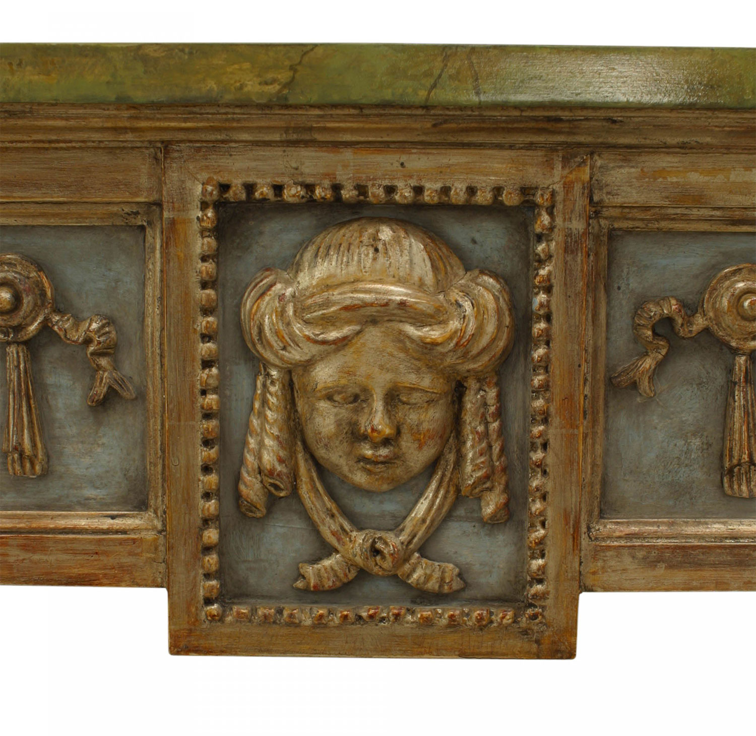 Northern Italian Neo-classic (late 18th Century) silver gilt & blue painted square center table with swags & masks on apron over tapered square legs with stretcher & faux painted marble top..