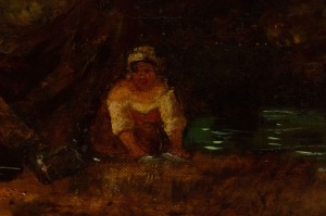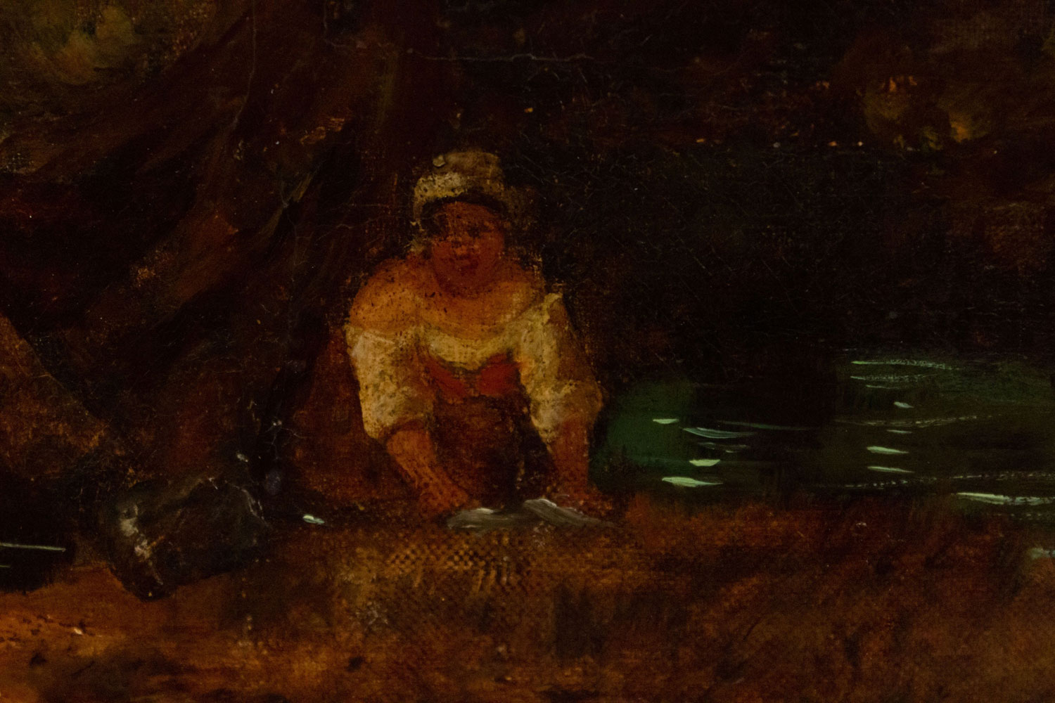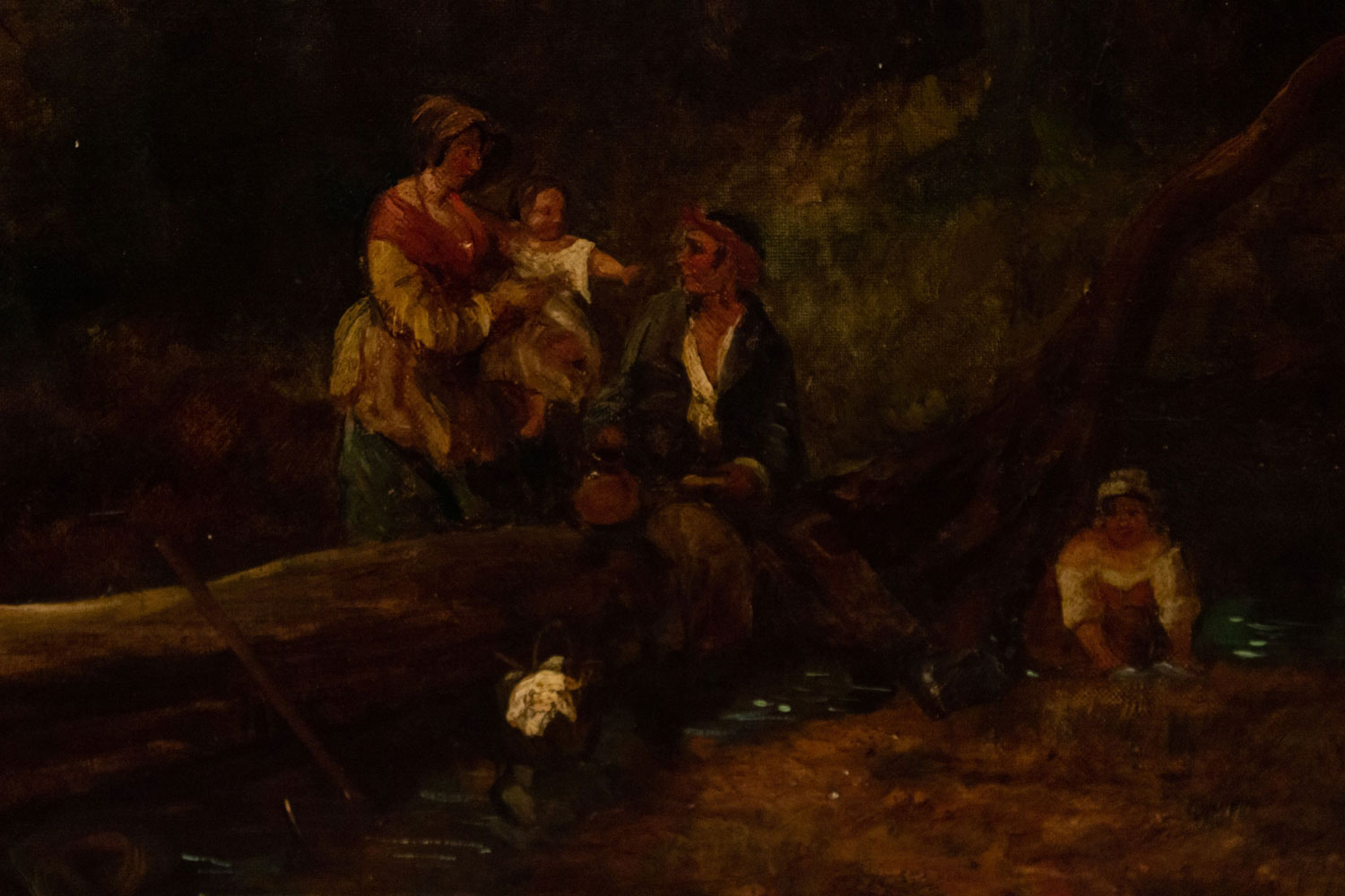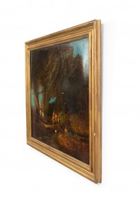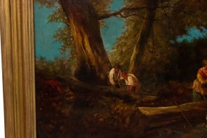 Gilt framed oil landscape painting of figures in forest by stream with fallen tree.