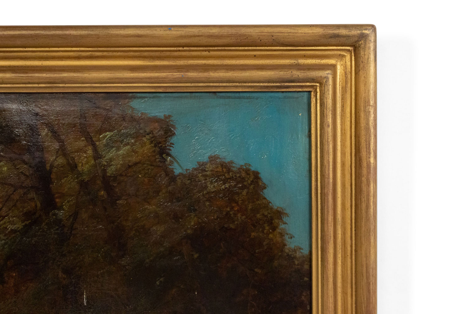 Gilt framed oil landscape painting of figures in forest by stream with fallen tree