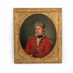 English Georgian (18/19th Cent) oil painting portrait of a young British officer with arms crossed wearing a red coat with gold epaulets in a gilt carved frame.