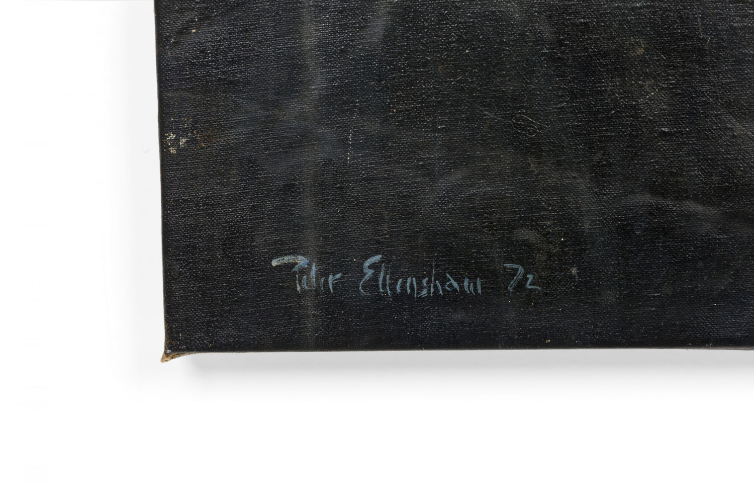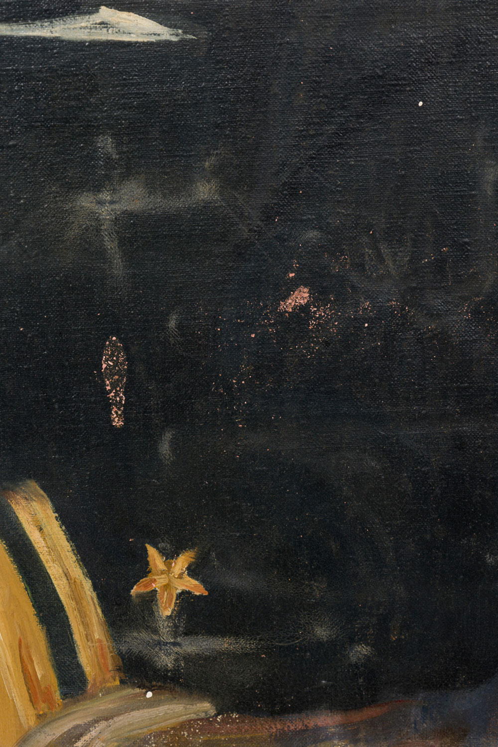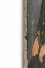 Style: Mid-Century Materials & Techniques: Beechwood, canvas, painted Category: Cleared Art Condition: Paint losses on face of portrait, damage to painted surface. Recently restretched. Fair; Minor structural damages