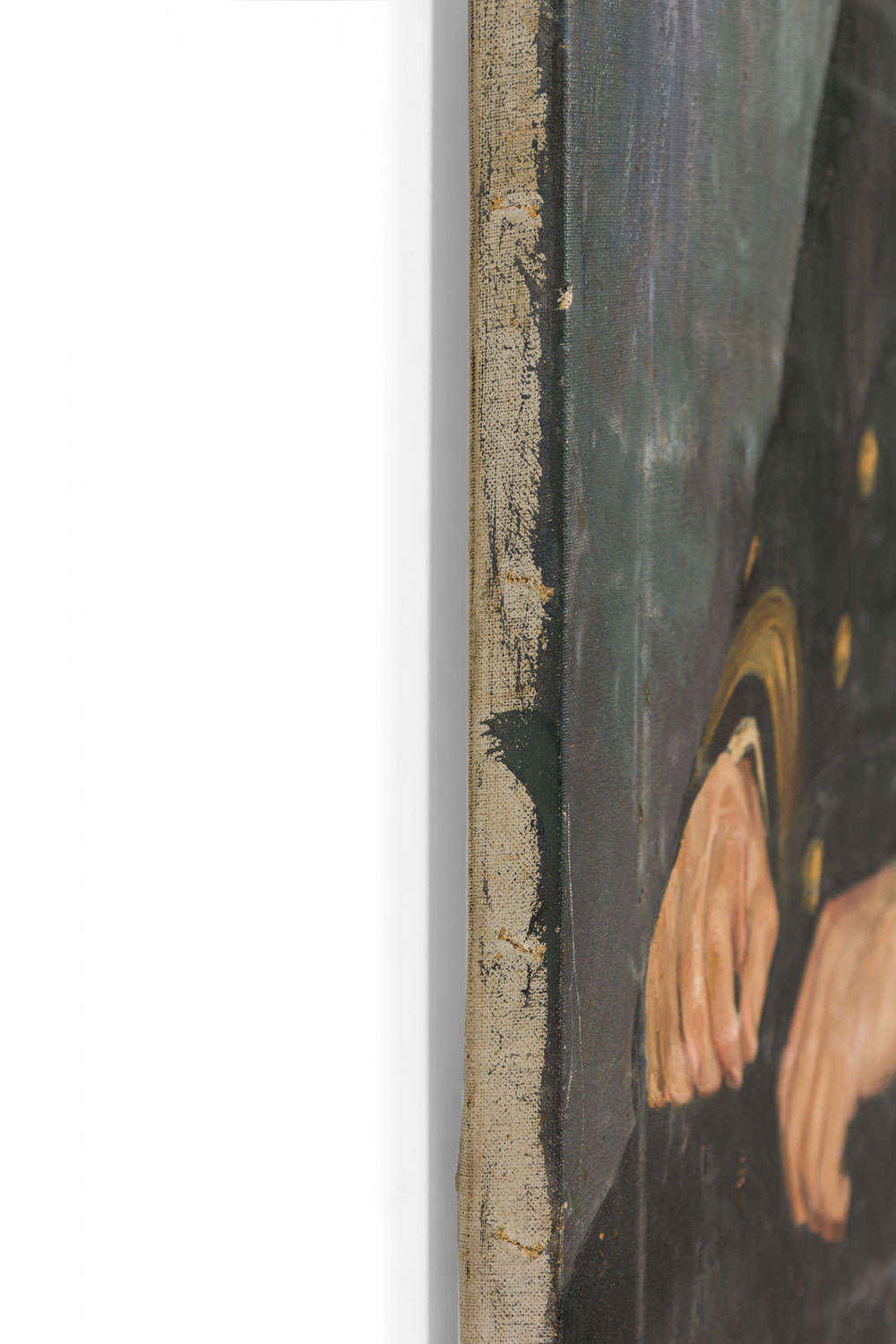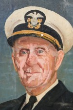 Vintage oil painting portrait depicting an American Naval officer in uniform seated against a blue and gray background, painted on stretched canvas..