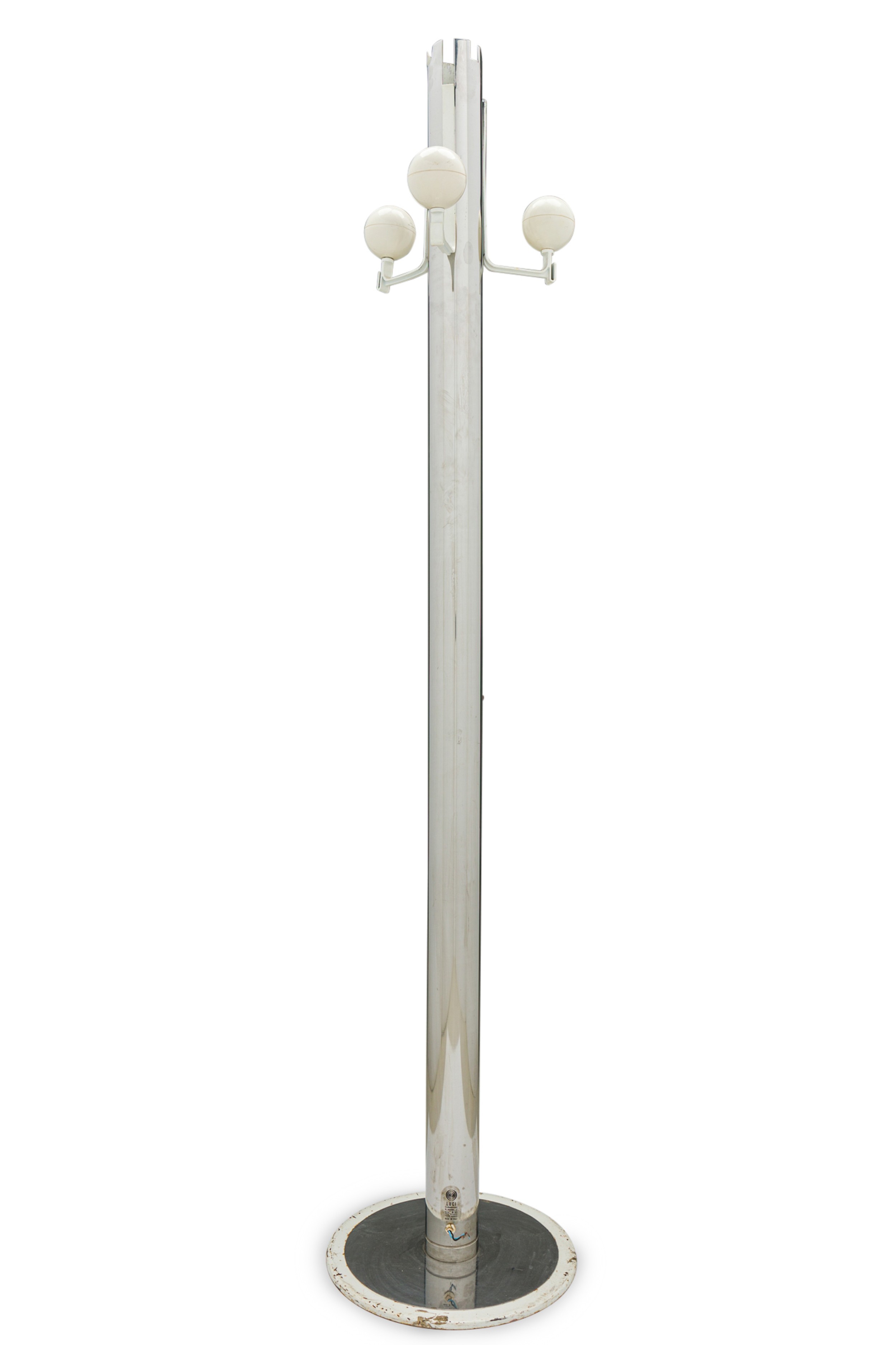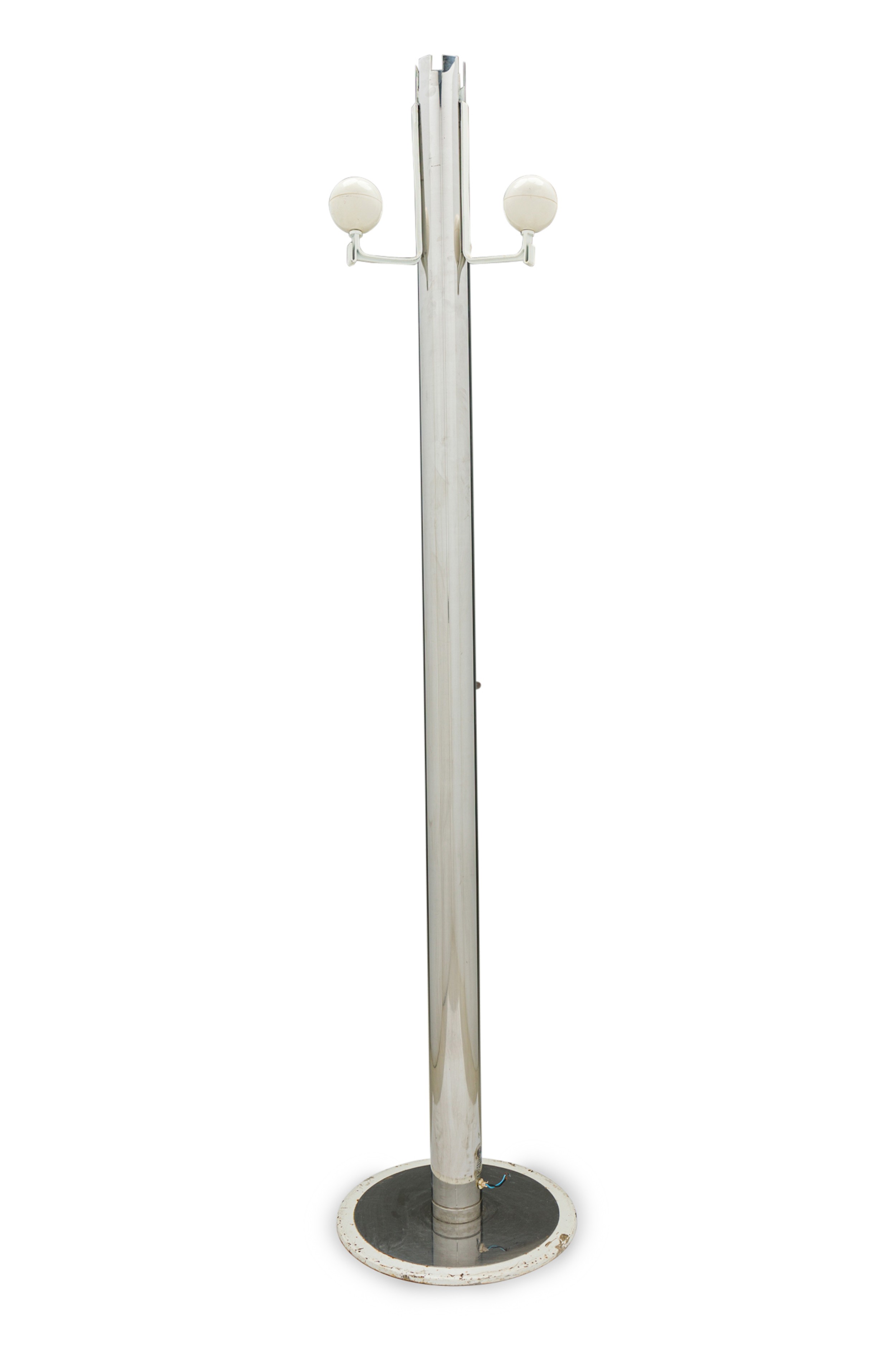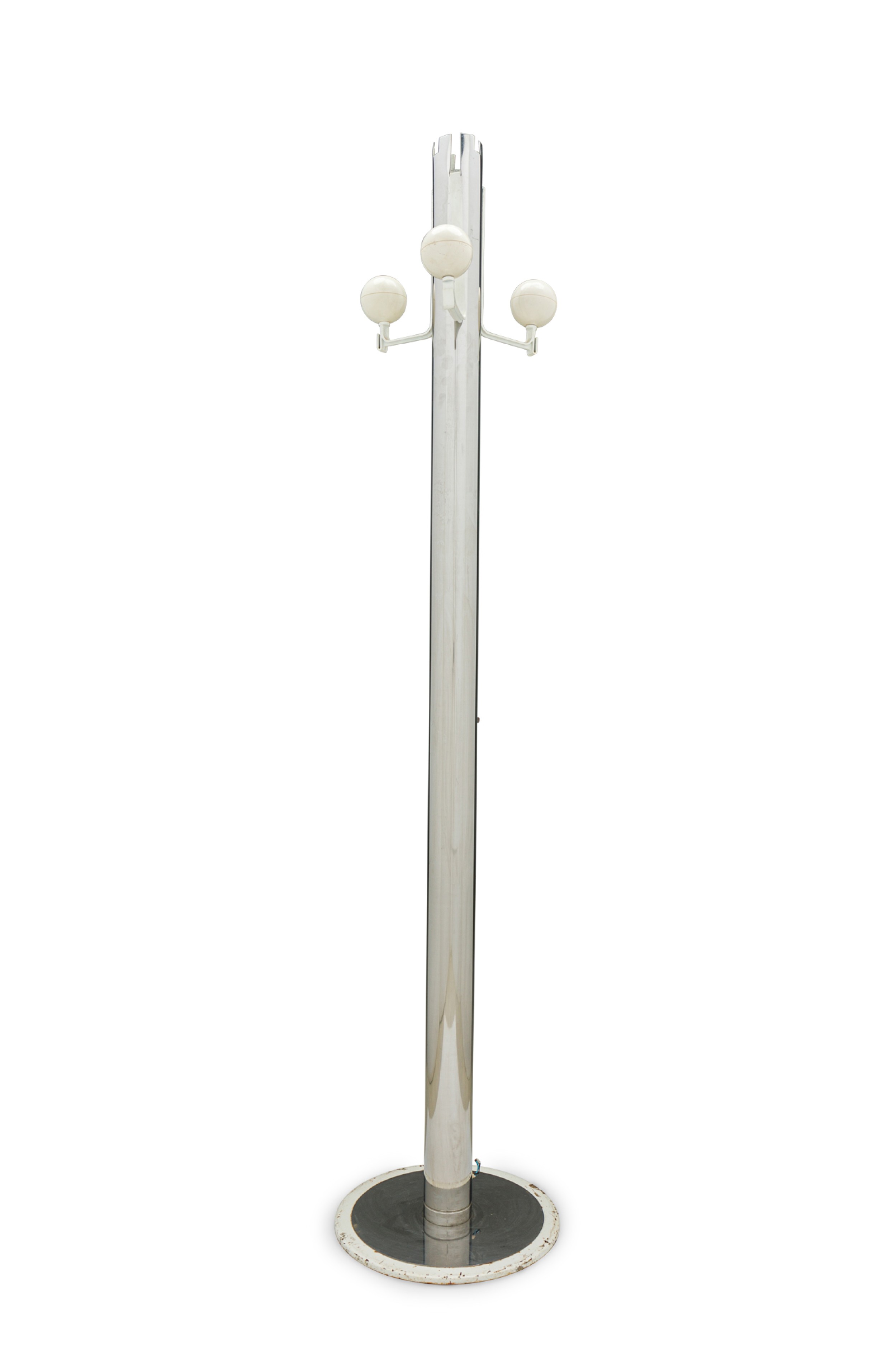 Italian Mid-Century Modern chrome plated coat rack with three bent arms tipped with off-white spheres, resting on a circular metal base. (OSVALDO BORSANI)