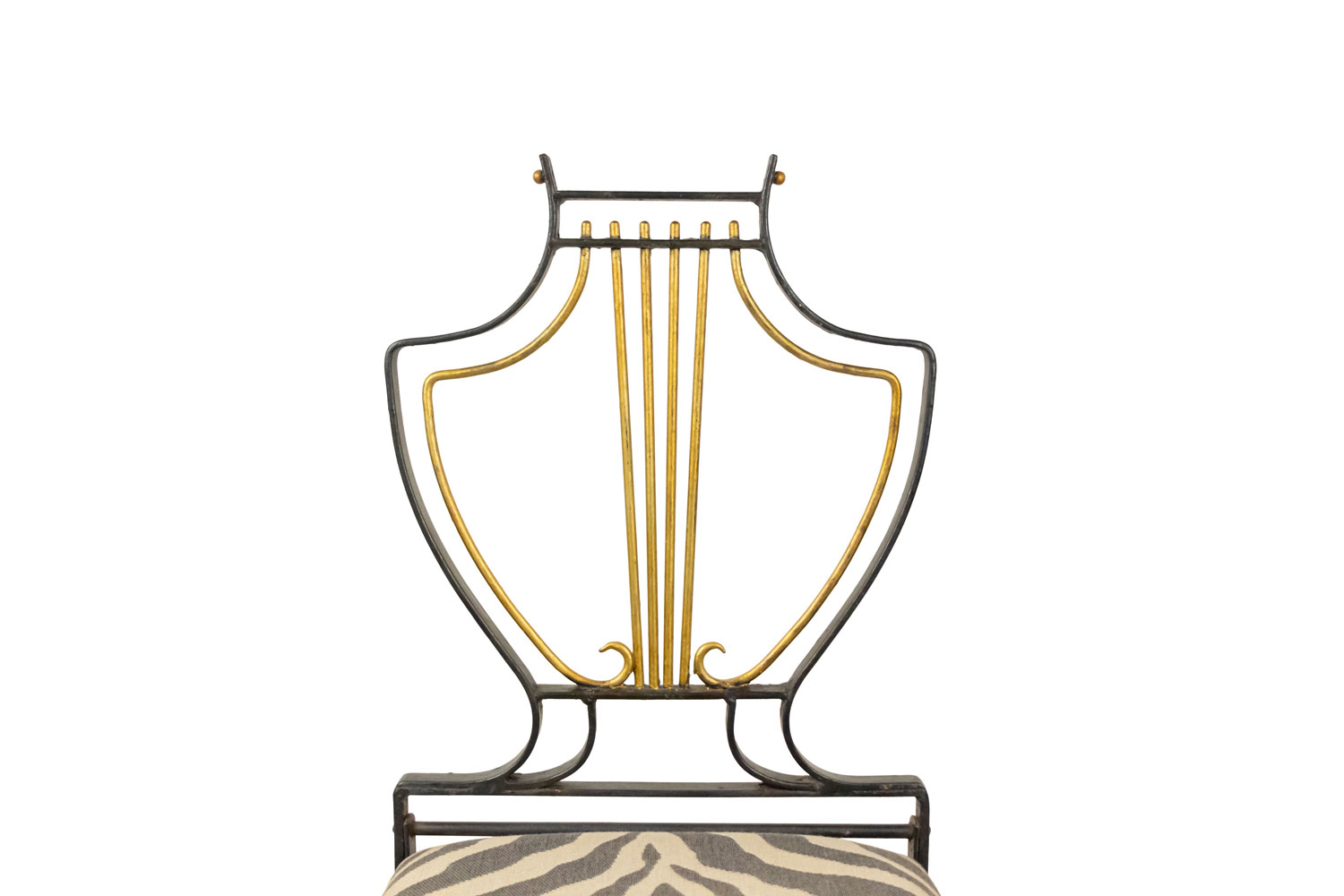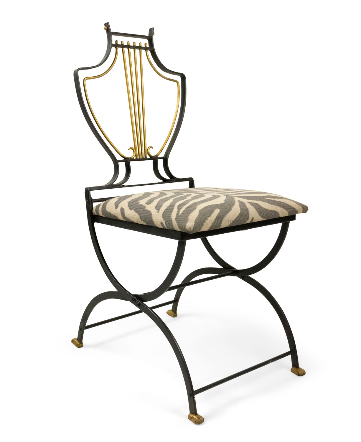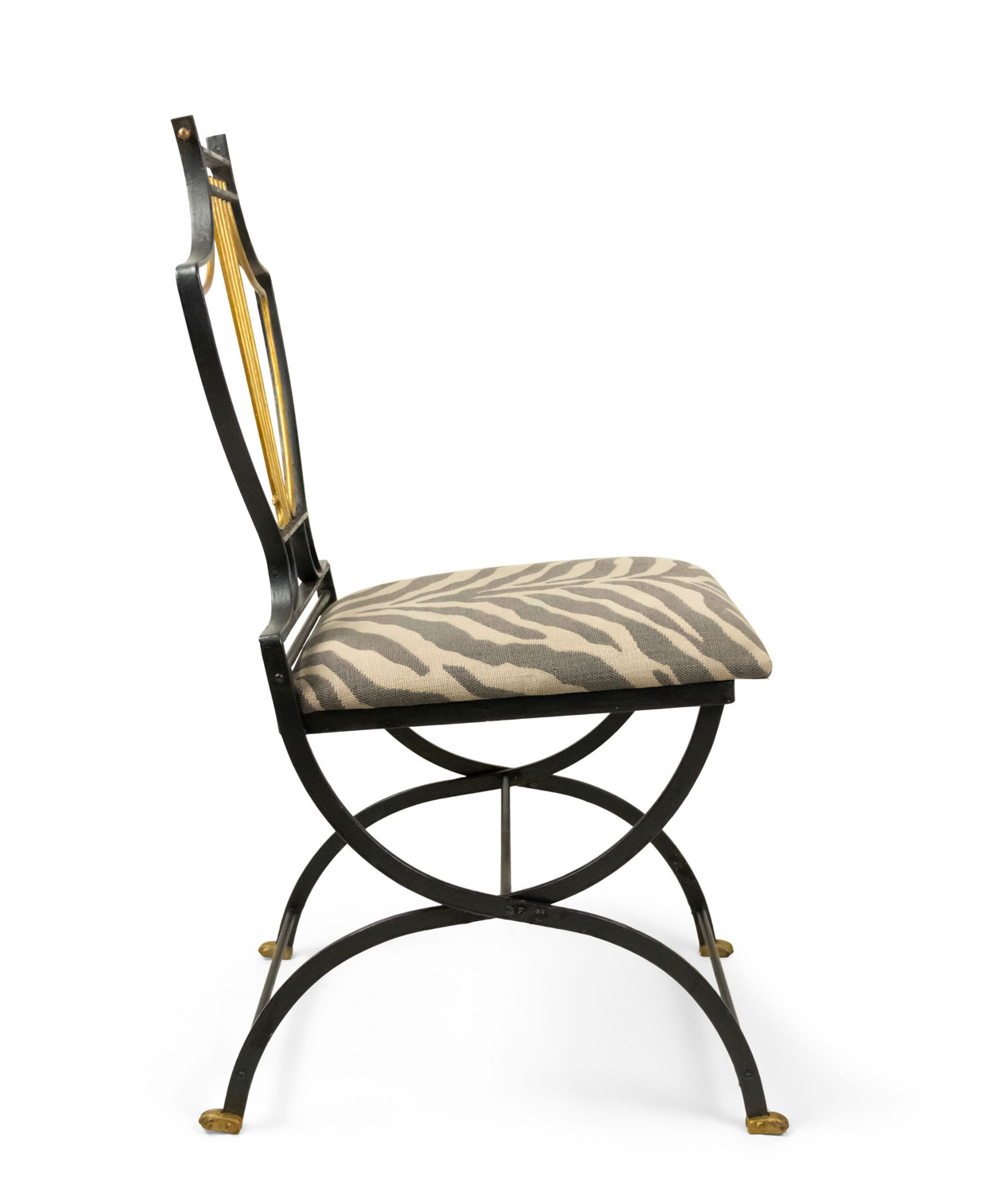 SET of 4 Outdoor American Art Moderne black and gold trim painted metal side chairs with lyre form backs and upholstered seat