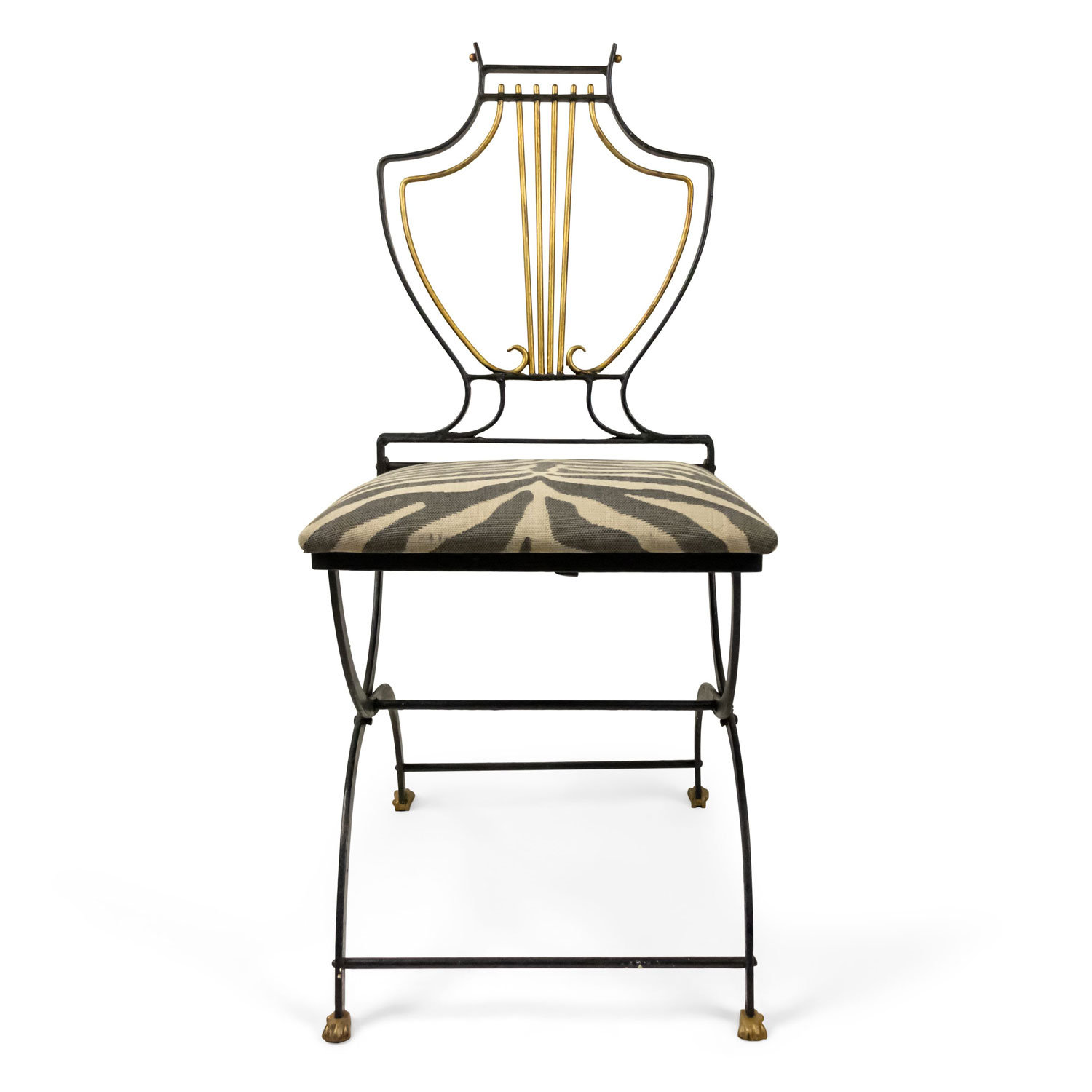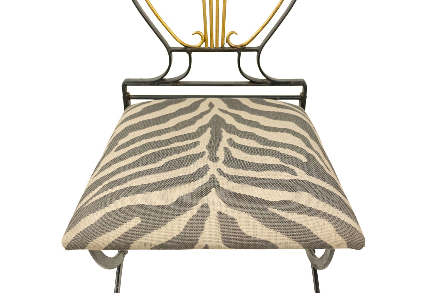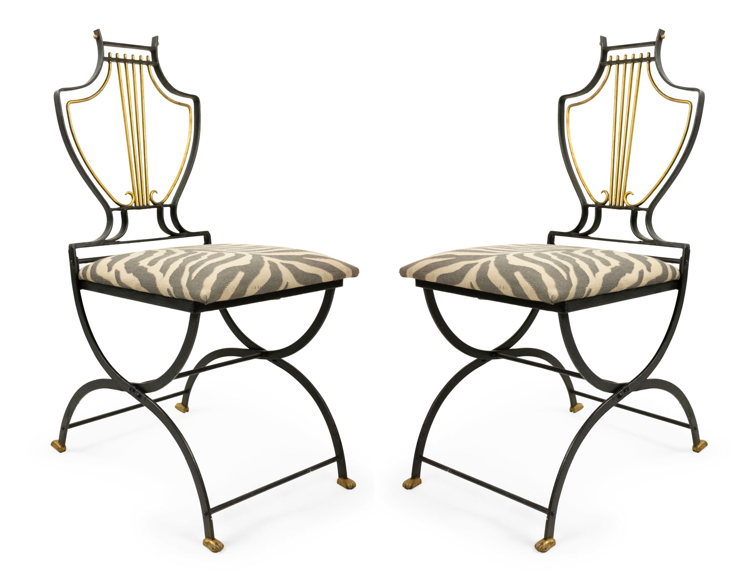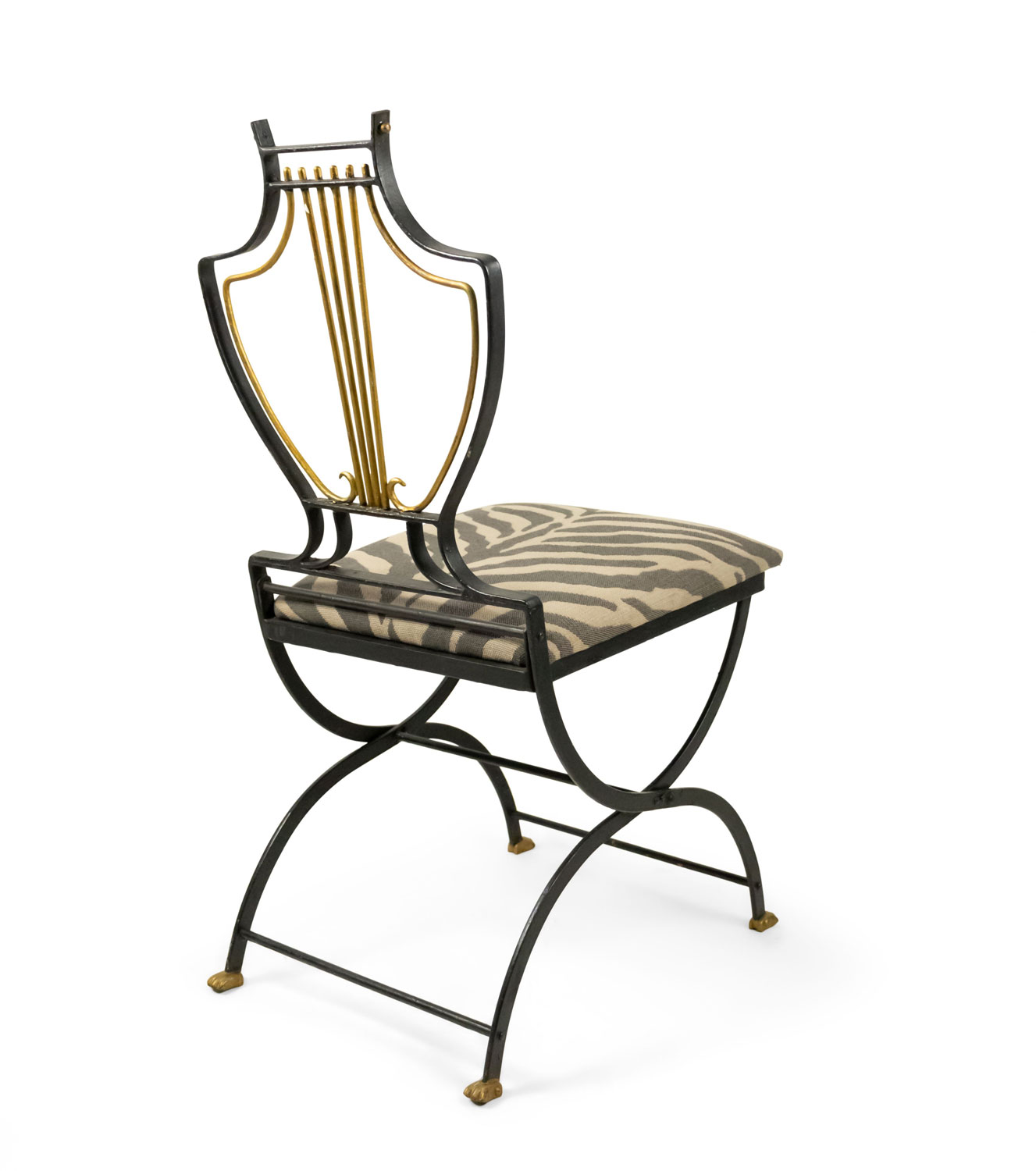 SET of 4 Outdoor American Art Moderne black and gold trim painted metal side chairs with lyre form backs and upholstered seat