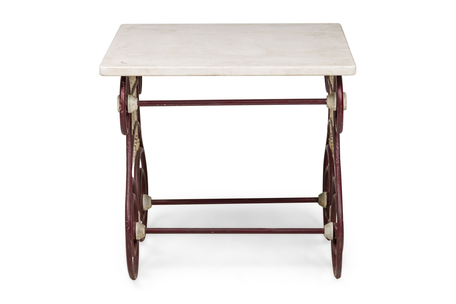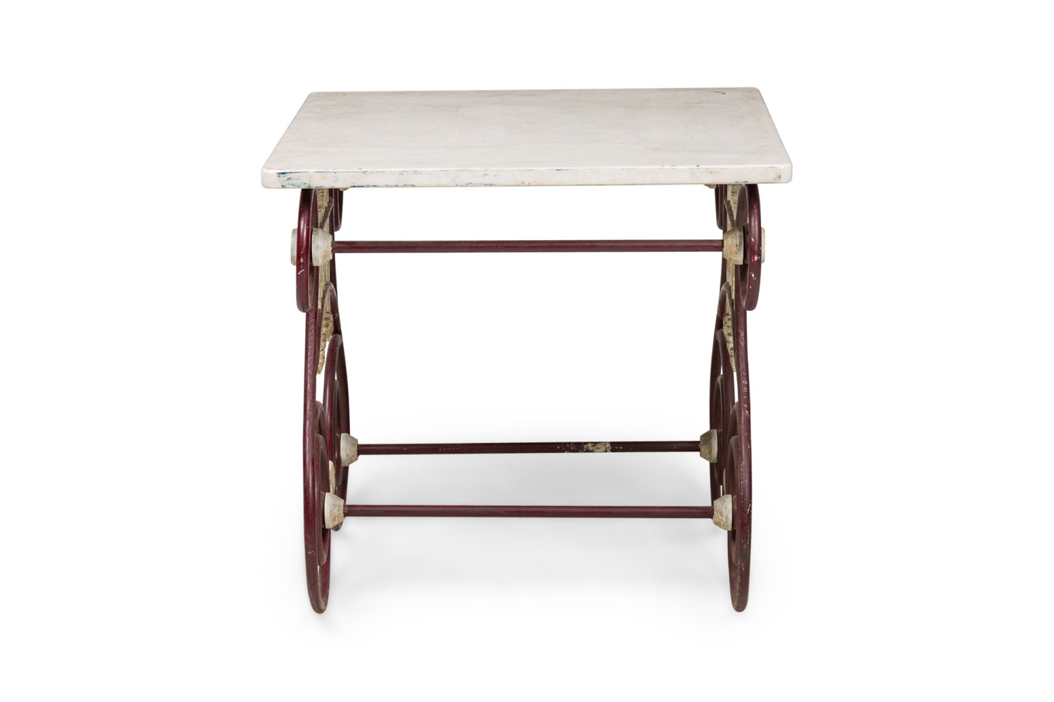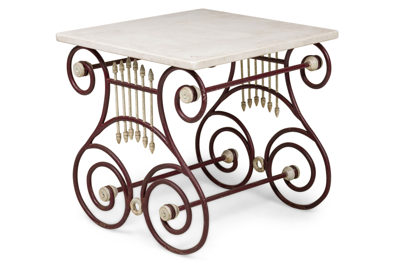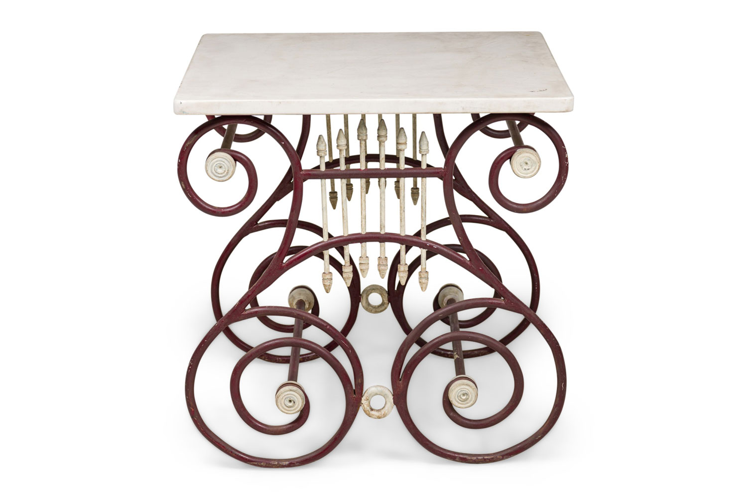 Outdoor Continental French Victorian painted iron butchers table with lyre design and white marble top