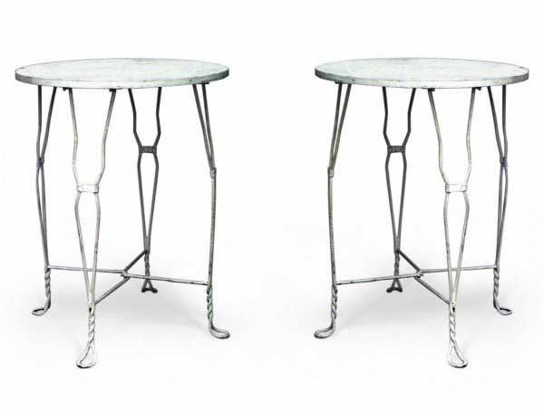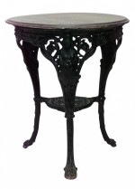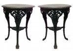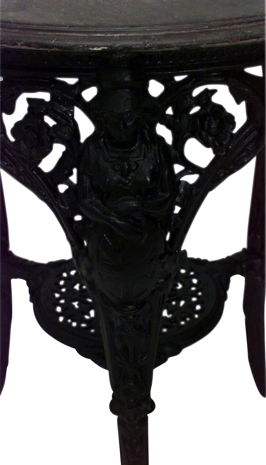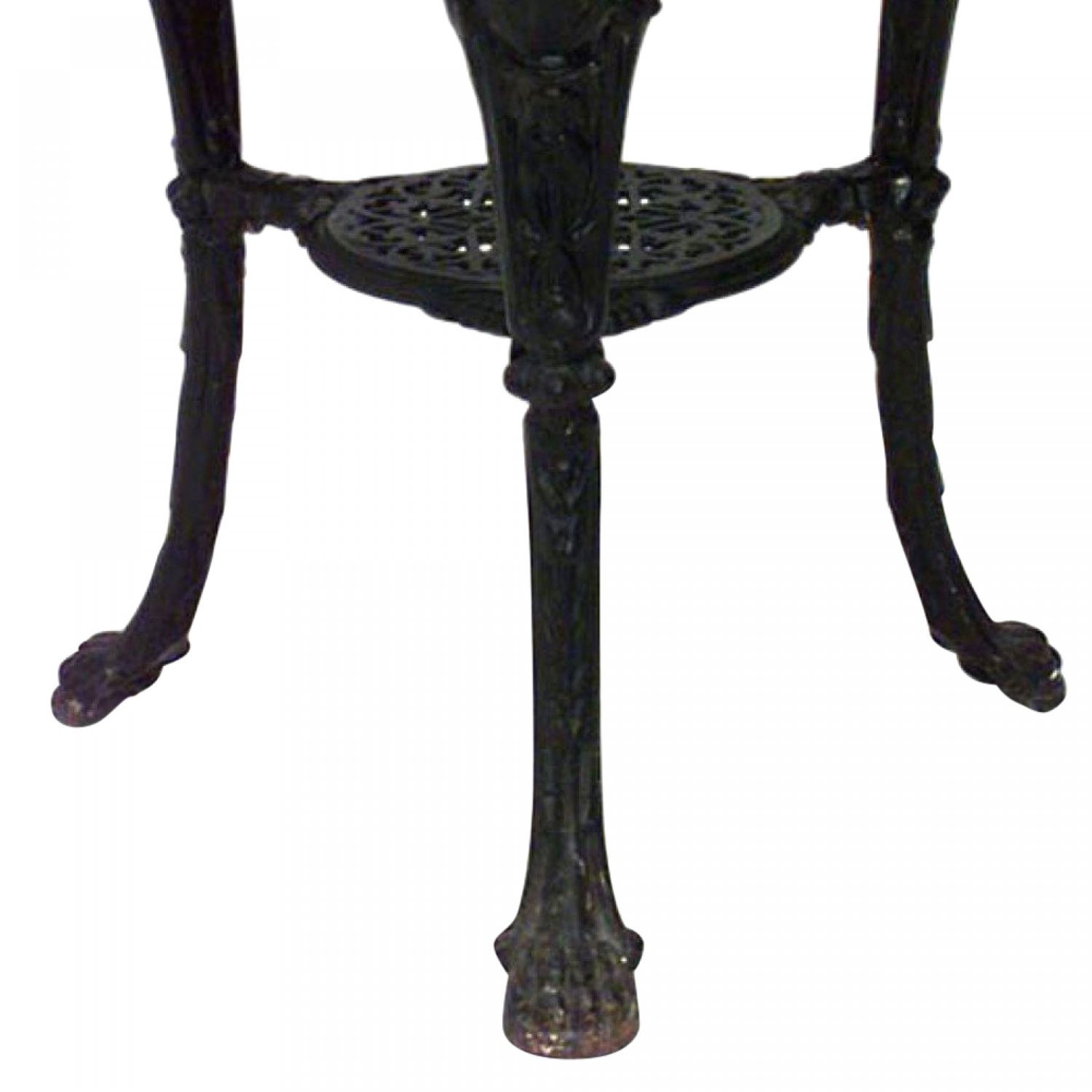 3 Outdoor English Victorian painted iron 3 legged pub tables with round wood top and filigree shelf and apron. (PRICED EACH)