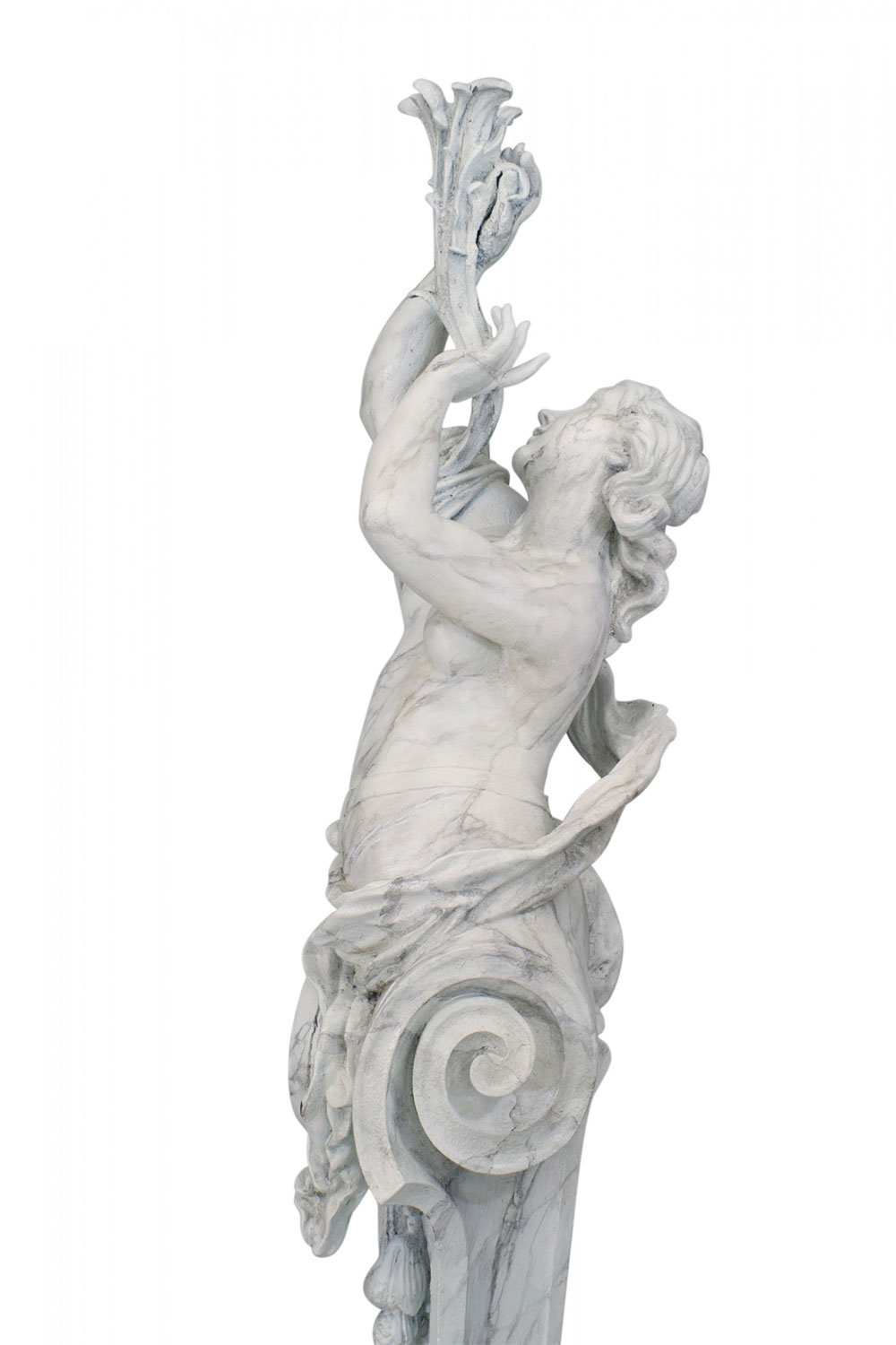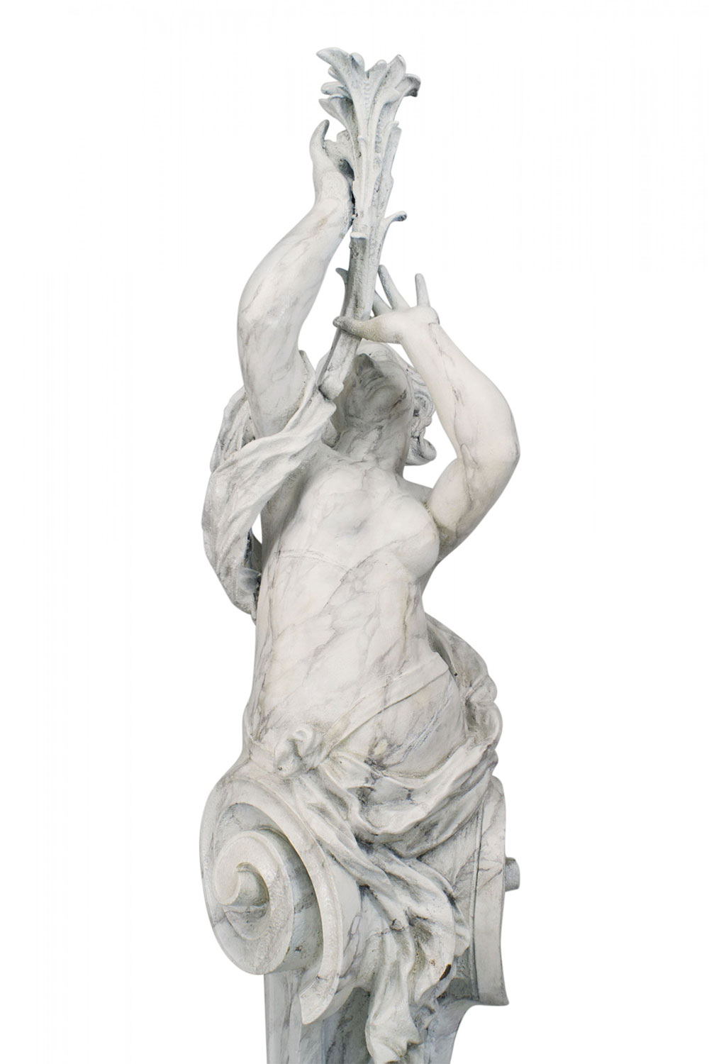 PAIR of Outdoor faux marble painted iron classic life size female figures on scroll base holding cornucopia (19/20th Cent) (attr. Val D'Osne).