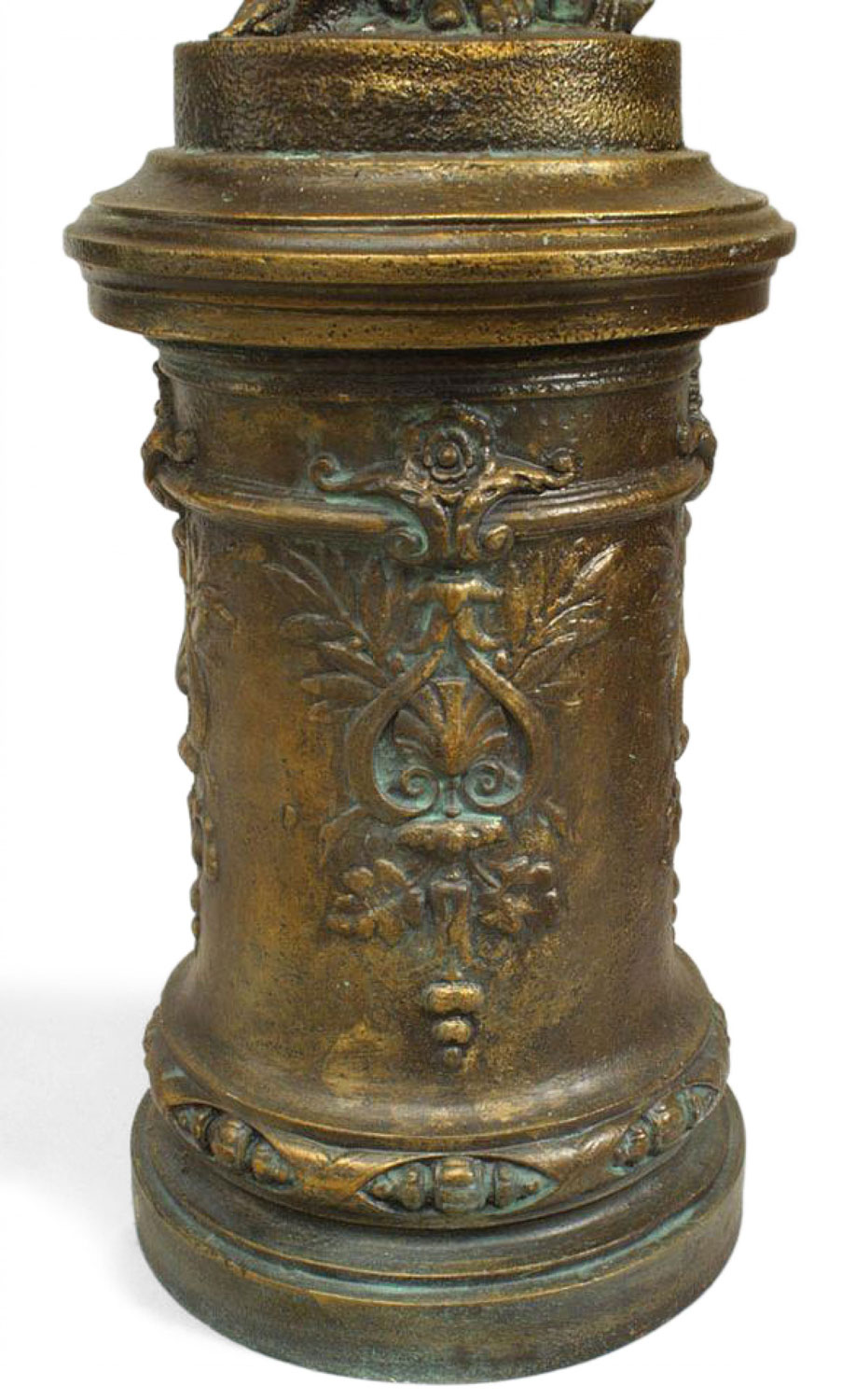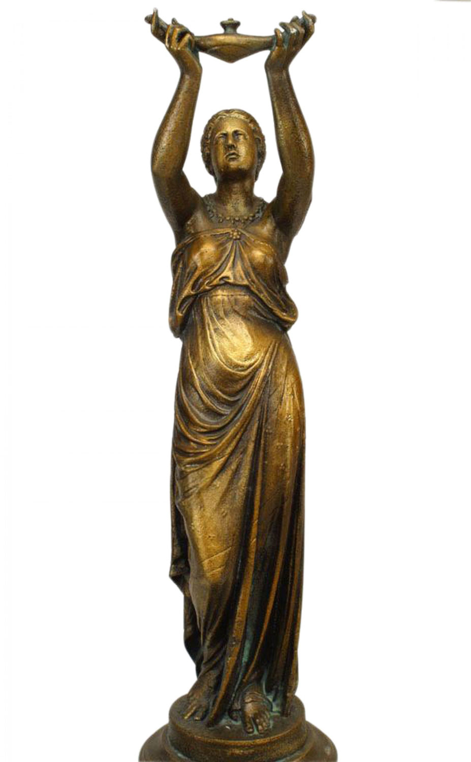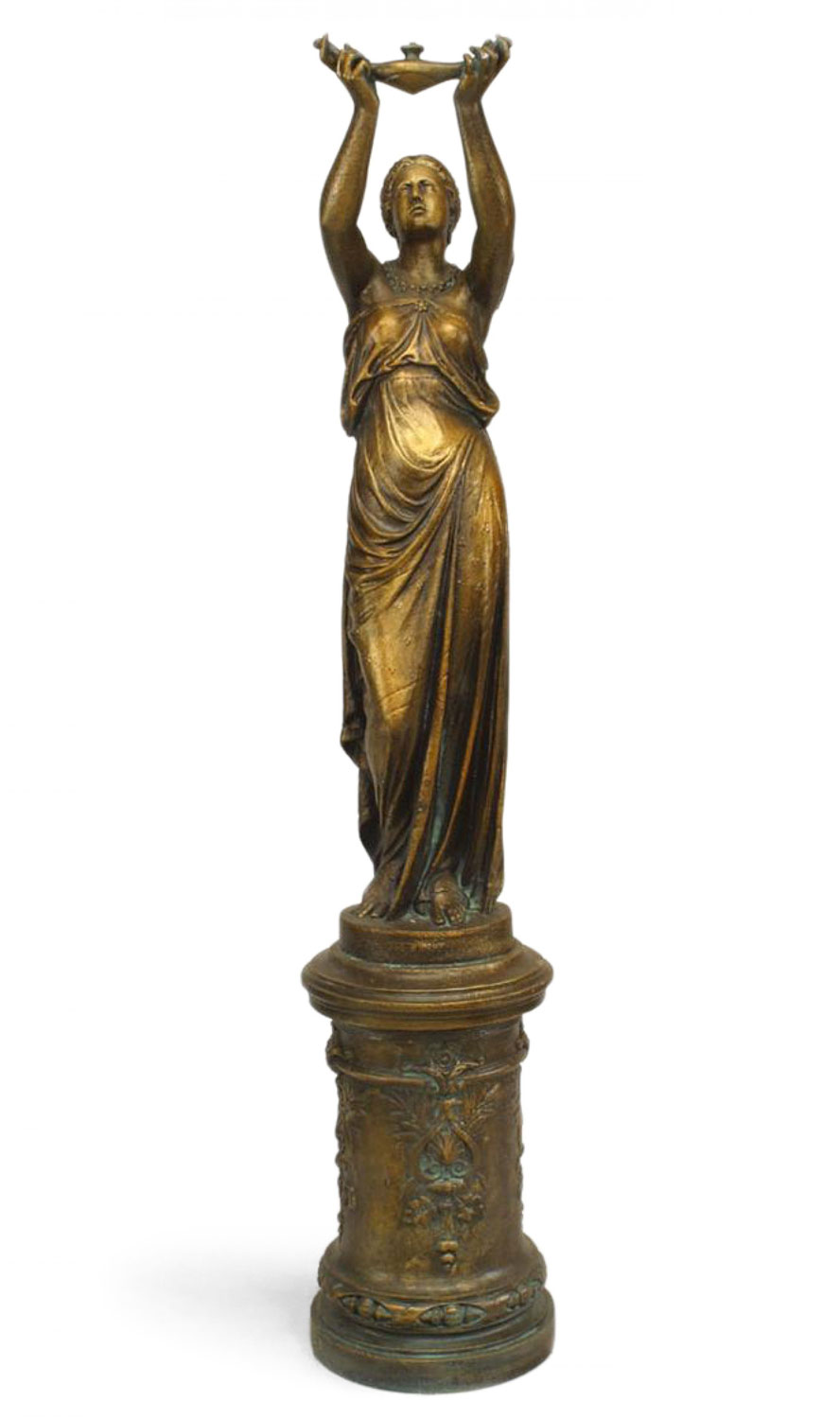 PAIR of Outdoor (late 19th Century) painted iron life size classical form female figures holding a small Aladdin lamp above their heads and standing on round pedestal bases. (attr. Val D'Osne) (PRICED AS PAIR).