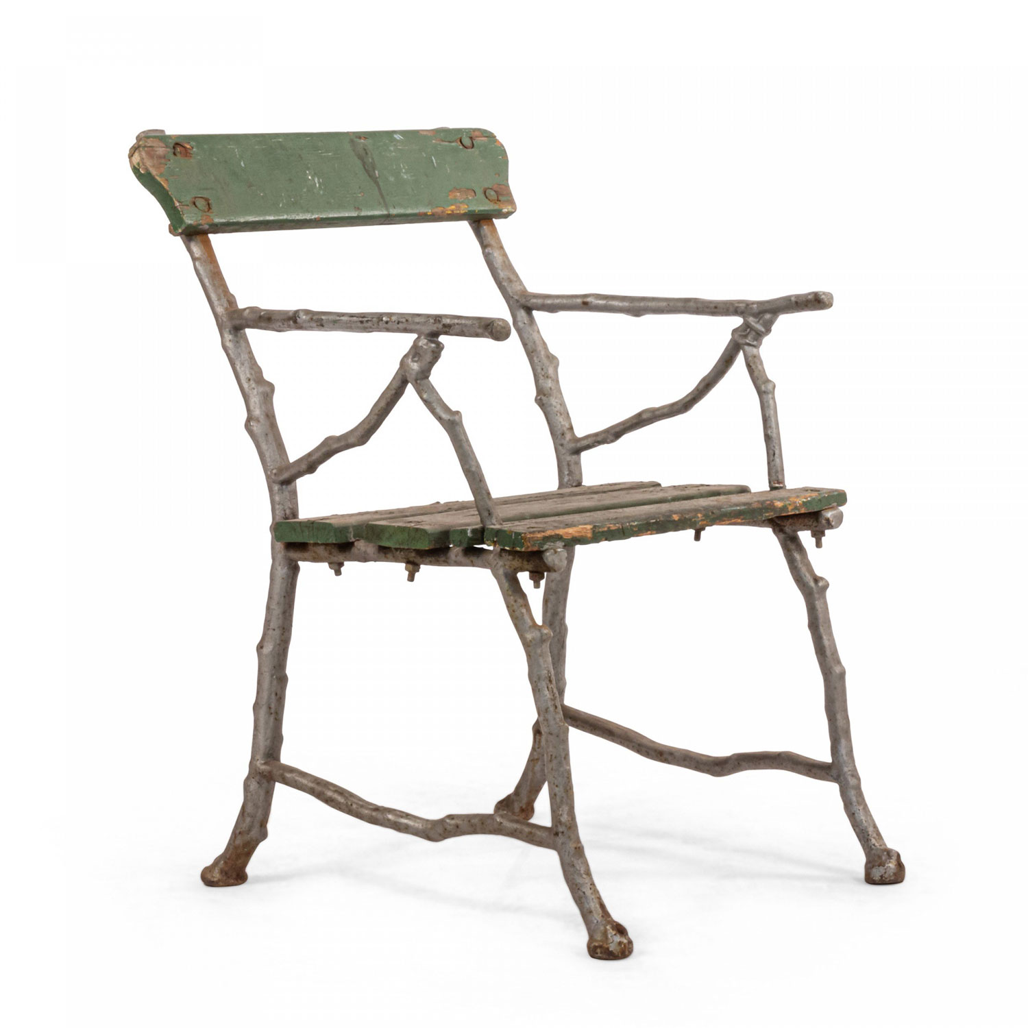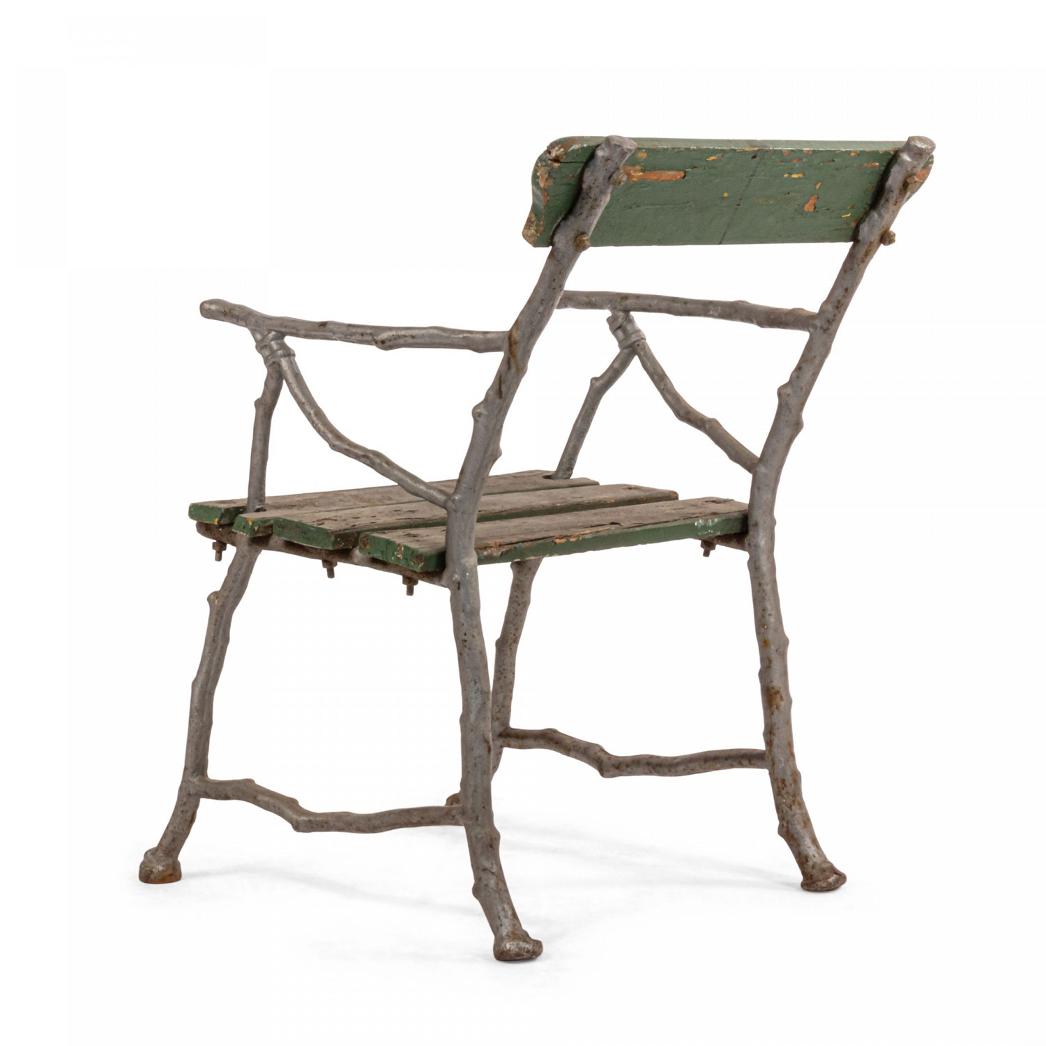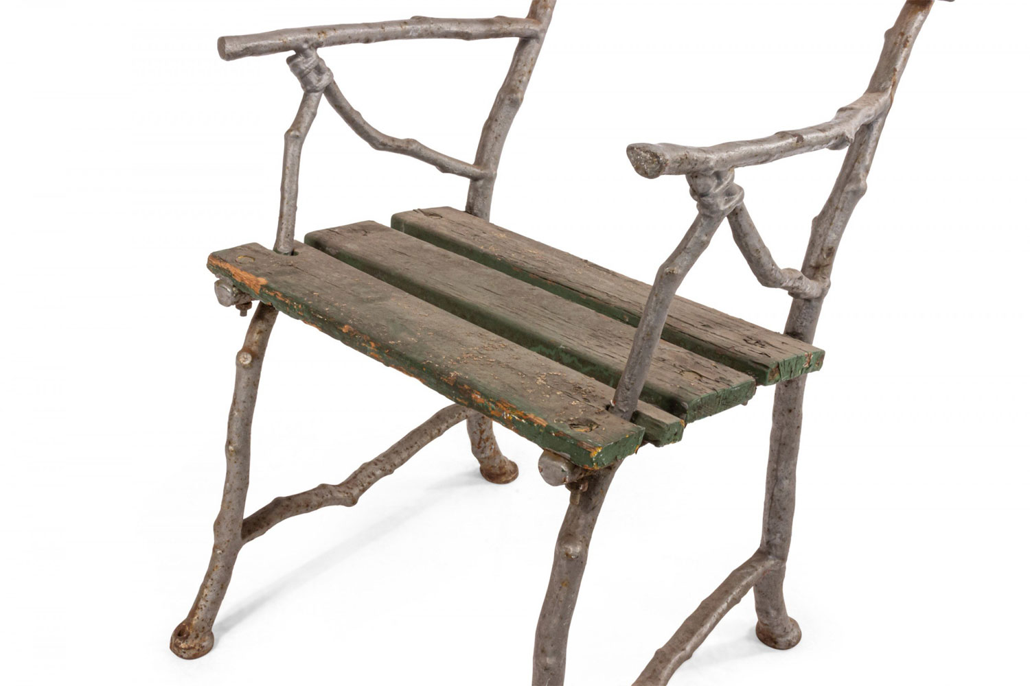 Outdoor English Victorian painted iron arm chair with faux twig design and painted slat seat and back..