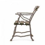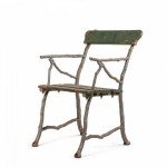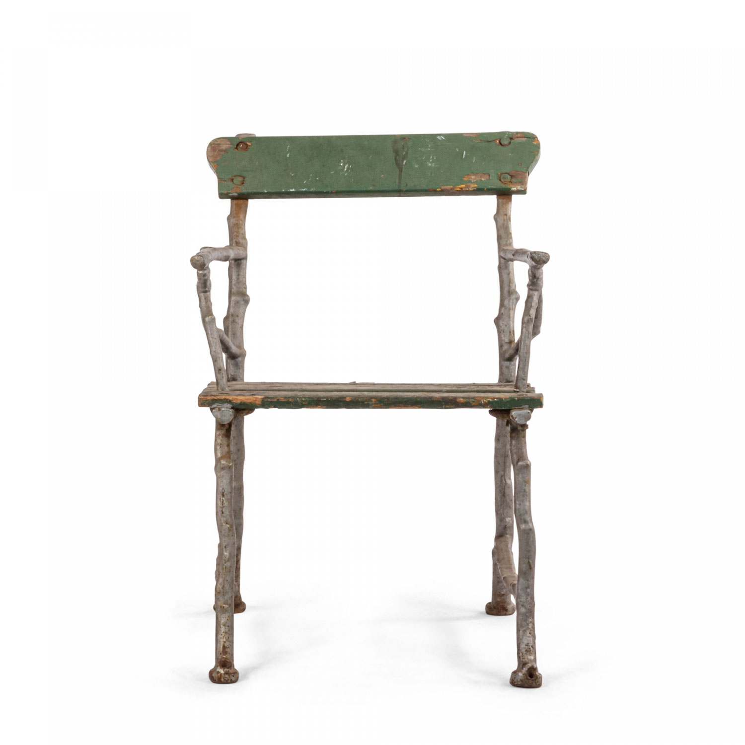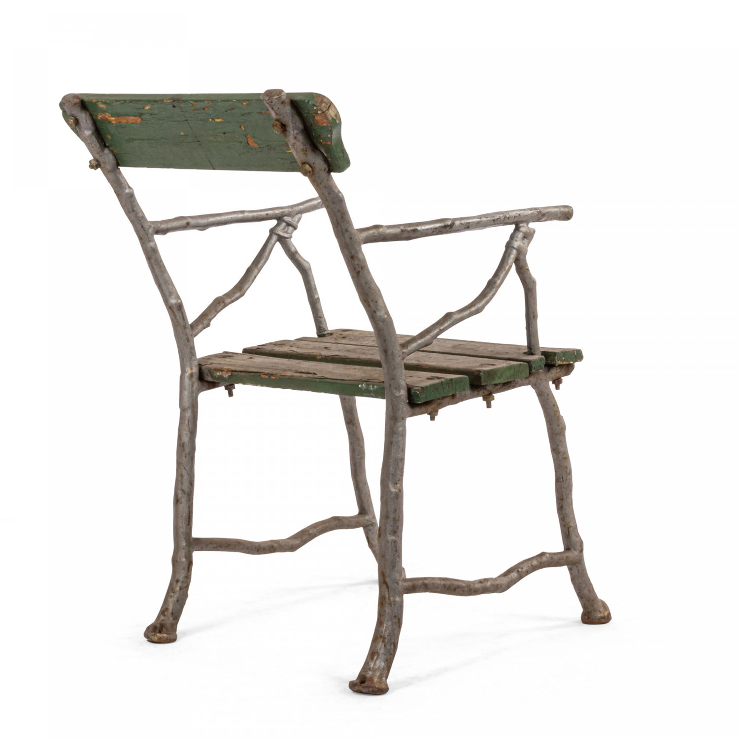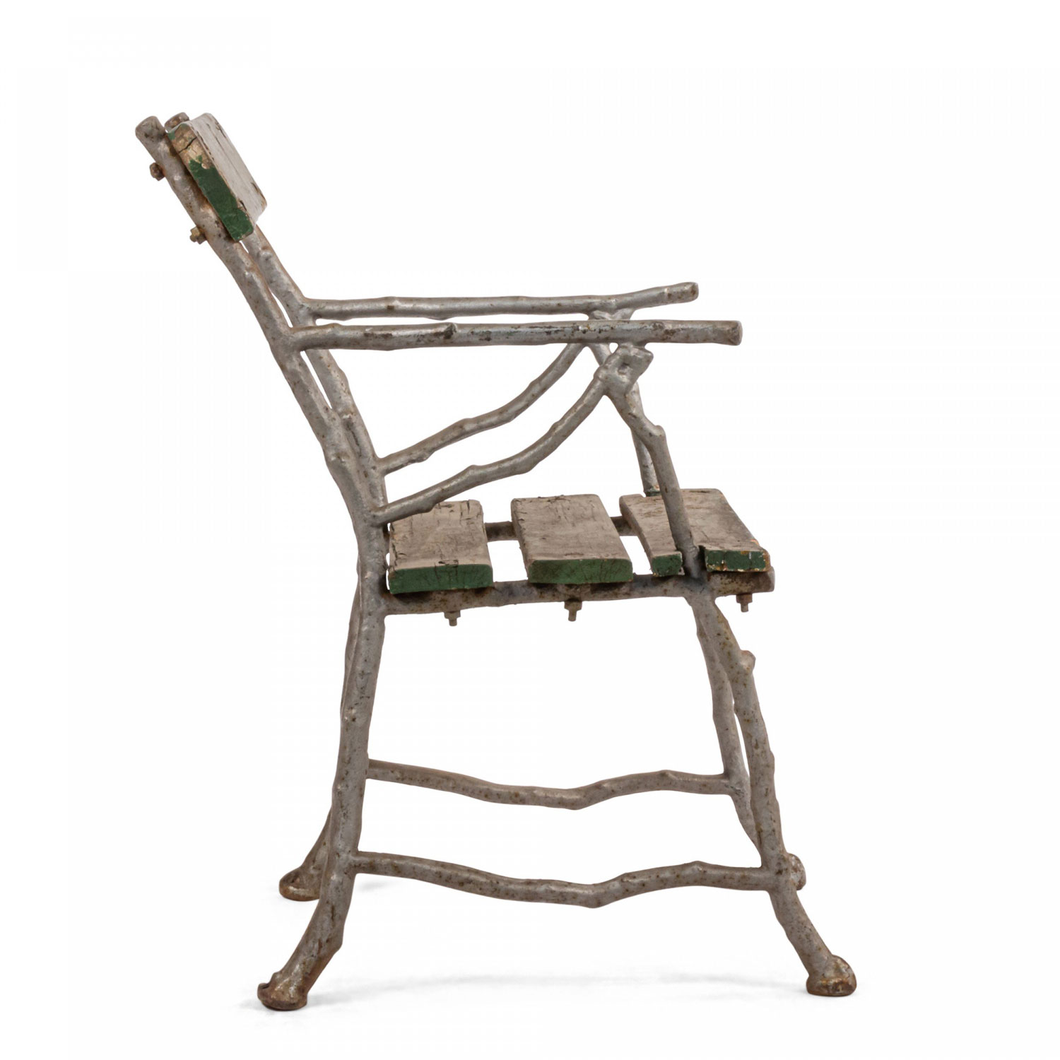 Outdoor English Victorian painted iron arm chair with faux twig design and painted slat seat and back..