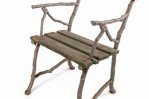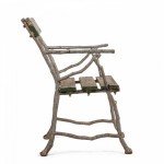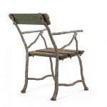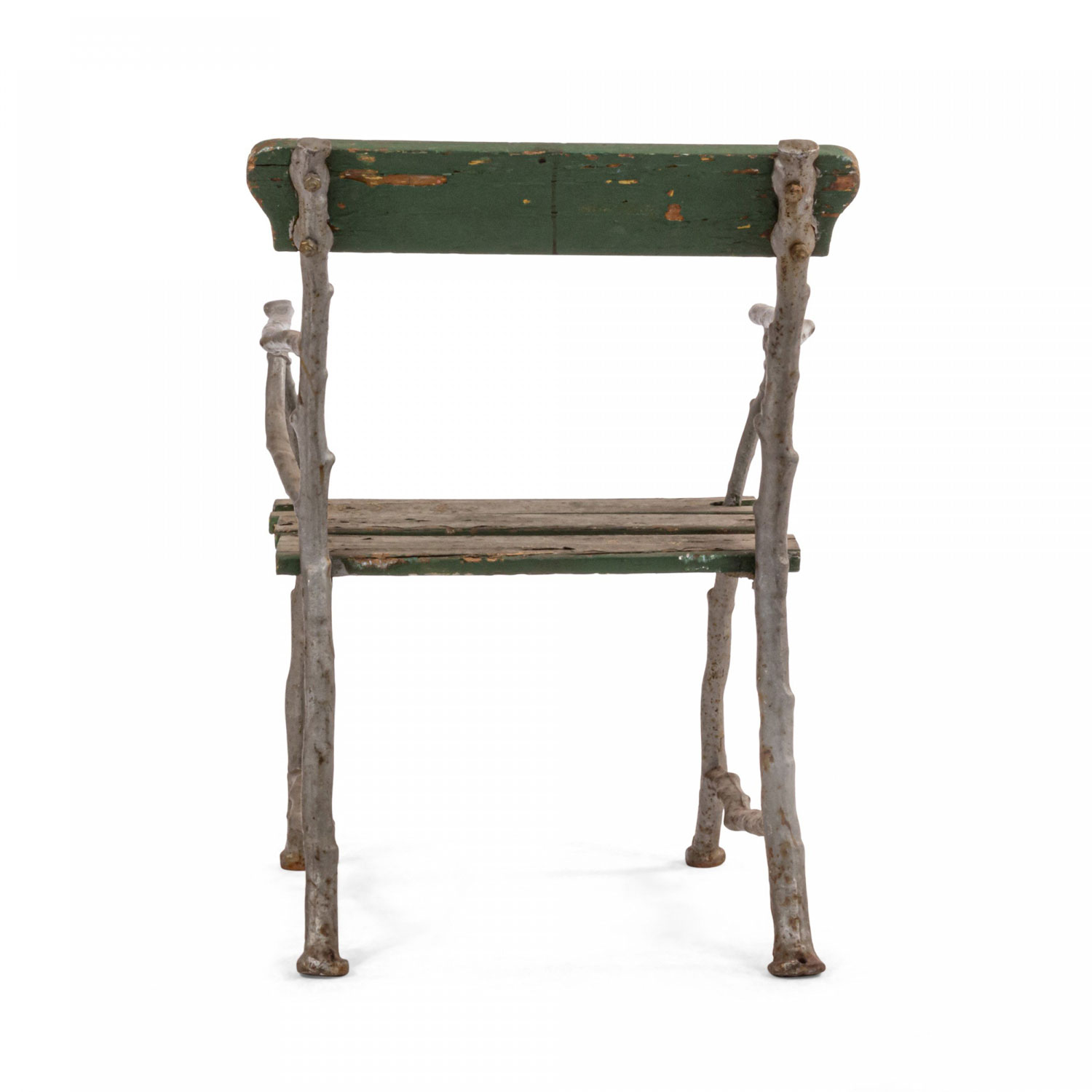 Outdoor English Victorian painted iron arm chair with faux twig design and painted slat seat and back.