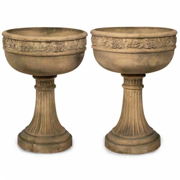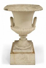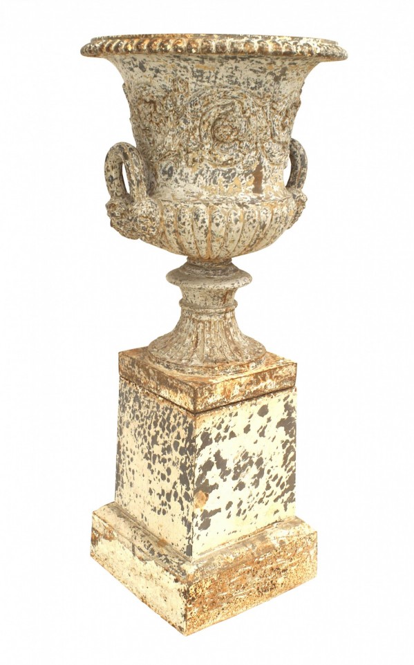 Outdoor Victorian style iron urn on base with handles (20th Cent.)